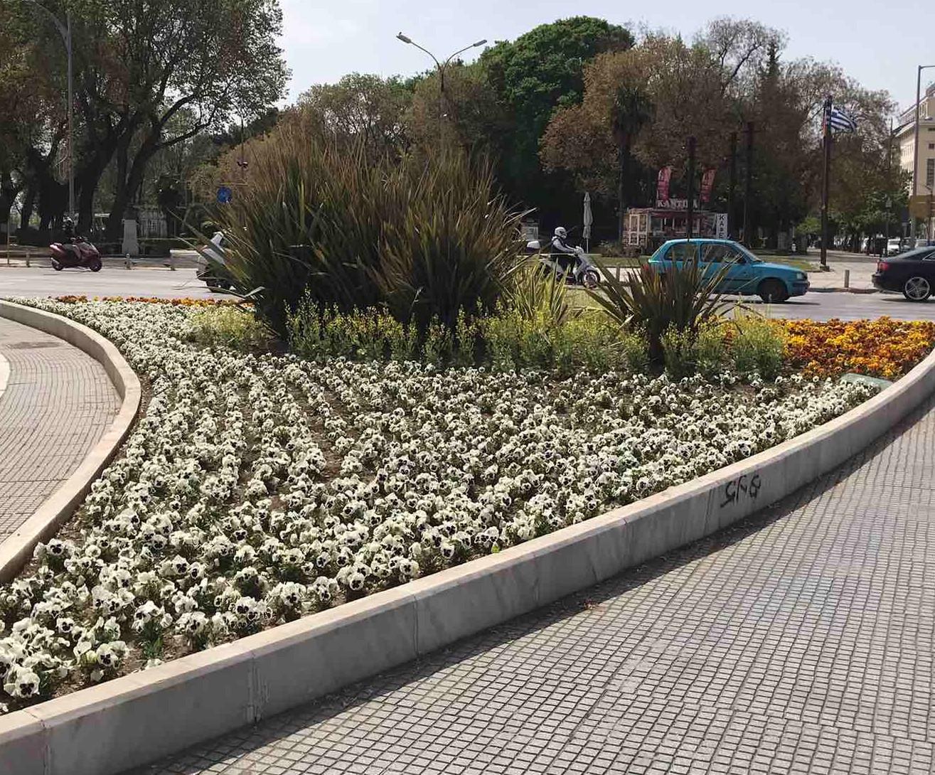 Εν όψει Πάσχα, πανσέδες, πετούνιες, κατιφέδες και άλλα εποχιακά και καλλωπιστικά φυτά σε διάφορους χρωματισμούς στολίζουν κεντρικές νησίδες και παρτέρια, δημιουργώντας μια ξεχωριστή ανοιξιάτικη ατμόσφαιρα.