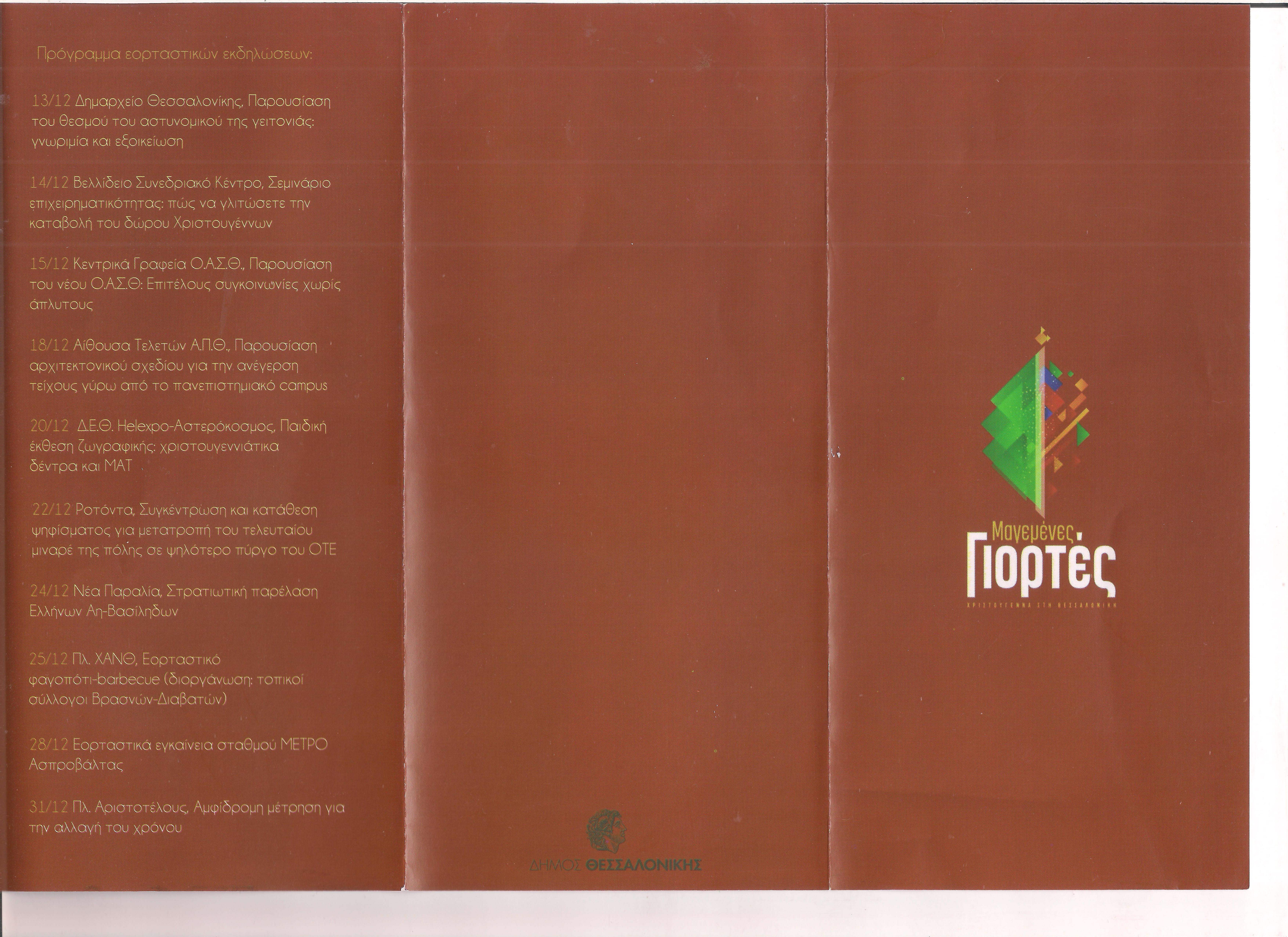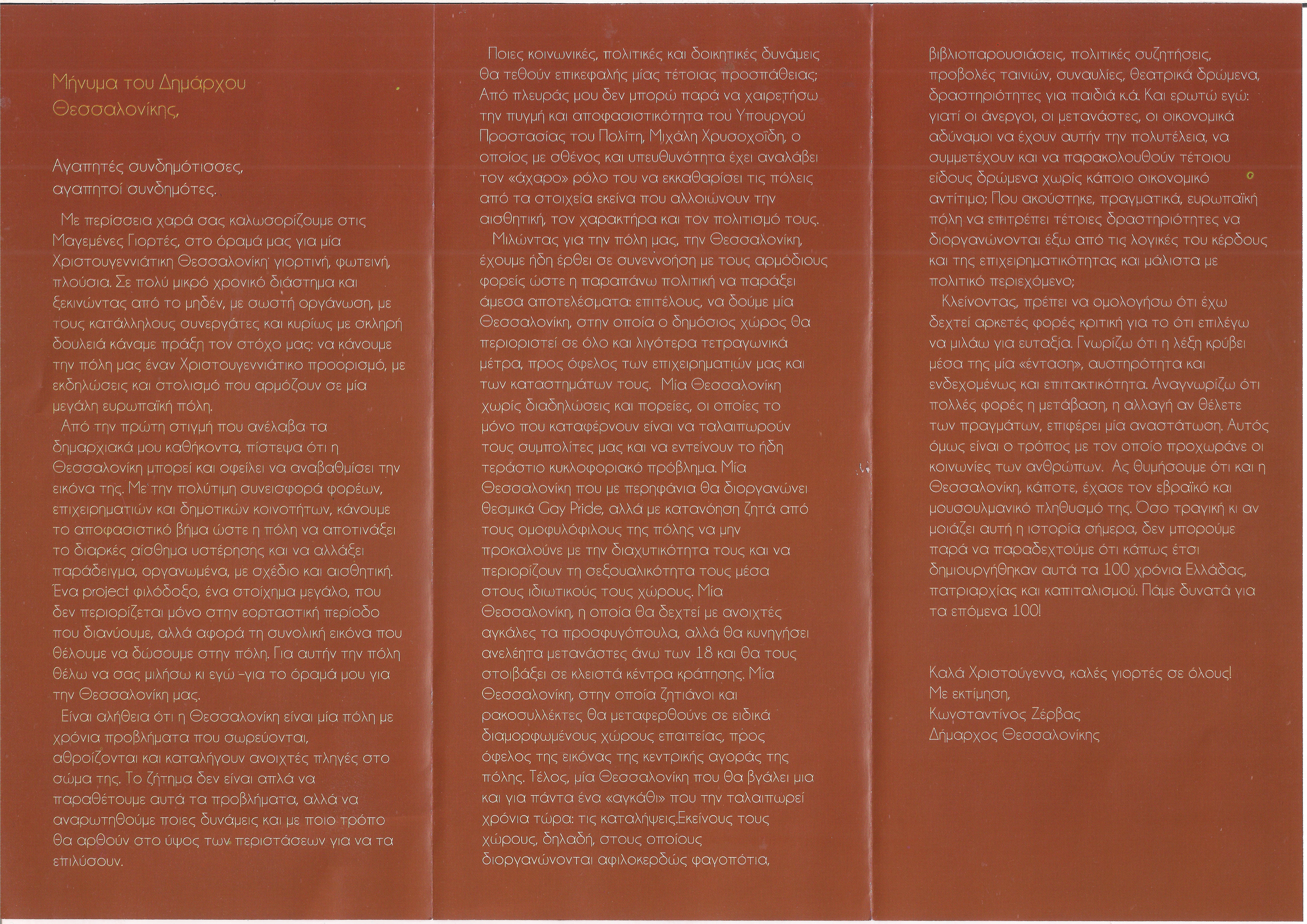 Τις ημέρες των γιορτών διακινήθηκε στο κέντρο της πόλης ένα φυλλάδιο που φαινομενικά μετέφερε μήνυμα του Δημάρχου Θεσσαλονίκης Κωνσταντίνου Ζέρβα. Οι συγγραφείς του, κάνοντας χρήση του λογοτύπου των «Μαγεμένων Γιορτών» και του Δήμου Θεσσαλονίκης, επιχειρούν να παραπλανήσουν τον αναγνώστη και να παρουσιάσουν μια εικόνα εντελώς ψευδή.