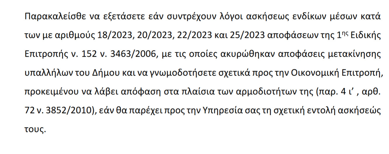 Οι 4 υπάλληλοι, όλες γυναίκες, μετά την απομάκρυνση από τις θέσεις τους, προσέφυγαν, όπως είχαν δικαίωμα, στην Αποκεντρωμένη Διοίκηση που ελέγχει τη νομιμότητα των αποφάσεων των ΟΤΑ, διότι θεώρησαν την μετακίνηση τους σε νέες υπηρεσιακές θέσεις ως υποβιβασμό και βλαπτική μεταβολή. Τελικά η απόφαση της Αποκεντρωμένης Διοίκησης τις δικαίωσε, καθώς είχαν προσφύγει στην ειδική επιτροπή του άρθρο 152 της Α. Δ., η οποία υποχρεώνει το δήμο Θεσσαλονίκης να ακυρώσει τις μετακινήσεις των υπαλλήλων και να τις επαναφέρει στις θέσεις τους.