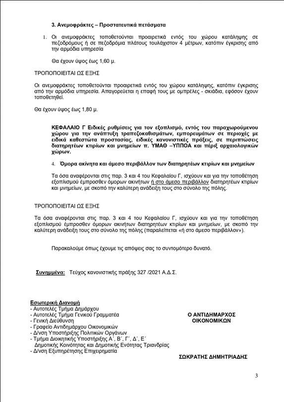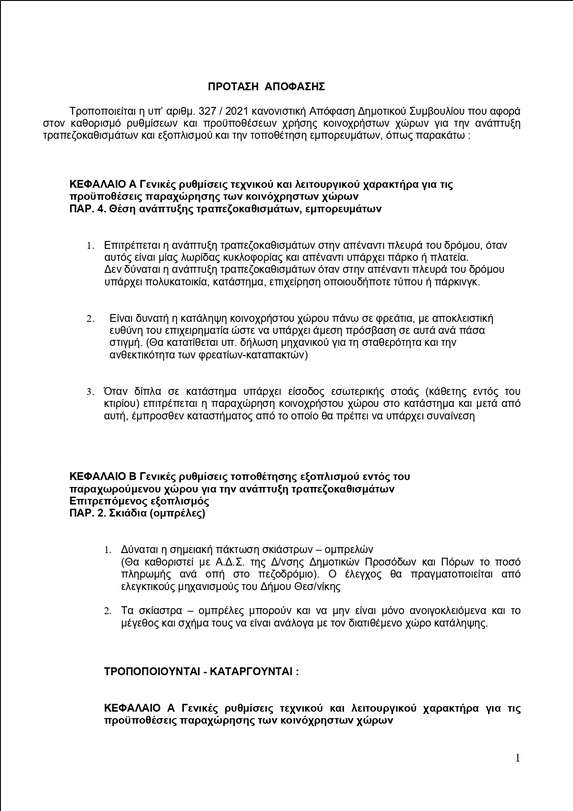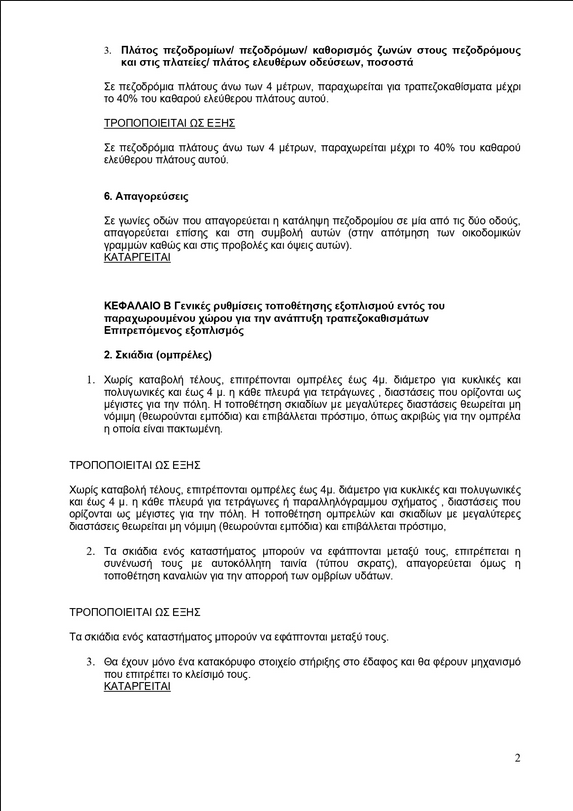 - Η τροποποίηση που επιτρέπει την ανάπτυξη τραπεζοκαθισμάτων στην απέναντι πλευρά του δρόμου, όταν αυτός είναι μίας λωρίδας κυκλοφορίας και απέναντι υπάρχει πάρκο ή πλατεία.