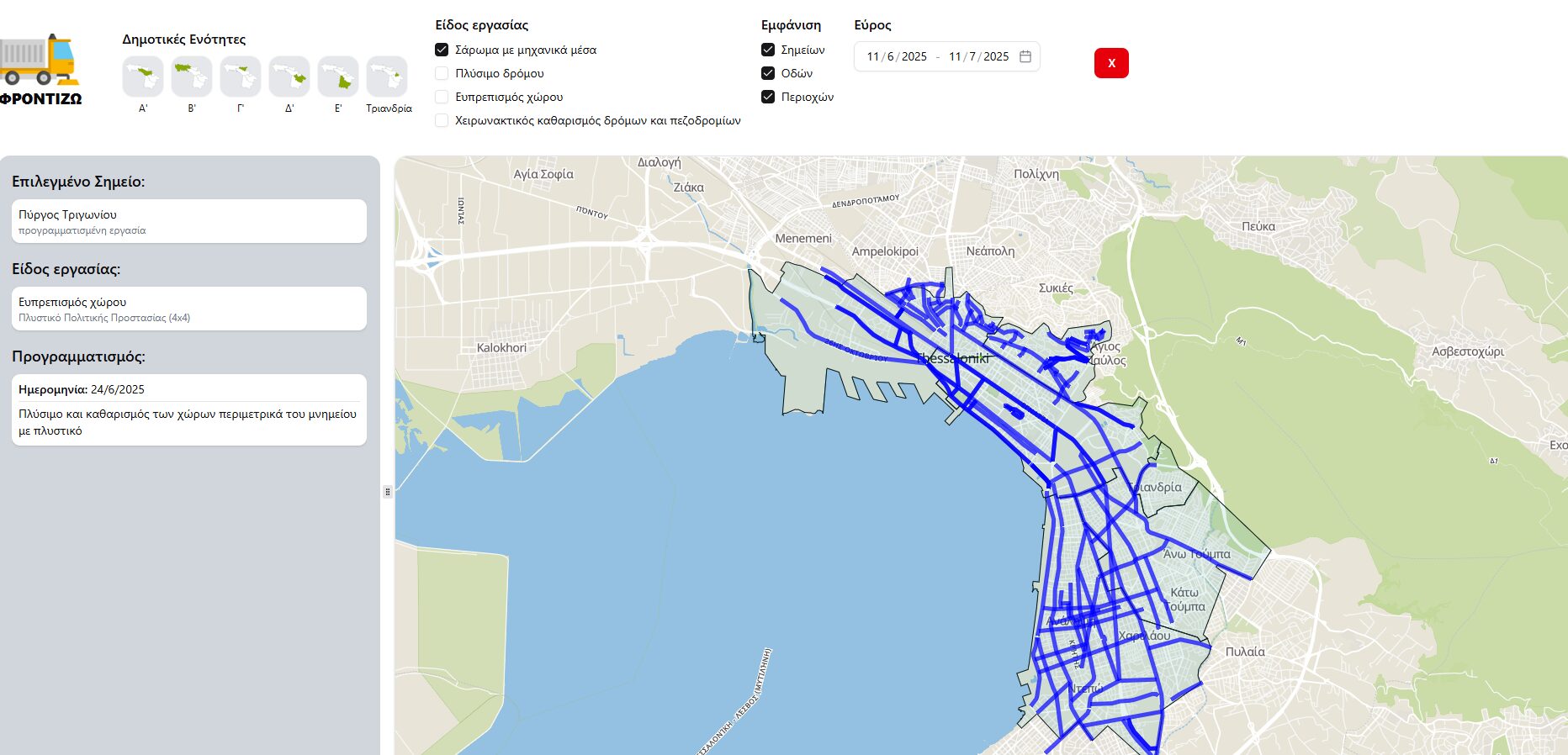 Ένα νέο εργαλείο ενημέρωσης έχουν πλέον στη διάθεσή τους οι κάτοικοι του Δήμου Θεσσαλονίκης. Πρόκειται για την ιστοσελίδα-ψηφιακό εργαλείο «Φροντίζω» (frontizo.thessaloniki.gr), στο οποίο είναι συγκεντρωμένες όλες οι προγραμματισμένες δράσεις καθαρισμού, σαρώματος, πλυσίματος δρόμων, περιποίησης πρασίνου, απομάκρυνσης ογκωδών και πολλά ακόμη.