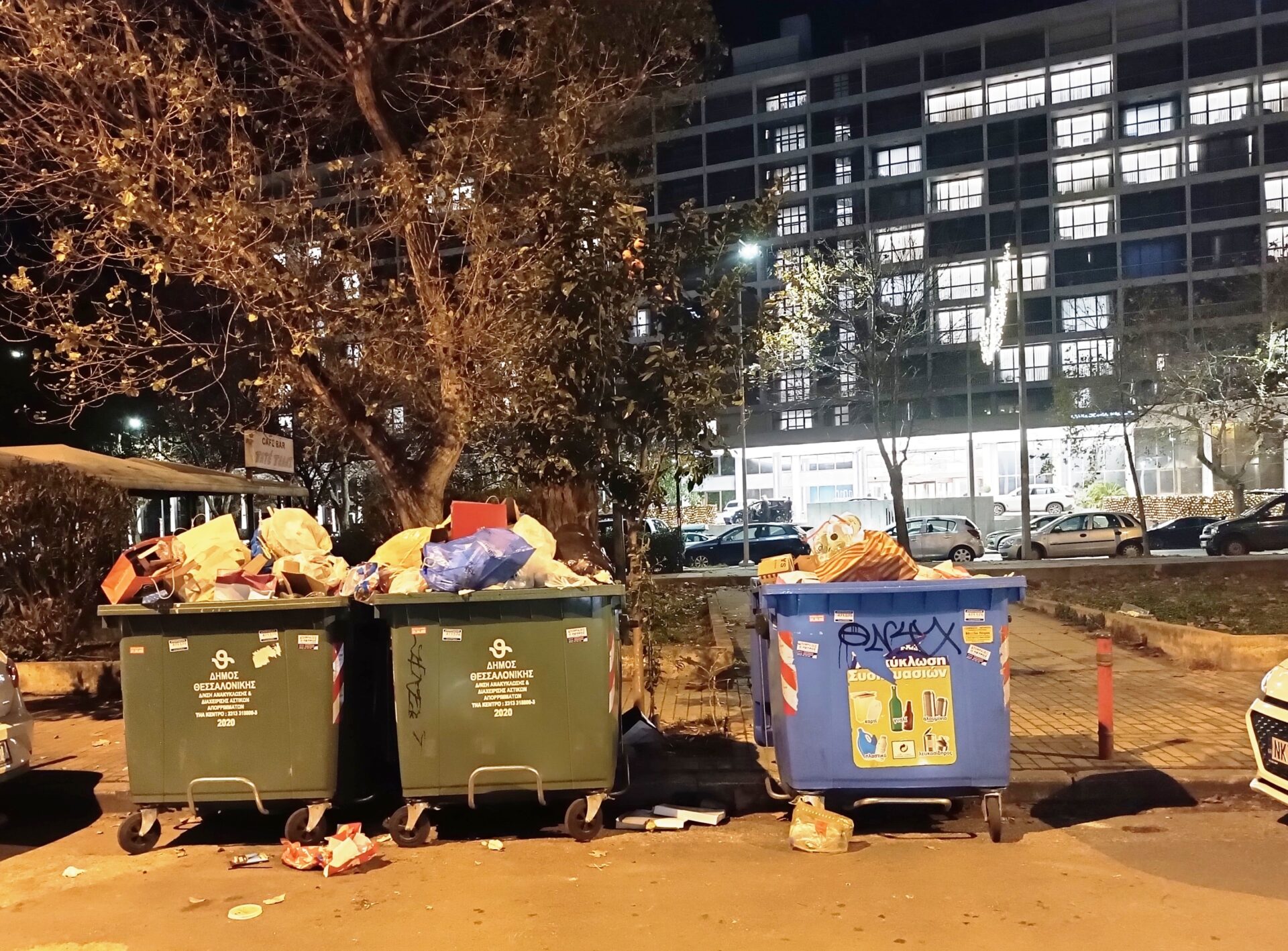 Ανάλογη είναι η εικόνα στους κάδους απορριμμάτων σε πολλά σημεία της πόλης σήμερα, που σημαίνει ότι η αποκομιδή δεν άργησε μία μέρα, αλλά πολλές. Οι παρακάτω φωτογραφίες είναι σημερινές κυρίως από την Ανατολική Θεσσαλονίκη. Είναι σαφές τι μας εύχεται ο δήμος Θεσσαλονίκης που έχει την ευθύνη για την αποκομιδή των απορριμμάτων. Ευχόμαστε του χρόνου να αλλάξουν τα πράγματα στην πόλη και να δούμε πιο καθαρές μέρες και νύχτες…