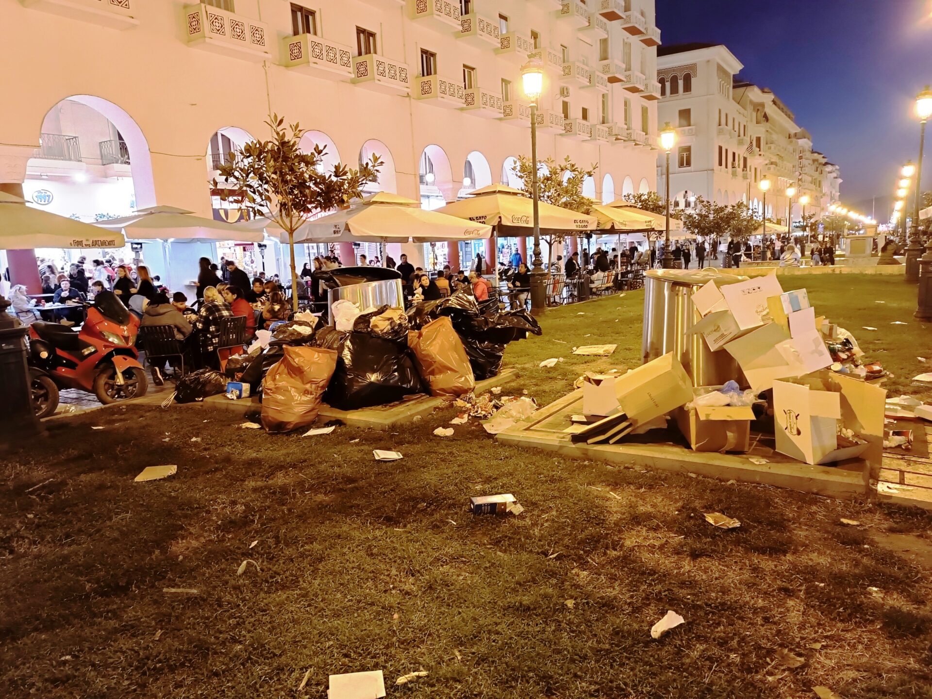 Ανήμερα τα Χριστούγεννα, ακριβώς απέναντι από το Makedonia Palace, ένα από τα πιο κεντρικά ξενοδοχεία της πόλης, οι κάδοι επίσης γεμάτοι και ξέχειλοι. «Δεν είναι πρωτοφανές, αυτό συμβαίνει τακτικά τελευταία» σχολίασε ένας κάτοικος της περιοχής. Πίσω από τους ξέχειλους κάδους των σκουπιδιών, λάμπει η είσοδος τους μεγάλου ξενοδοχείου.