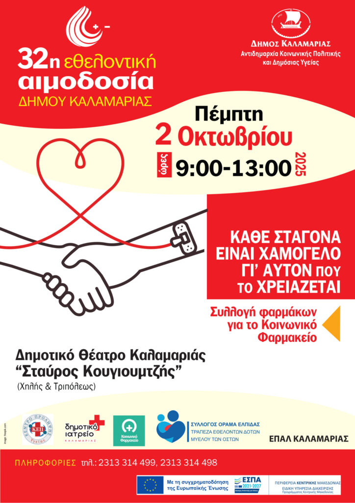 «Κάθε σταγόνα είναι χαμόγελο γι’ αυτόν που το χρειάζεται»: Με το σύνθημα αυτό, ο Δήμος Καλαμαριάς διοργανώνει την 32η Εθελοντική Αιμοδοσία, την Πέμπτη 2 Οκτωβρίου 2025, από τις 09:00 έως τις 13:00, στο Δημοτικό Θέατρο Καλαμαριάς «Σταύρος Κουγιουμτζής» (Χηλής & Τριπόλεως), σε συνεργασία με το Νοσοκομείο ΑΧΕΠΑ.