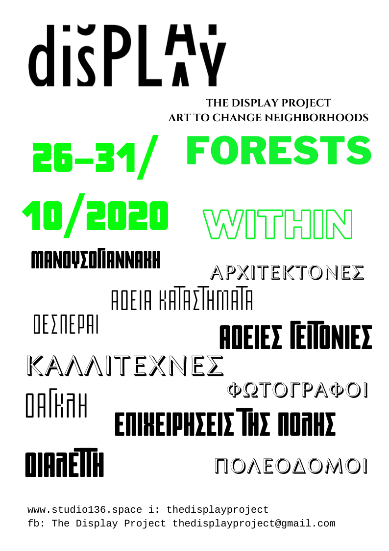Από 26 έως 31 Οκτωβρίου το The DisPlay Project παρουσιάζεται στο κοινό της πόλης με μία εκδήλωση/εικαστική παρέμβαση στον ημι/δημόσιο χώρο των βιτρινών των κενών καταστημάτων. Η έλλειψη πρασίνου στην πόλη αποτελεί το σημείο αναφοράς του θέματος και υπό τον τίτλο “Forests Within” δημιουργοί από διαφορετικές ειδικότητες καλούνται να φτιάξουν/σχεδιάσουν δέντρα/δάση.