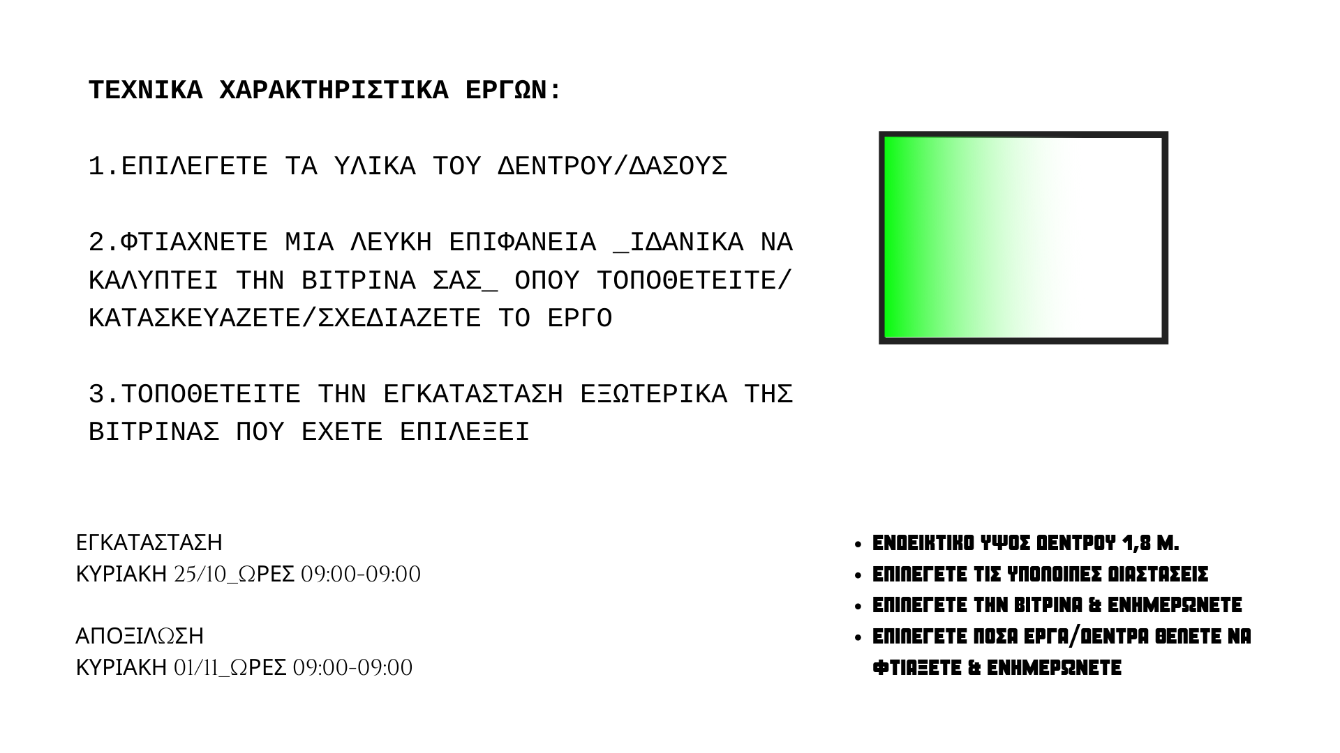 Παράλληλα στην οδό Μανουσογιαννάκη κρέμονται 9 πράσινα λάβαρα/οθόνες και ενεργοποιούνται με προβολές φωτογραφιών τις νυχτερινές ώρες.