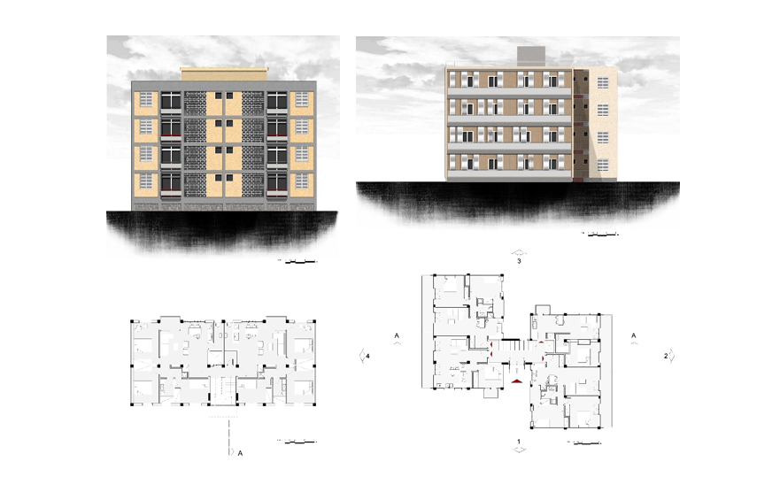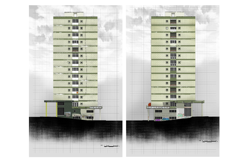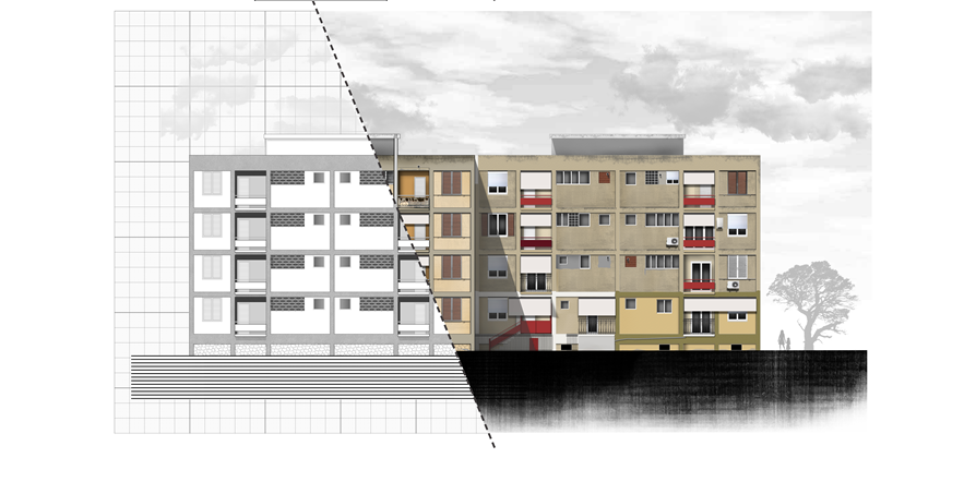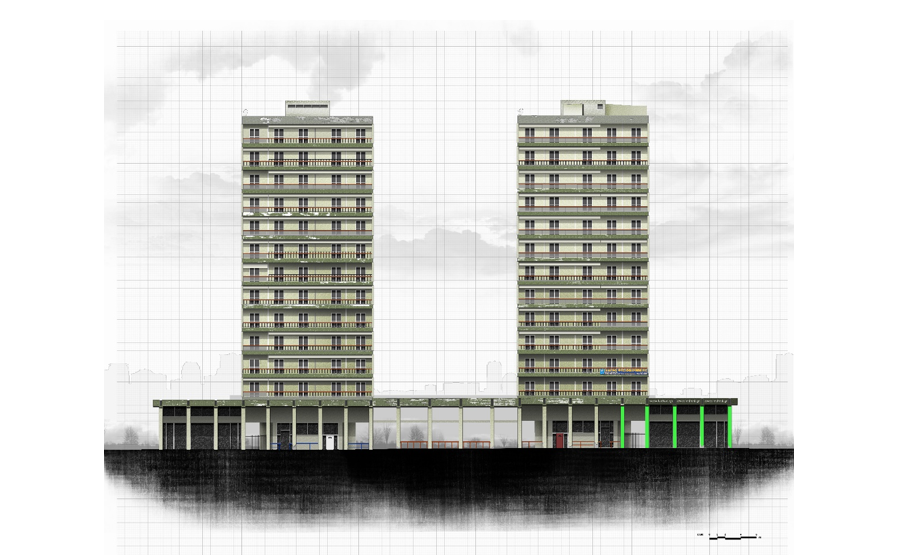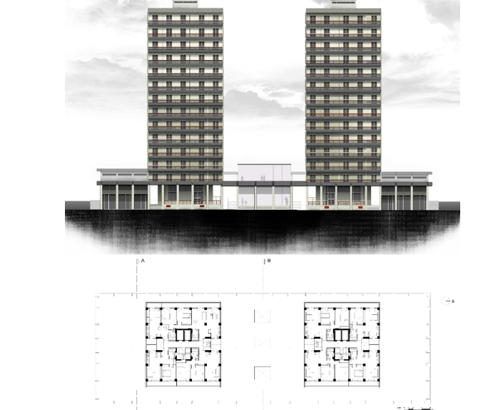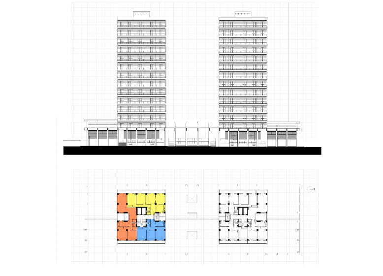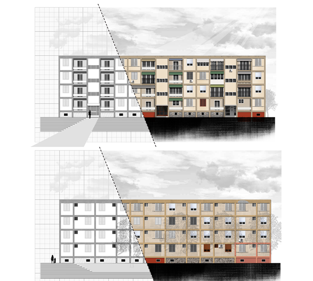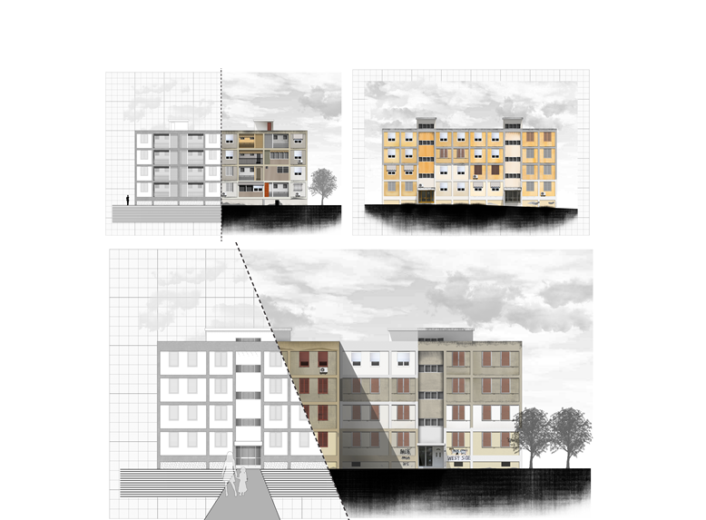 Όσον αφορά την αποκατάσταση των κτιρίων, προτείνεται η απομάκρυνση από τις όψεις όλων των μεταγενέστερων προσθηκών και η επαναφορά τους σε μια καθαρή μορφή, ενσωματώνοντας και την ανάγκη για ηλιοπροστασία. Οι κατόψεις επανασχεδιάζονται με σύγχρονους μετρικούς χωρικούς όρους και προδιαγραφές ώστε να δύνανται να καλύψουν τις σημερινές ανάγκες αλλά και να εξασφαλίζεται η προσβασιμότητα όλων των ατόμων. Στο συγκρότημα των δωδεκαώροφων πολυκατοικιών επί της οδού Λαγκαδά, μεταξύ των δύο πύργων, σχεδιάζεται κτιριακή προσθήκη με απόλυτα αναστρέψιμο χαρακτήρα. Σε επίπεδο χρήσεων, η κατοικία είναι αυτή που διατηρείται ενώ αλλαγές προκύπτουν στα ισόγεια καταστήματα της οδού Λαγκαδά.