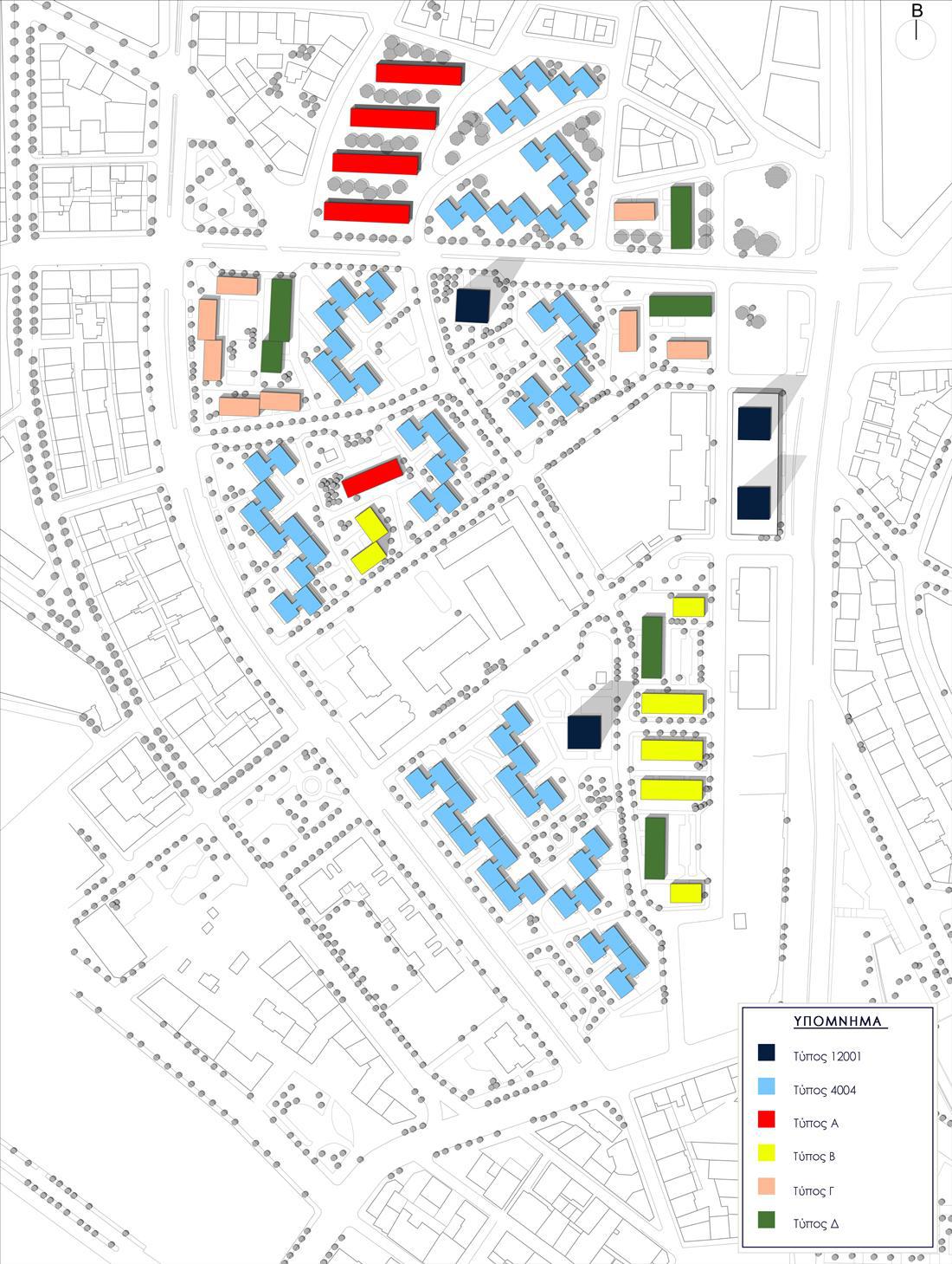 Η κάτοψη του τυπικού ορόφου είναι σχεδόν τετράγωνη και στο κέντρο βρίσκεται ο πυρήνας του κλιμακοστασίου με τους δύο ανελκυστήρες. Περιμετρικά αυτού, αρθρώνονται τρία διαμερίσματα, σε αντίθεση με τον τύπο 8001 όπου ο κάθε όροφος αποτελείται από τέσσερα διαμερίσματα. Ενδιαφέρον παρουσιάζει και η κάτοψη του ισογείου, όπου η επιθυμία των σχεδιαστών για ελεύθερη κίνηση διαμέσου του κτιρίου είναι εμφανής. Στα πρότυπα και πάλι των μοντέρνων περιπτέρων και με ένα παιχνίδι με επίπεδα τοιχοποιίας και γυαλιού, οι σχεδιαστές οργάνωσαν το επίπεδο της εισόδου. Οι πύργοι των δωδεκαώροφων ξεχωρίζουν σε επίπεδο σχεδιασμού από τα υπόλοιπα κτίρια του οικισμού τόσο λόγω του όγκου τους αλλά και λόγω του πιο έντονου αστικού χαρακτήρα σε σχέση με τα υπόλοιπα διαμερίσματα του οικισμού.