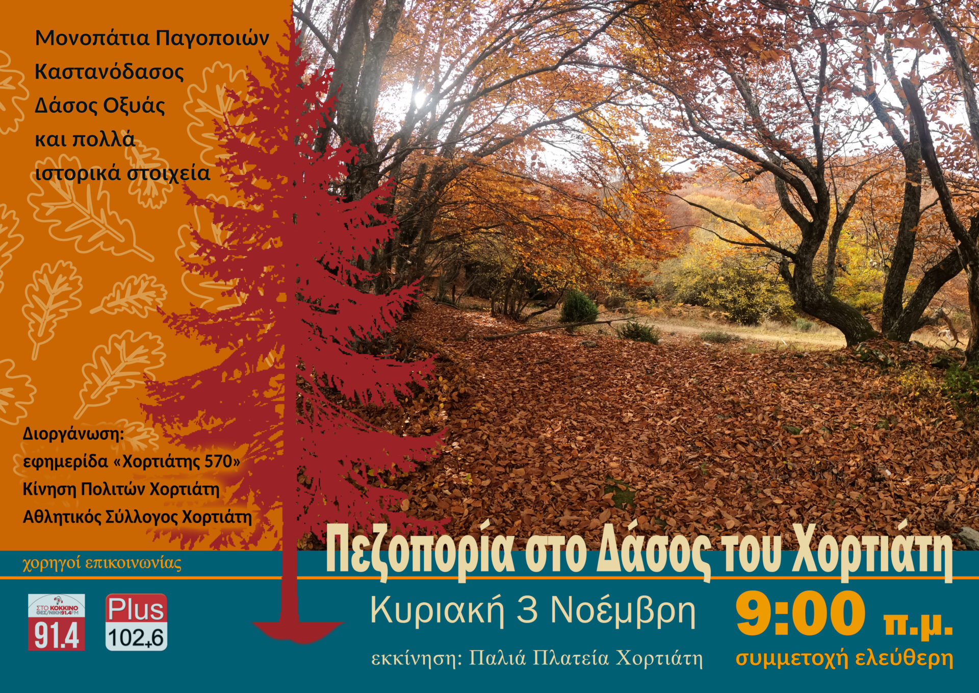 Φθινοπώριασε και πάλι για τα καλά, και όπως κάνουμε εδώ και 30 χρόνια περίπου, την πρώτη Κυριακή του Νοέμβρη, δίνουμε ραντεβού στις 9 το πρωί στην παλιά πλατεία του Χορτιάτη και αφού ακούσουμε λίγα πληροφοριακά στοιχεία για τον ιστορικό και μαρτυρικό Χορτιάτη (φέτος τιμούμε τα 80 χρόνια από το Ολοκαύτωμα), θα ανηφορίσουμε για τα Μονοπάτια των παγοποιών, το Καστανόδασος και το δάσος της Οξιάς.