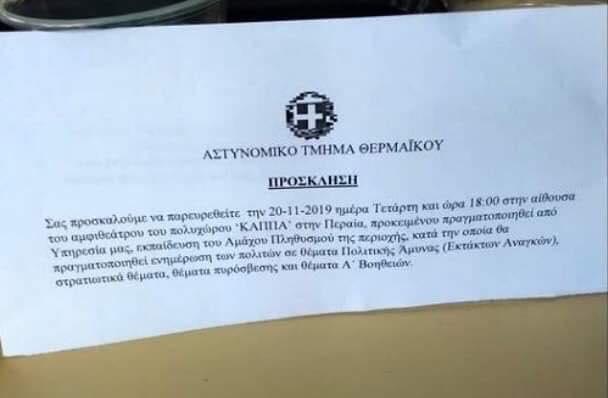 Μια πρόσκληση από το Αστυνομικό Τμήμα Θερμαϊκού έφτασε στα χέρια μας μέσα από μία αναγνώστρια της Parallaxi.