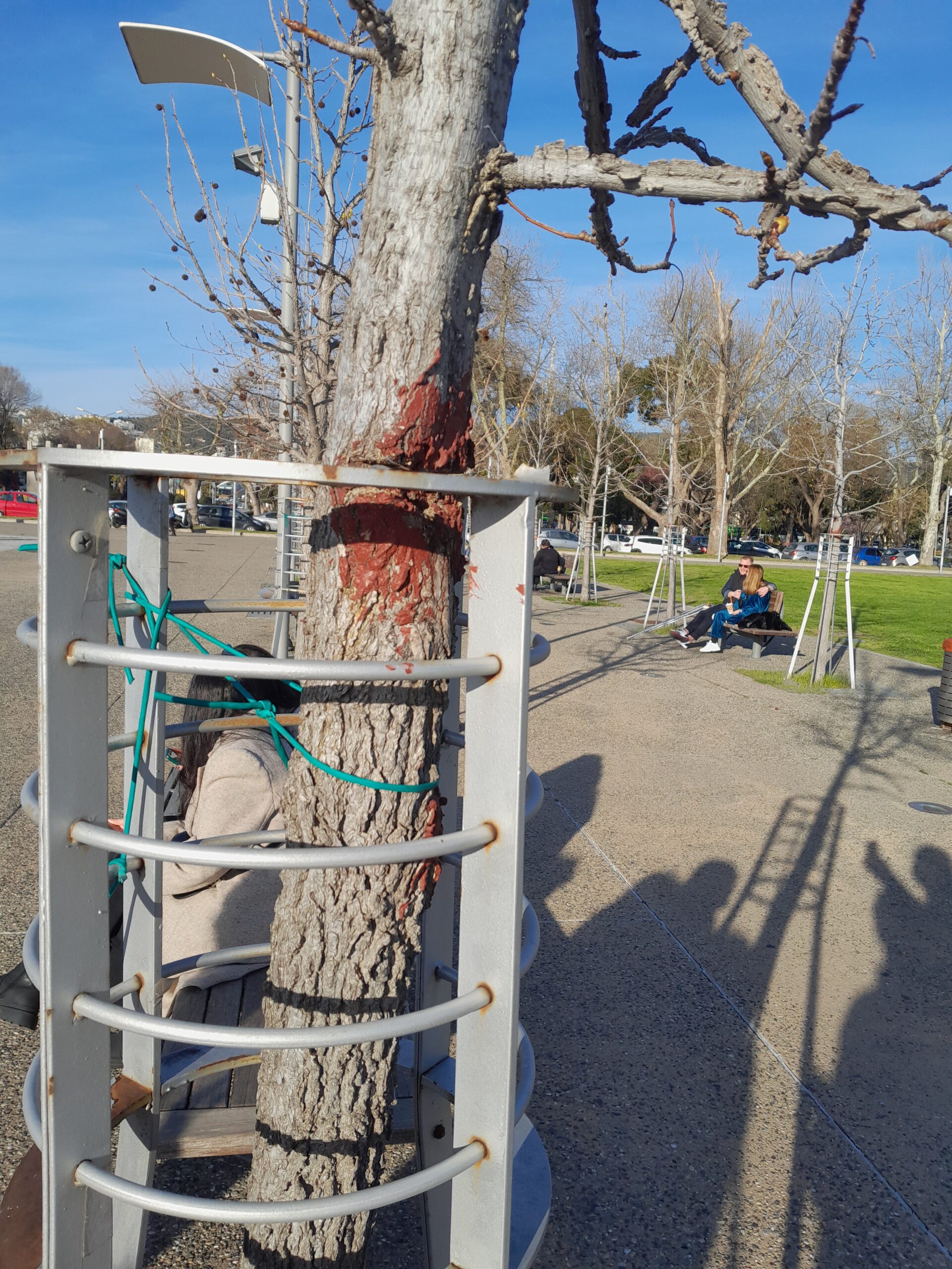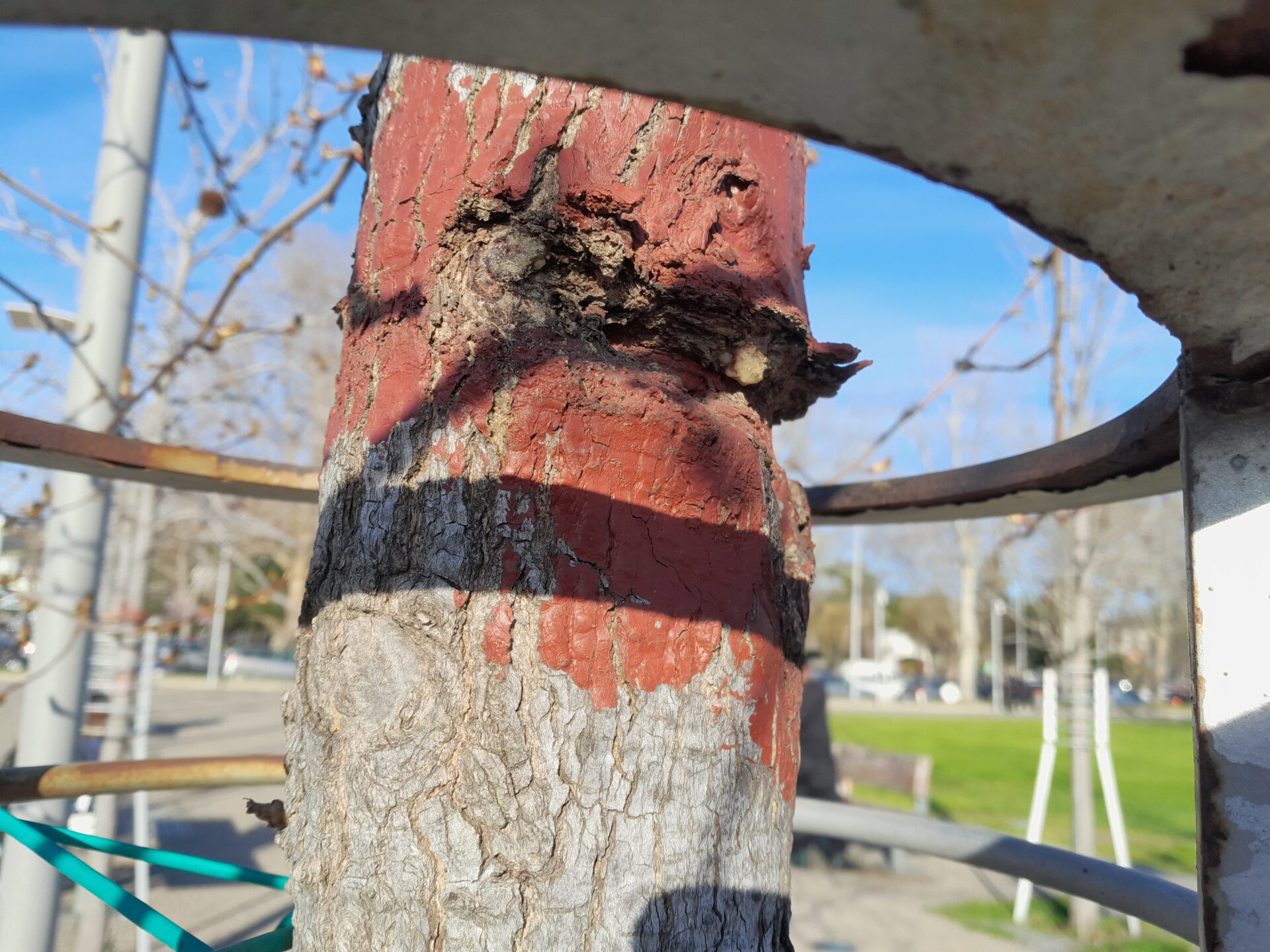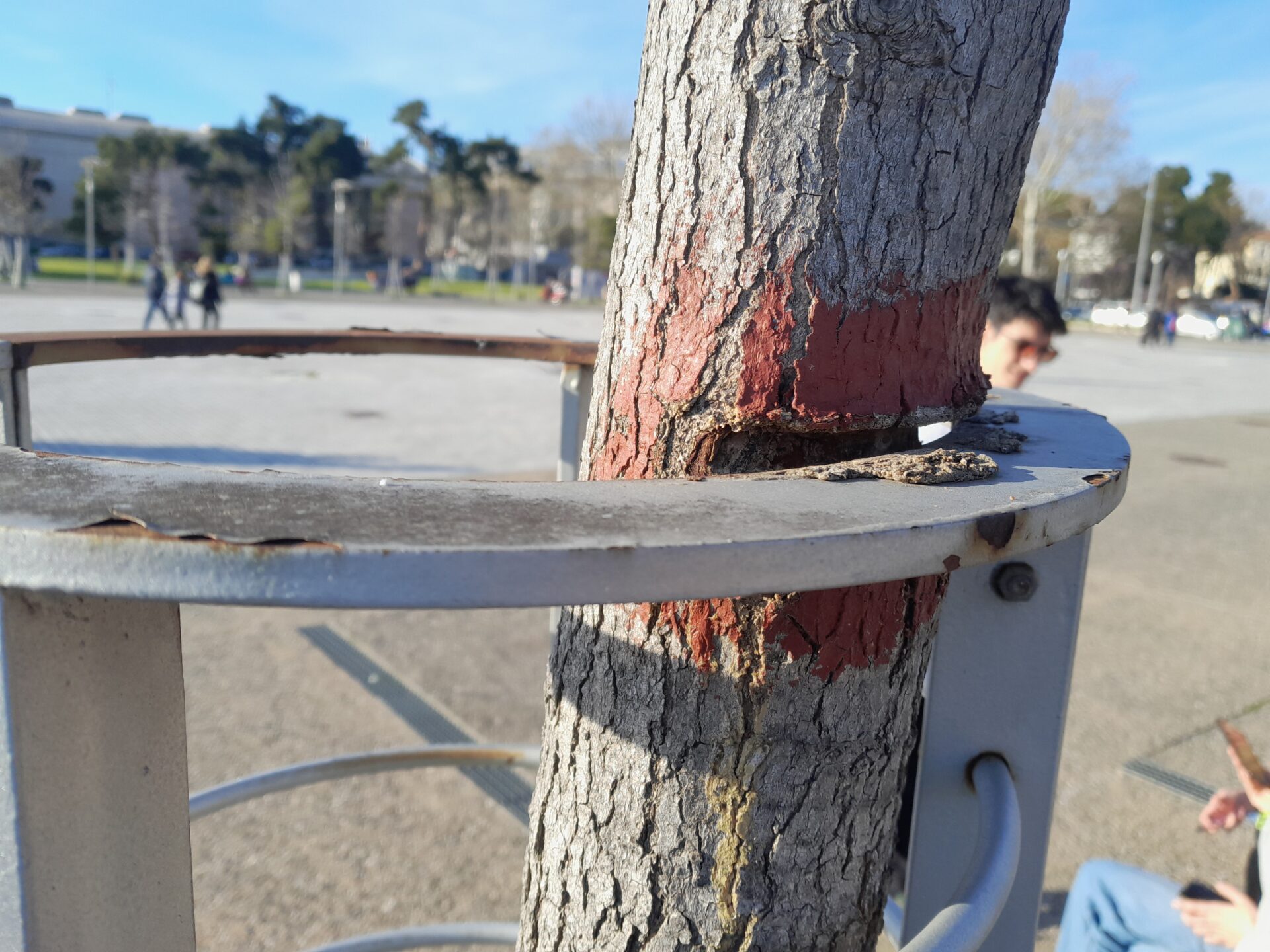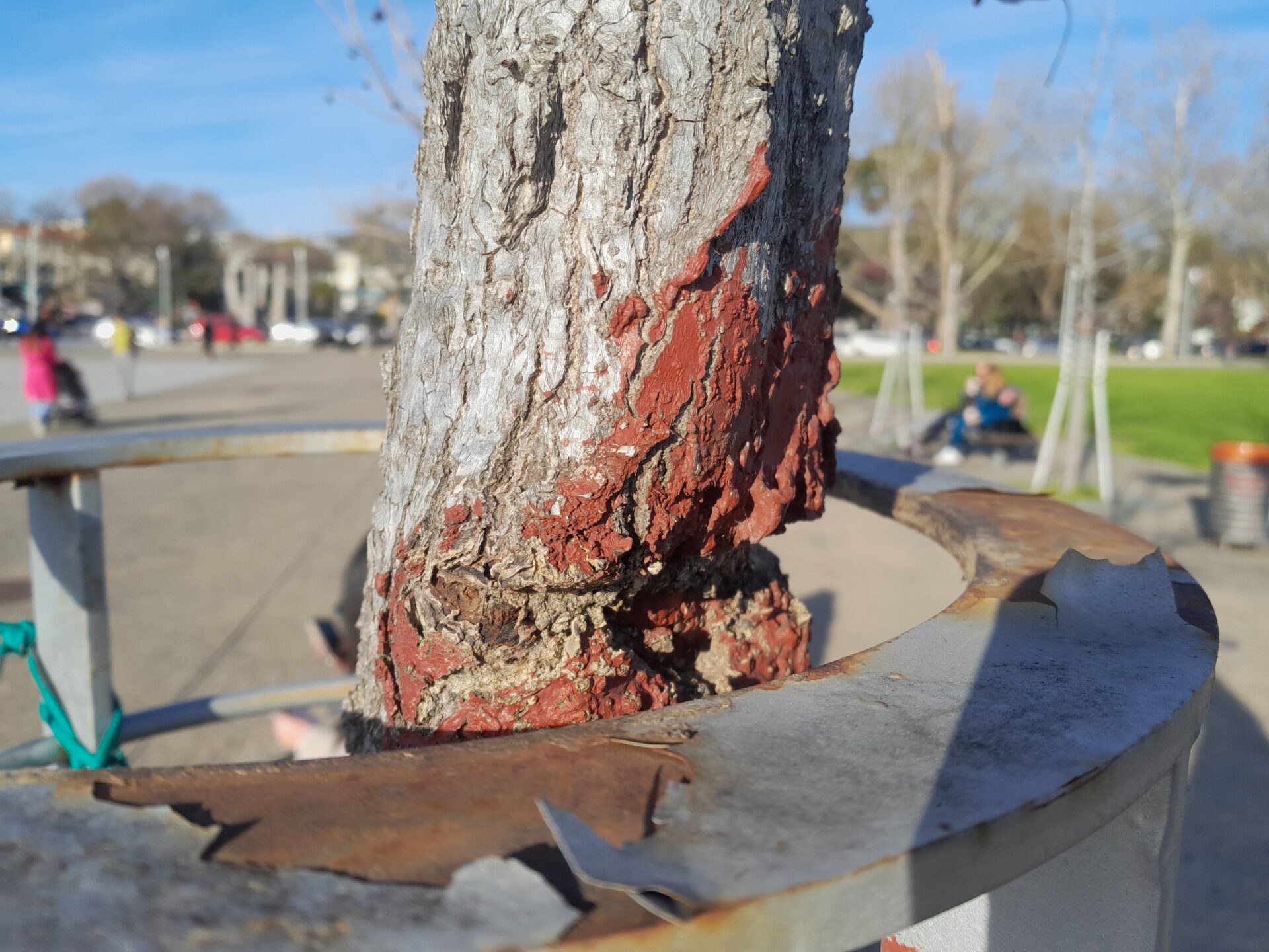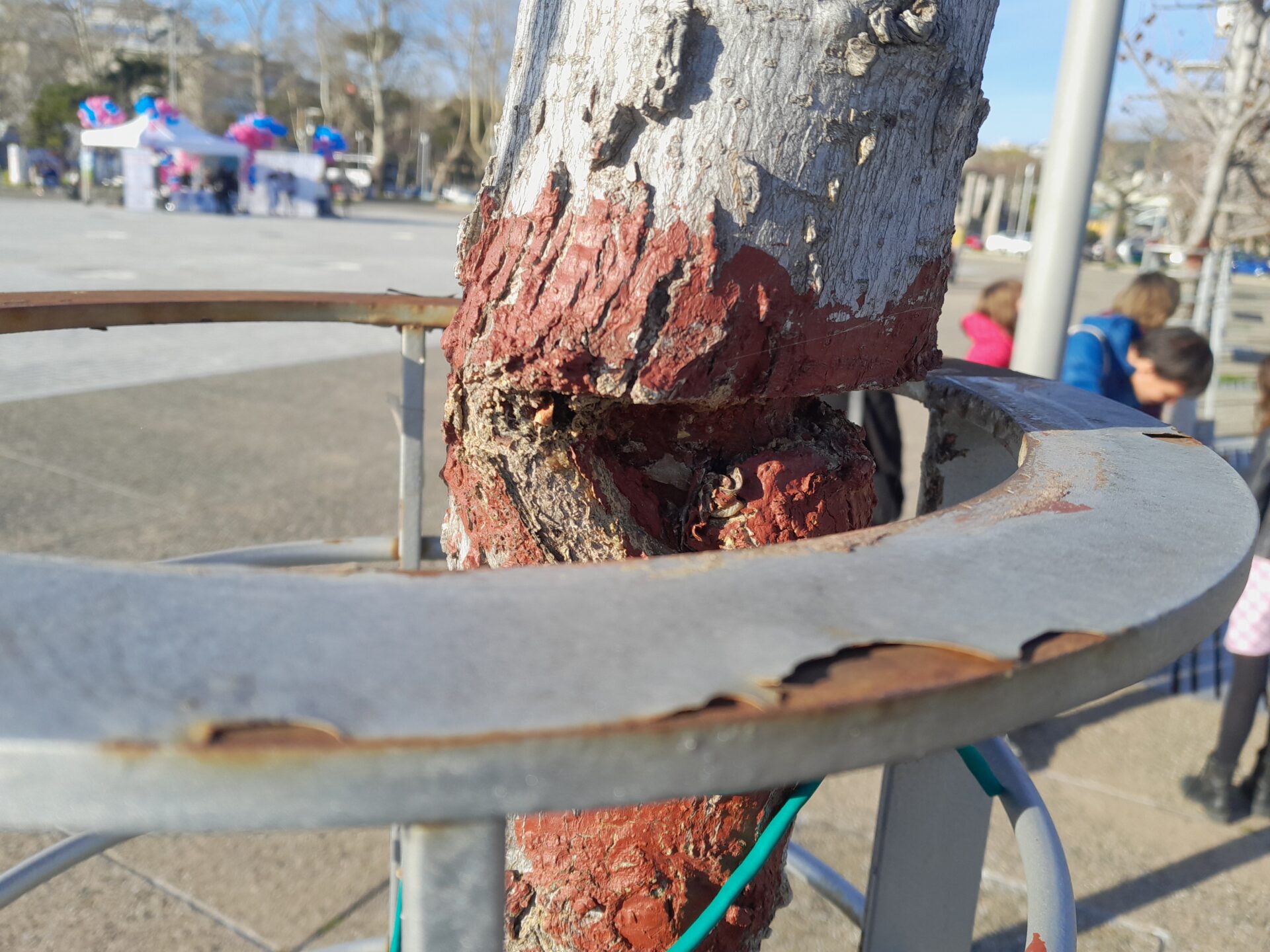 Αυτό έχει ως αποτέλεσμα τα δέντρα να τραυματίζονται βαθιά, ιδιαίτερα όταν στην πόλη επικρατούν άνεμοι, όπως αυτοί των τελευταίων δύο ημερών, καθώς το προστατευτικό λειτουργεί σαν «μαχαίρι».