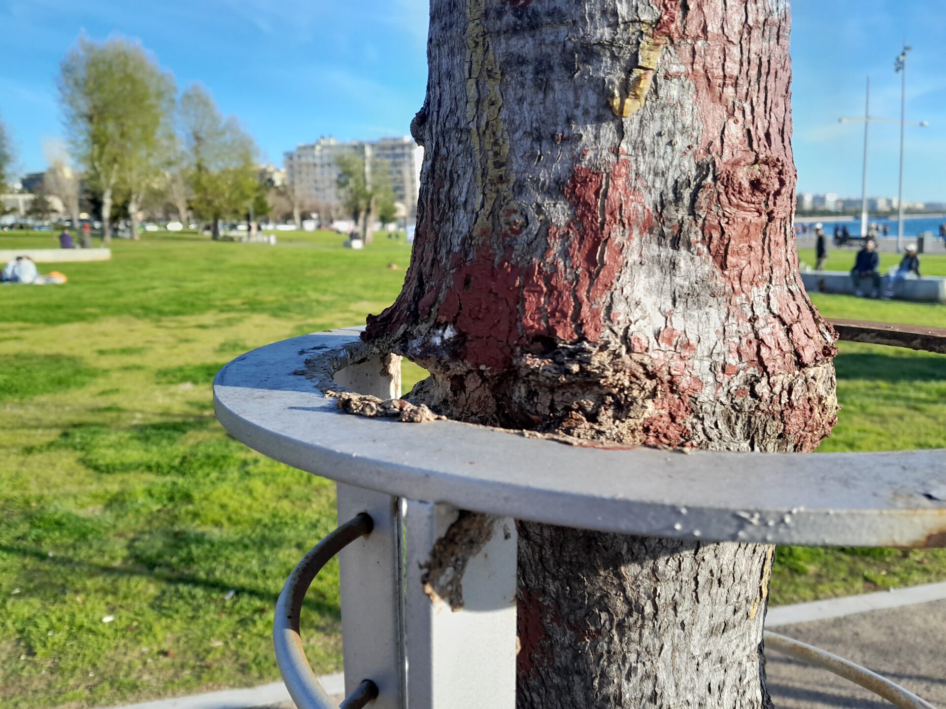 Δεν χρειάζεται και ιδιαίτερες γνώσεις για να καταλάβει κανείς ότι κάτι δεν πάει καλά με τα μεταλλικά προστατευτικά για την ανάπτυξη των δέντρων που υπάρχουν στο σημείο.