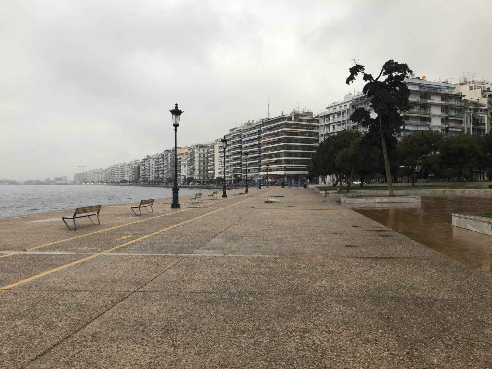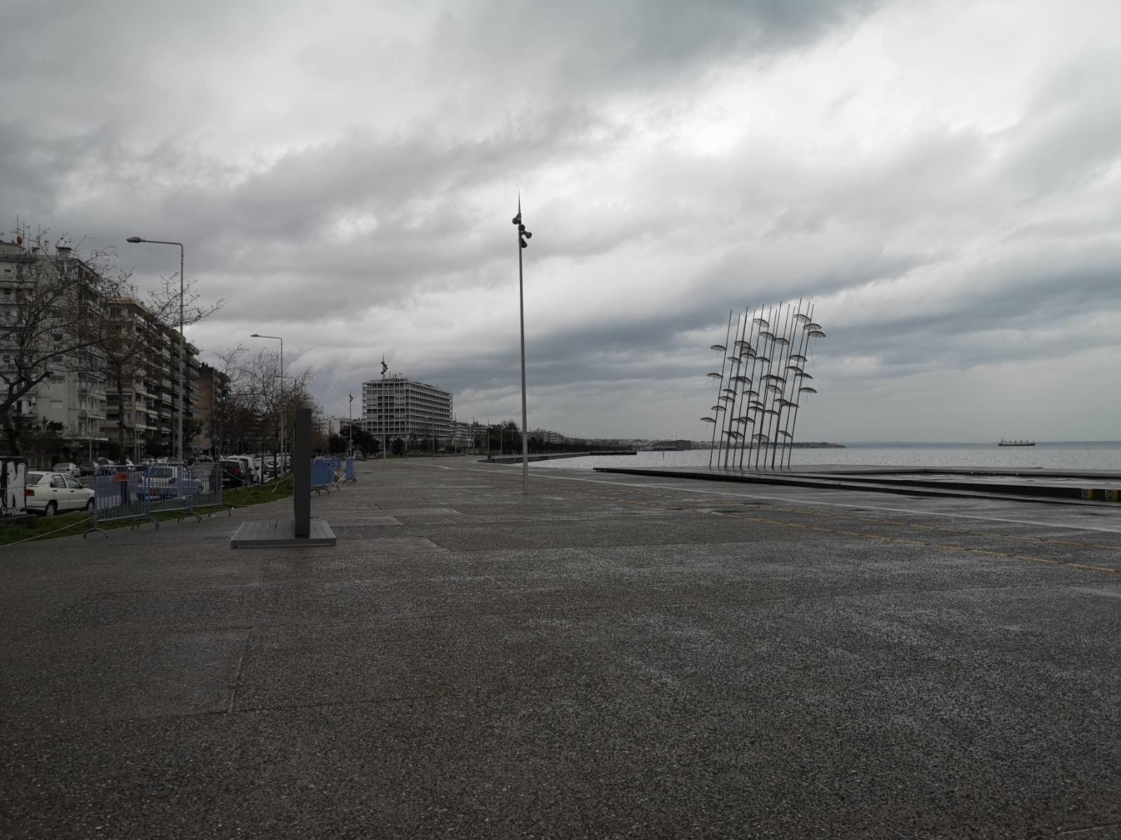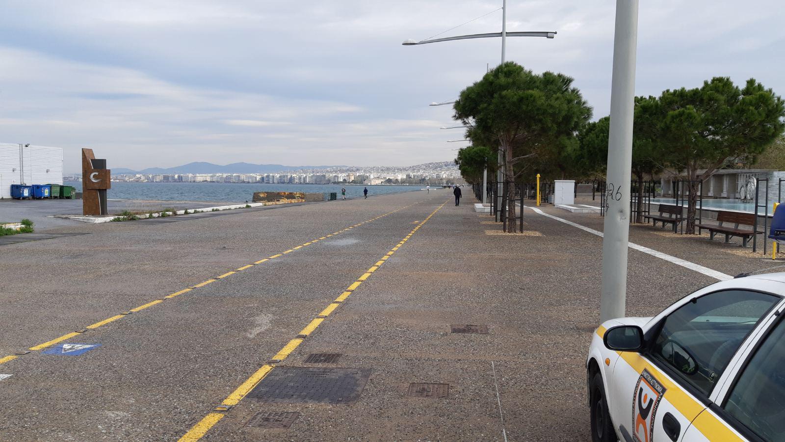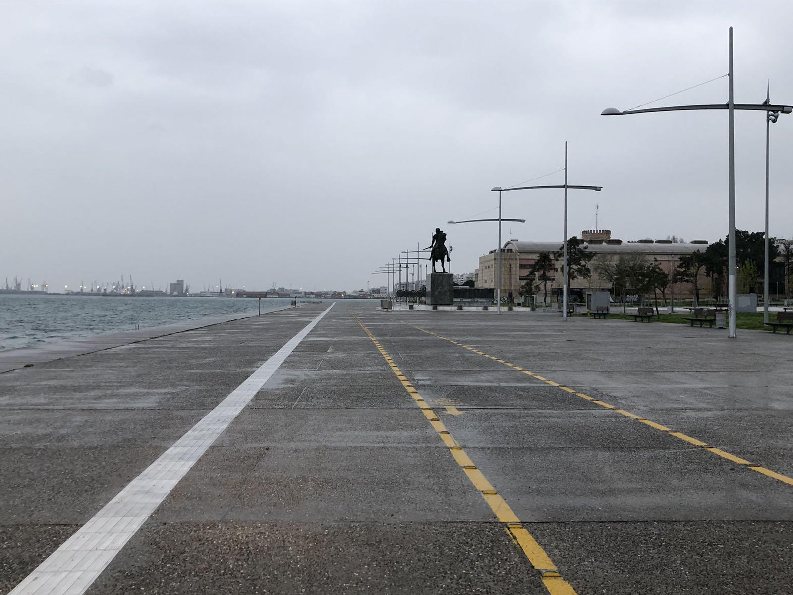 Μπορεί η άνοιξη να έχει μπει για τα καλά πια στην πόλη, παρά τις πρώτες βροχές, όμως η άλλοτε γεμάτη τέτοια εποχή Θεσσαλονίκη μένει σπίτι, με τις κεντρικές αρτηρίες της άδειες και το ορόσημο της Νέας Παραλίας με ελάχιστες ψυχές να κυκλοφορούν.