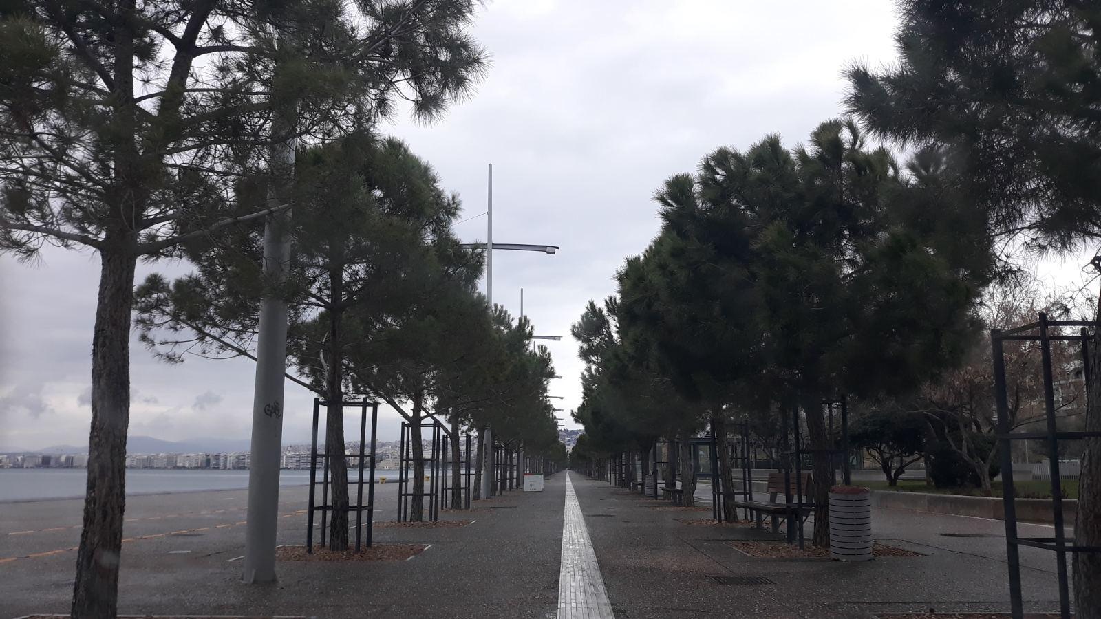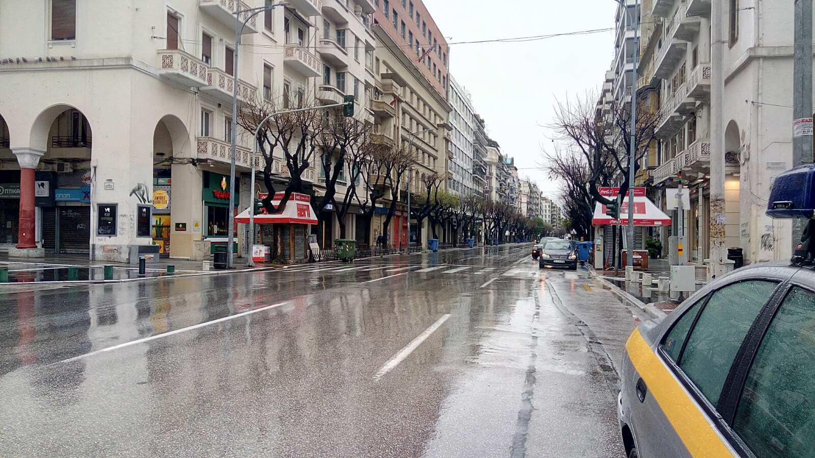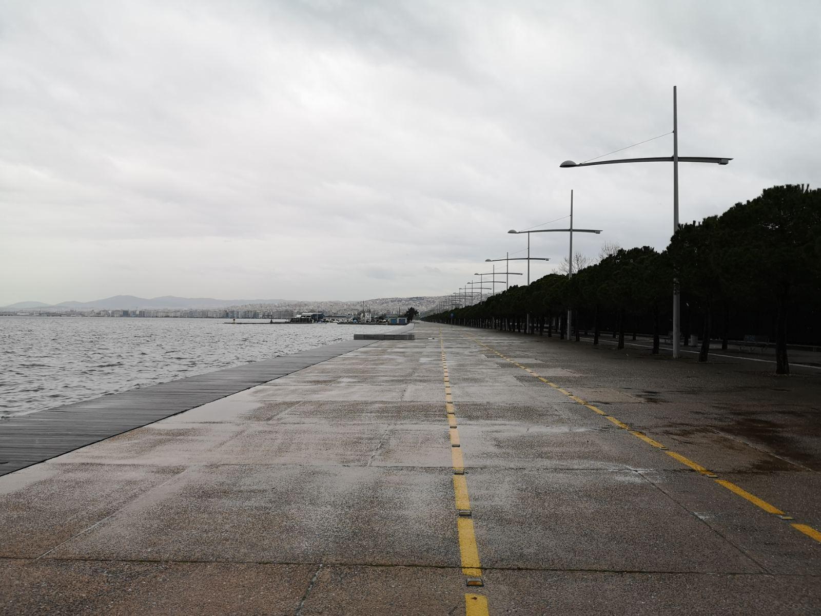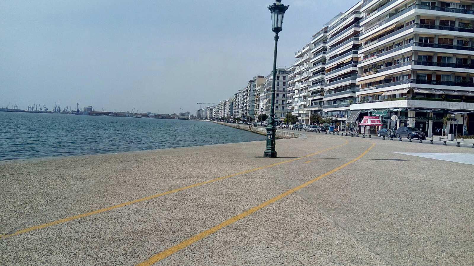 Μπορεί η άνοιξη να έχει μπει για τα καλά πια στην πόλη, παρά τις πρώτες βροχές, όμως η άλλοτε γεμάτη τέτοια εποχή Θεσσαλονίκη μένει σπίτι, με τις κεντρικές αρτηρίες της άδειες και το ορόσημο της Νέας Παραλίας με ελάχιστες ψυχές να κυκλοφορούν.