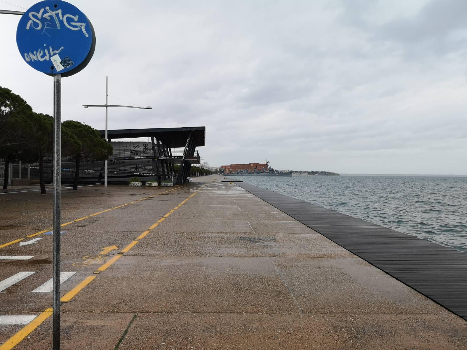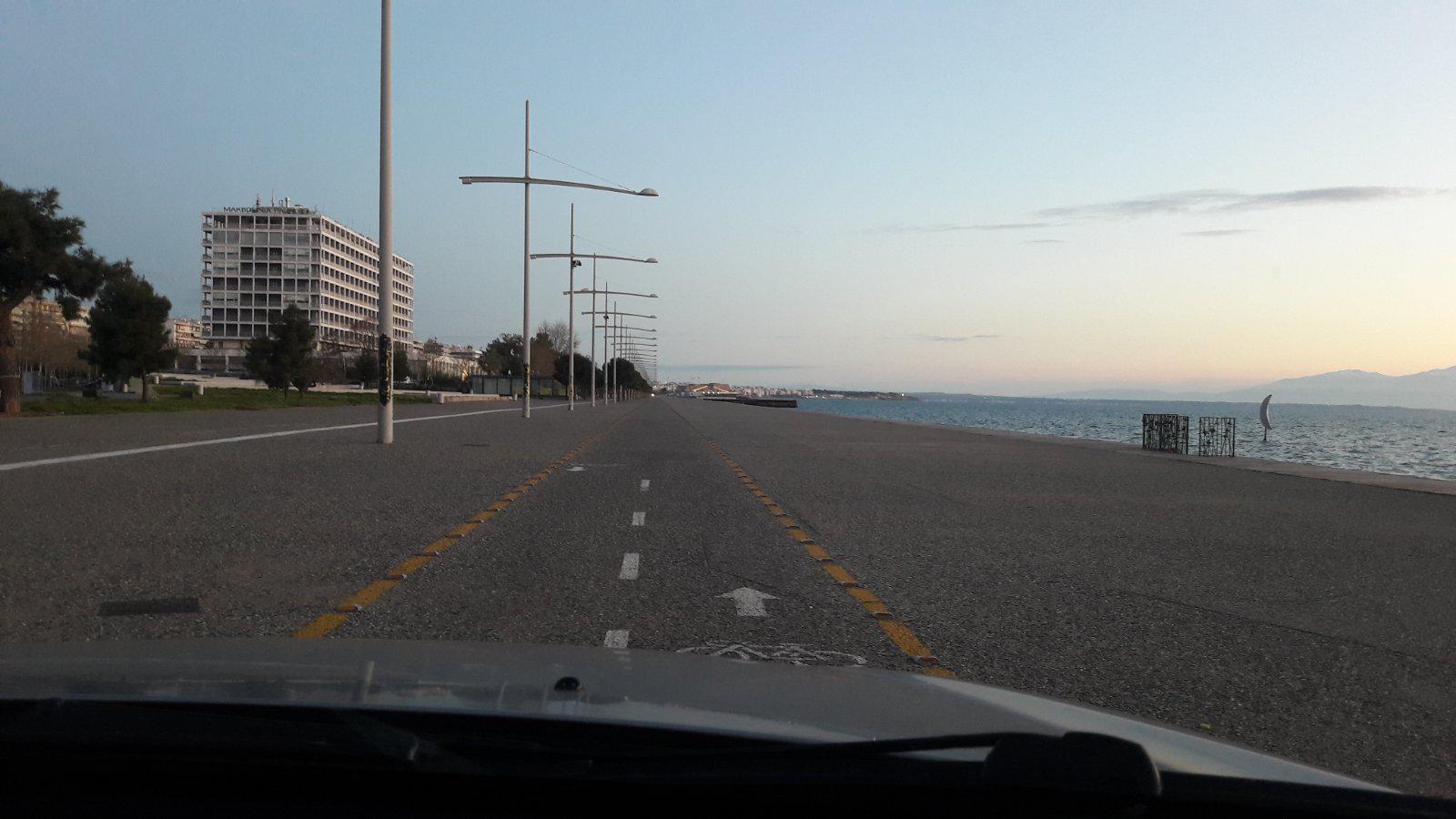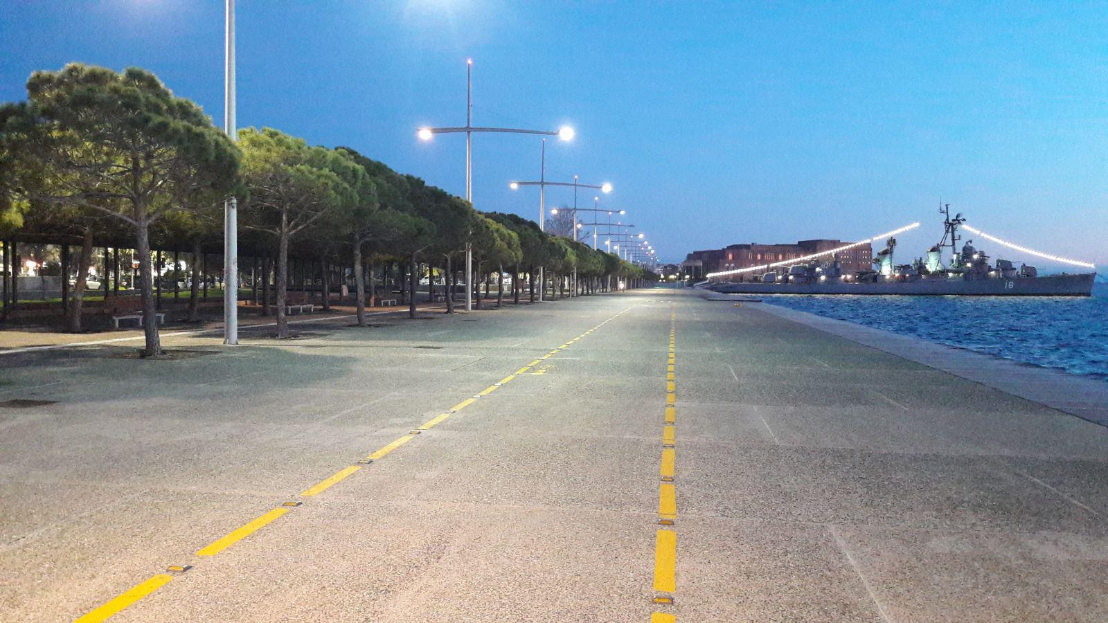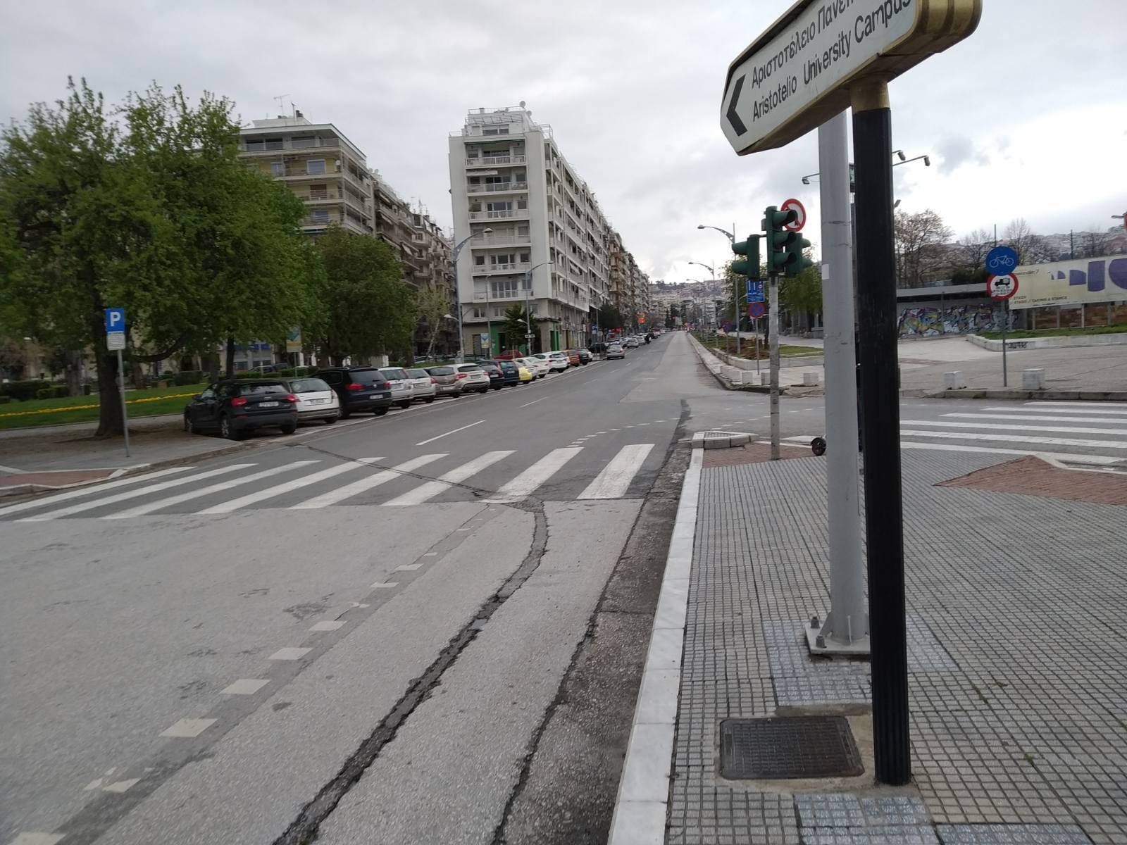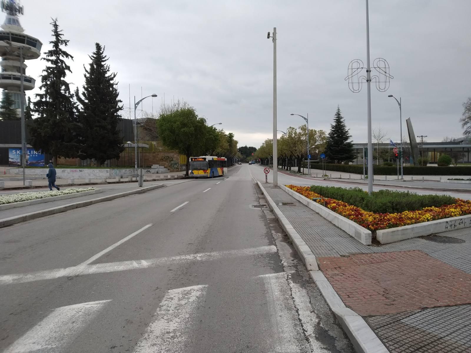 Μπορεί η άνοιξη να έχει μπει για τα καλά πια στην πόλη, παρά τις πρώτες βροχές, όμως η άλλοτε γεμάτη τέτοια εποχή Θεσσαλονίκη μένει σπίτι, με τις κεντρικές αρτηρίες της άδειες και το ορόσημο της Νέας Παραλίας με ελάχιστες ψυχές να κυκλοφορούν.