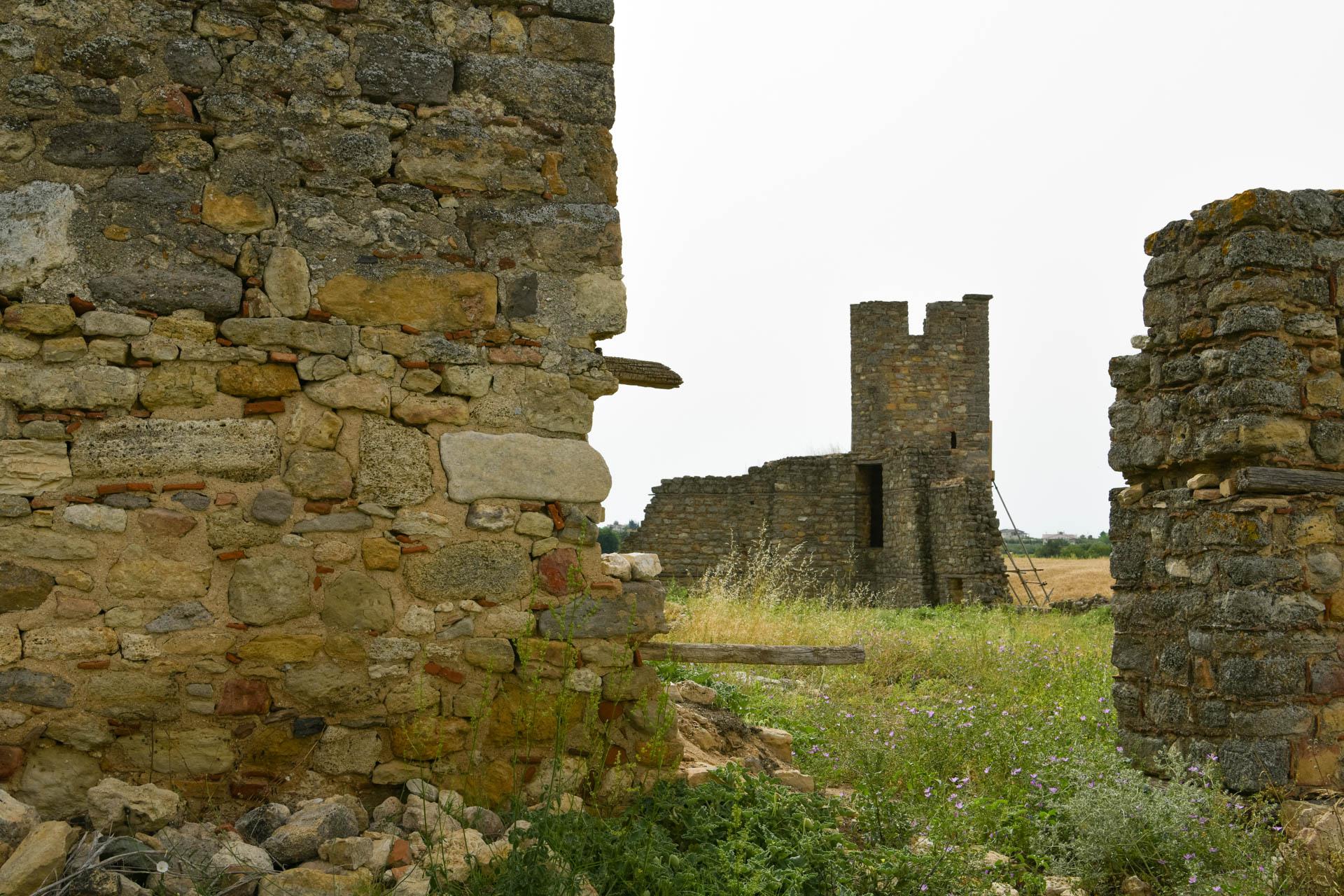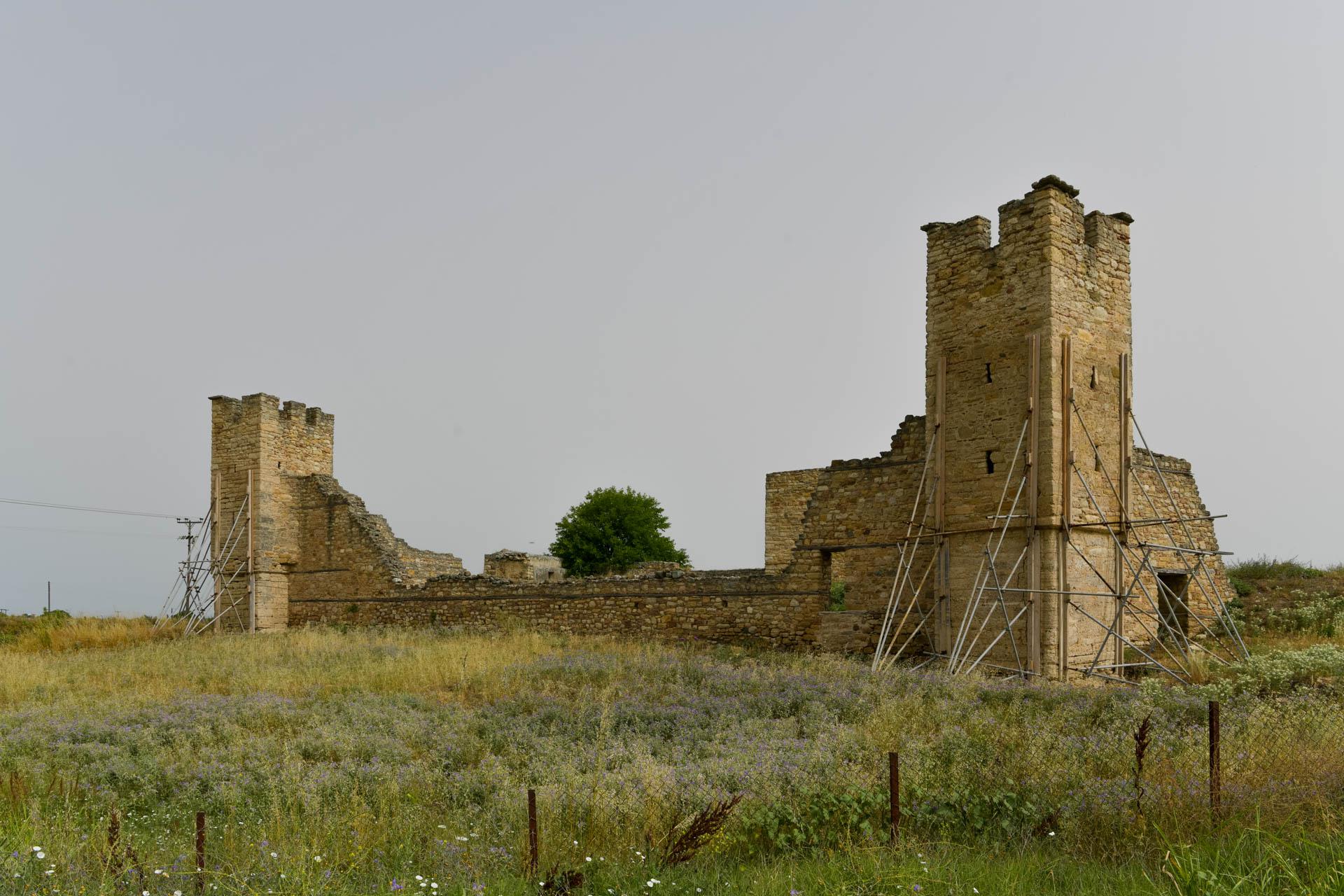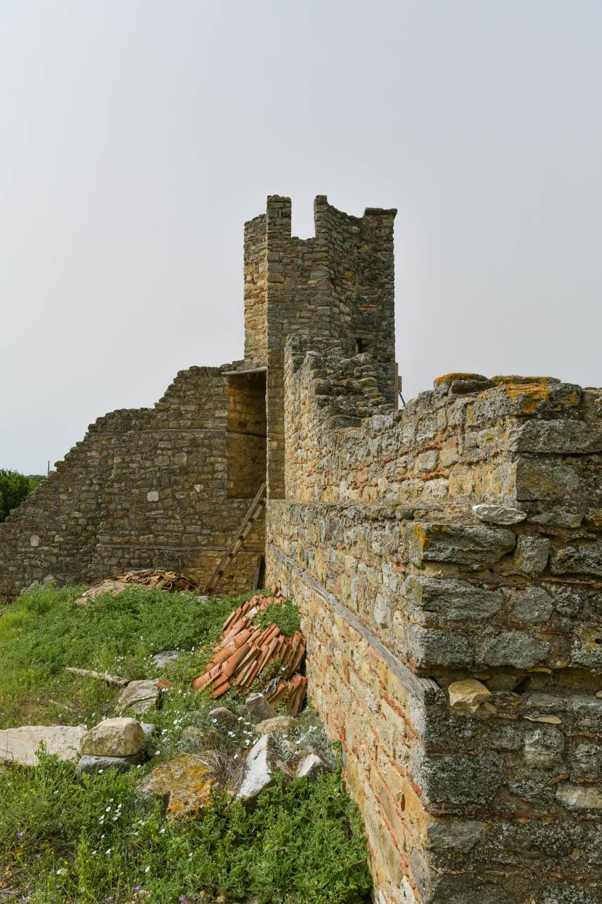 Ένας πεντάπλευρος περίβολος για καλύτερη προστασία, ενισχύεται από δύο πύργους στα ΝΑ και ΝΔ. Οι πύργοι αυτοί σώζονται ως τις επάλξεις με συνολικό ύψος 10 μέτρα. Αποτελούνται από δύο ορόφους, ενώ το ισόγειο είναι μπαζωμένο για μεγαλύτερη σταθερότητα και στήριξη στο τείχος. Η οροφή τους είναι θολωτή και η τοιχοδομία τους επιμελημένη από λαξευμένους πωρόλιθους. Ανατολικά υπήρχε άλλος ένας πύργος-αντηρίδα, που μεταγενέστερα μετατράπηκε σε φούρνο.