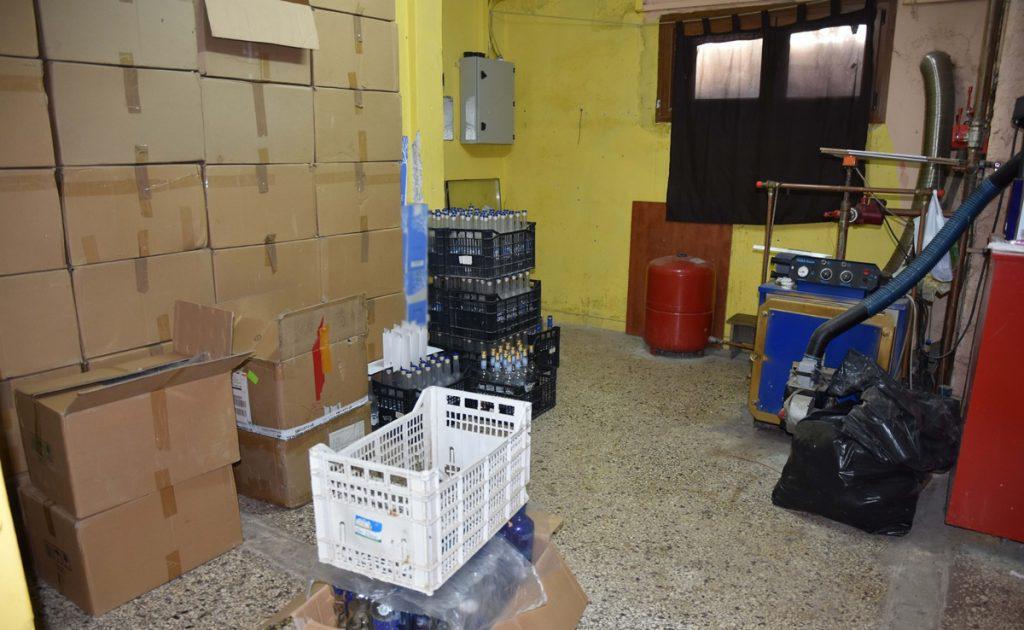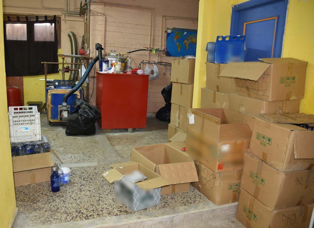 Κατά την έρευνα βρέθηκαν και κατασχέθηκαν: (2.546) κενές φιάλες με σήματα εταιρειών οινοπνευματωδών ποτών (343) φιάλες πλήρεις αλκοολούχου ποτού, (190) χάρτινα κιβώτια, (29.419) αυτοκόλλητα φιαλών, (13.368) πώματα φιαλών, (2) πλαστικές δεξαμενές που περιείχαν περίπου 600 λίτρα οινοπνευματώδους μείγματος συνολικά, (2) χειροκίνητοι μηχανισμοί σφράγισης φιαλών, Αλκοολόμετρο, σωληνώσεις, βάνες και διάφορα εργαλεία