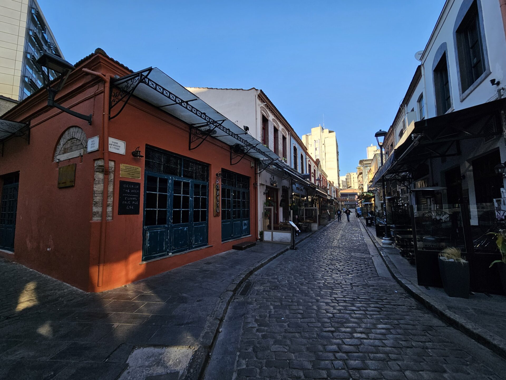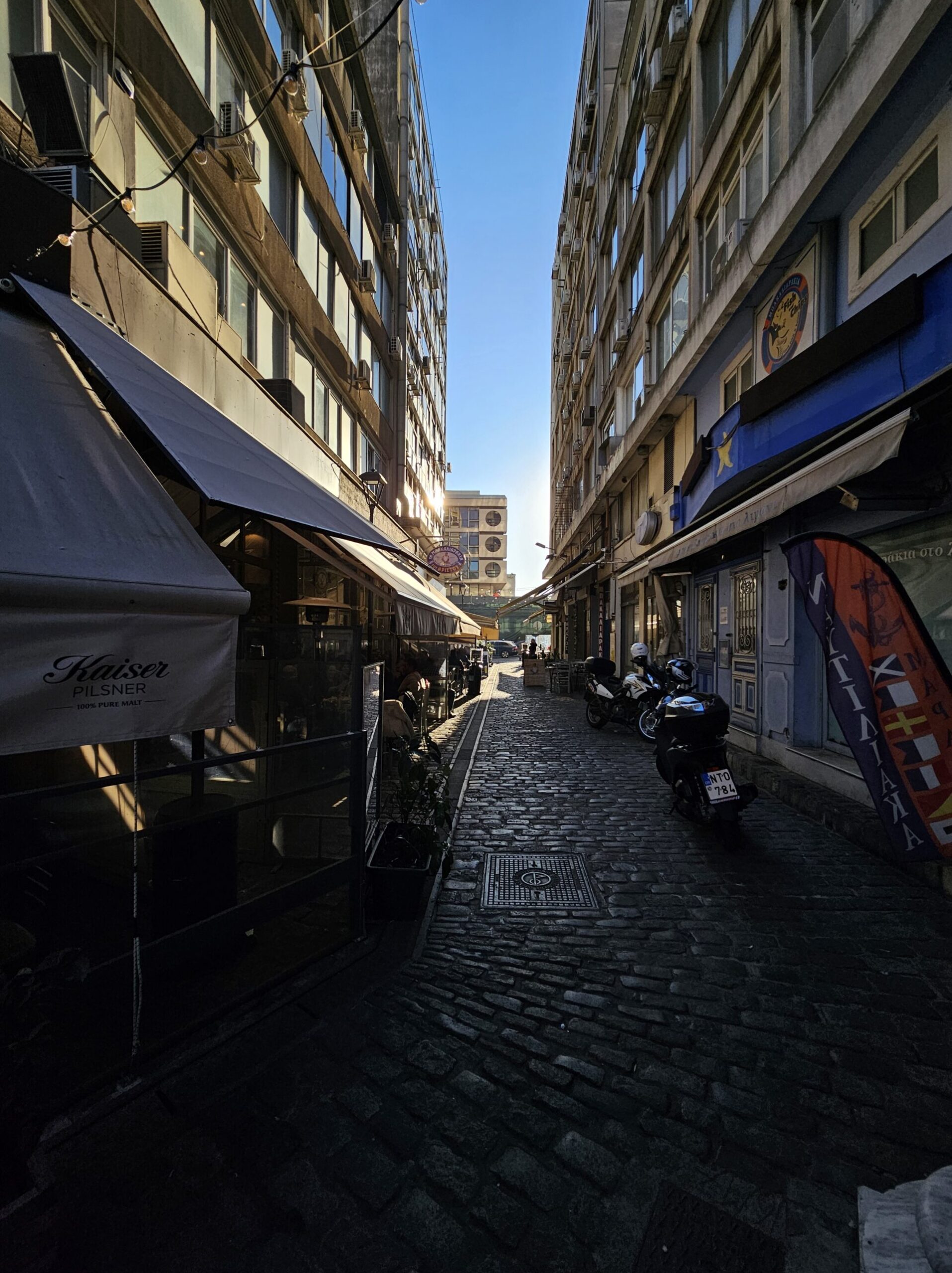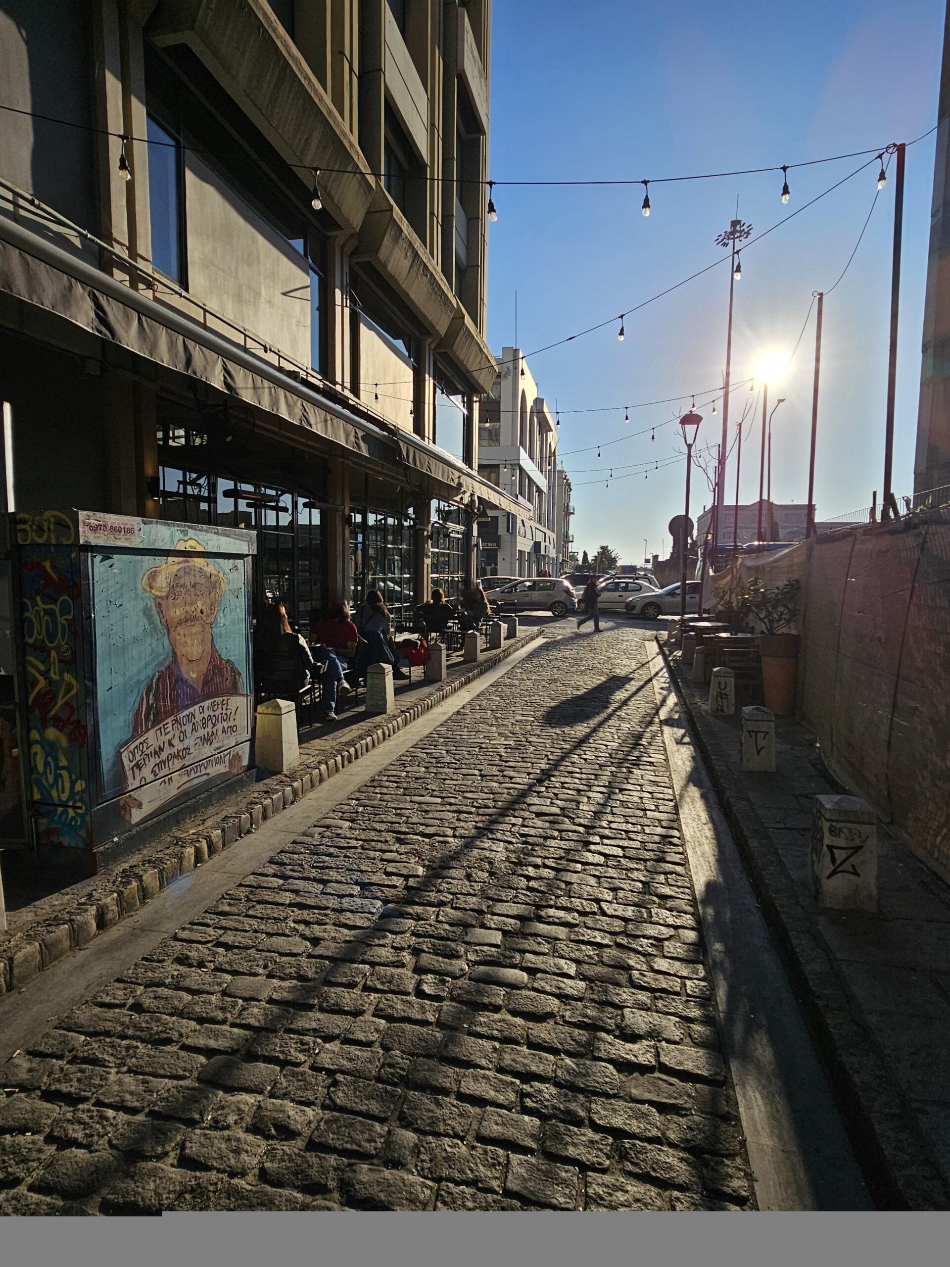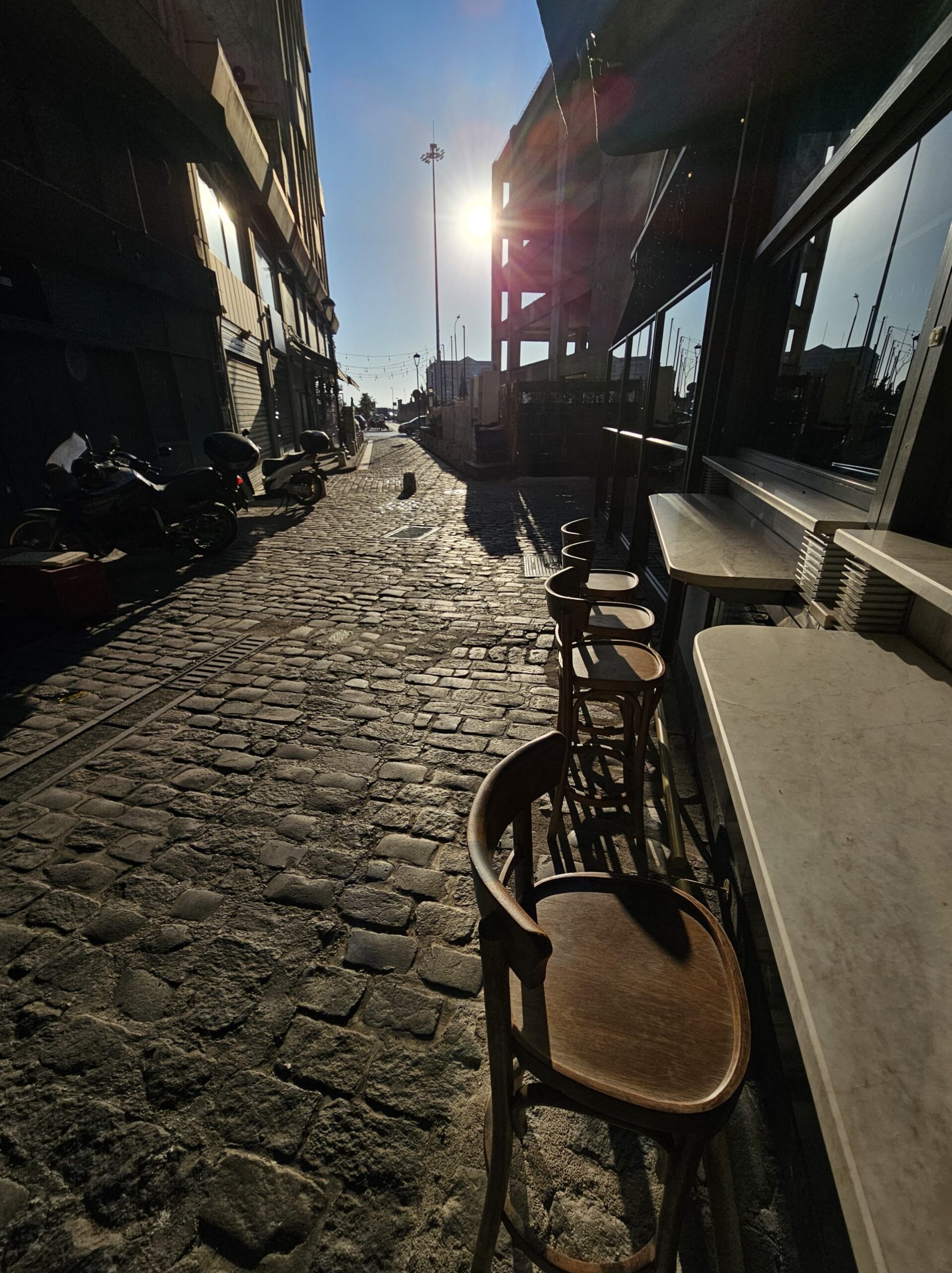 Ο ήλιος που πέφτει σιγά σιγά προς τη Δύση, δημιουργεί έναν όμορφο γλυκό φωτισμό με έντονες σκιές στα στενά των Λαδάδικων.