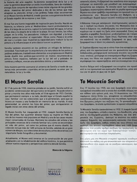 Ο Σορόγια γεννημένος στη Βαλένθια, βρήκε στη θάλασσα μια ανεξάντλητη πηγή έμπνευσης, αποτυπώνοντας τη φωτεινότητα του νερού και τη ζωή στην παραλία. Εμπνεύστηκε επίσης από τους κήπους της Ανδαλουσίας, μεταφέροντας την ομορφιά τους στο σπίτι του στη Μαδρίτη, όπου σχεδίασε τρεις κήπους που έγιναν επαναλαμβανόμενα μοτίβα στους πίνακές του. Η έκθεση αντανακλά την αγάπη του για τη φύση, το φως και τη ζωή.