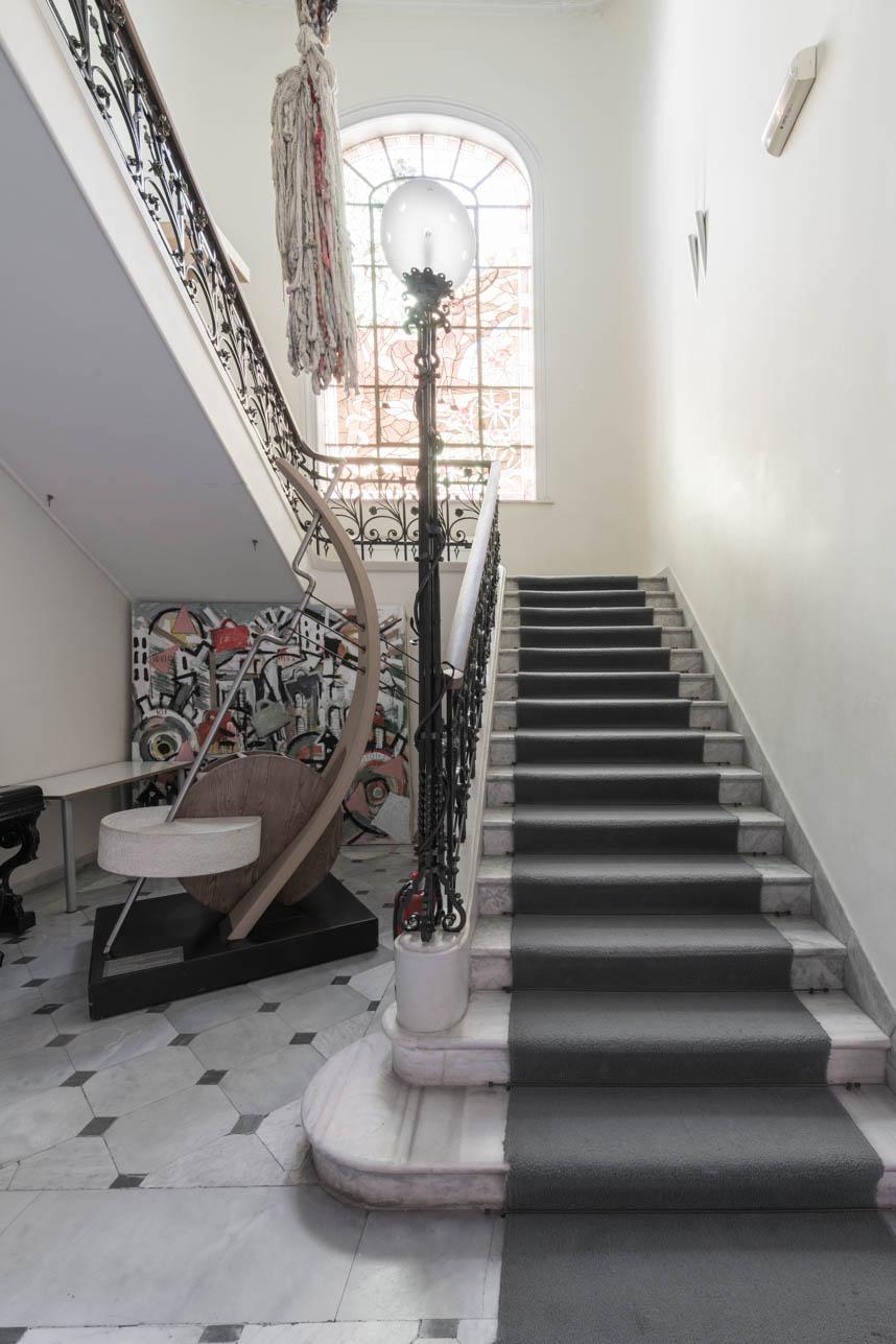 Ένα μεγάλο πολύχρωμο υαλογράφημα με θέμα τον Παράδεισο, μοναδικό σωζόμενο δείγμα βιτρό ιδιωτικής κατοικίας της Θεσσαλονίκης, εξυπηρετεί τις ανάγκες φωτισμού του κεντρικού κλιμακοστασίου της έπαυλης.