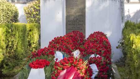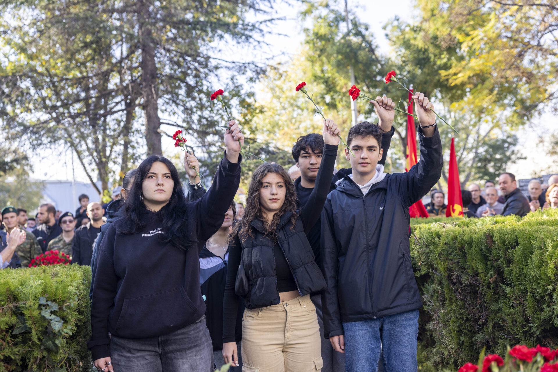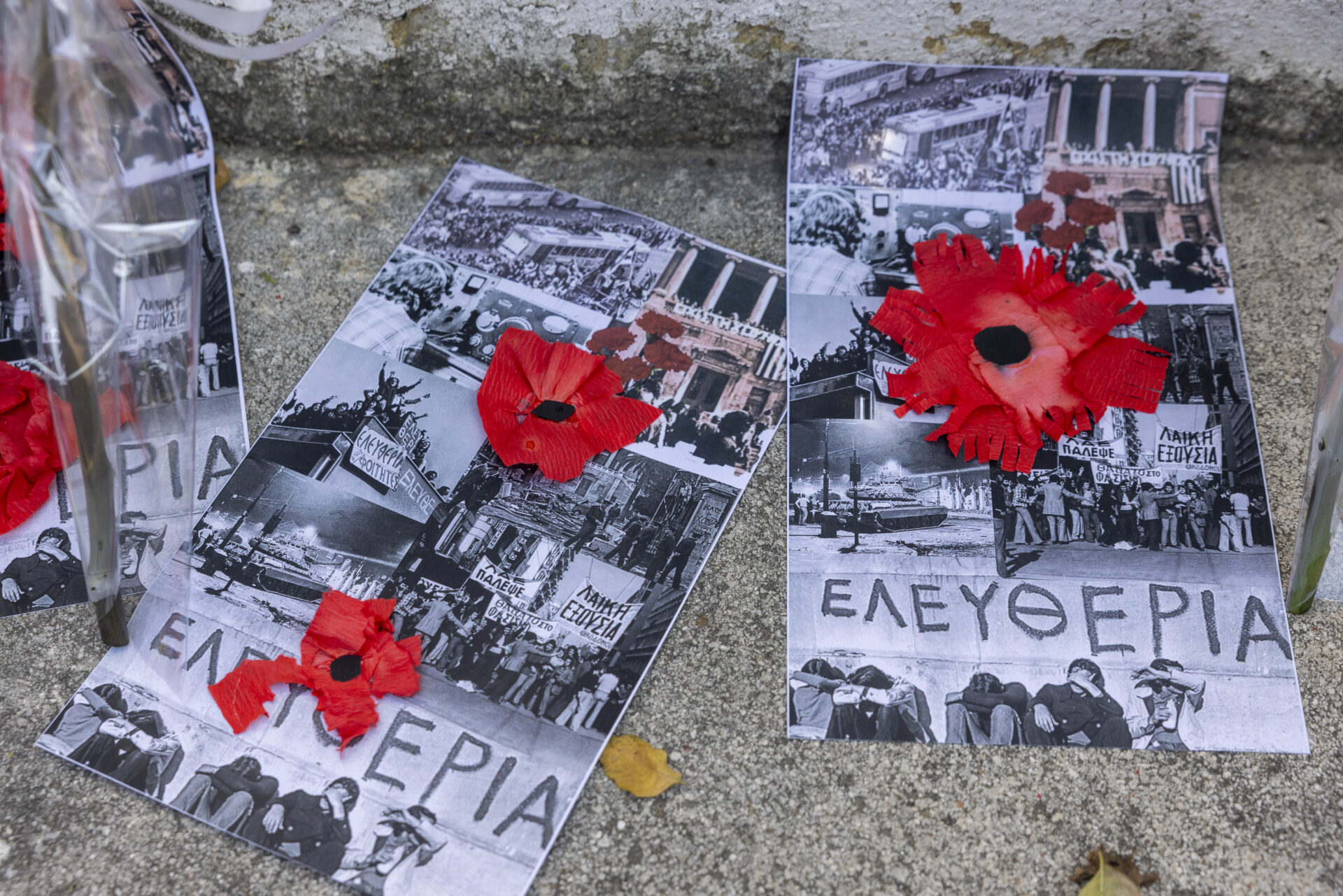 Πλήθος πολιτών, όλων των ηλικιών, άφησε κόκκινα γαρύφαλλα ή στεφάνια λουλουδιών, αποτίοντας φόρο τιμής στους νεκρούς του Πολυτεχνείου.