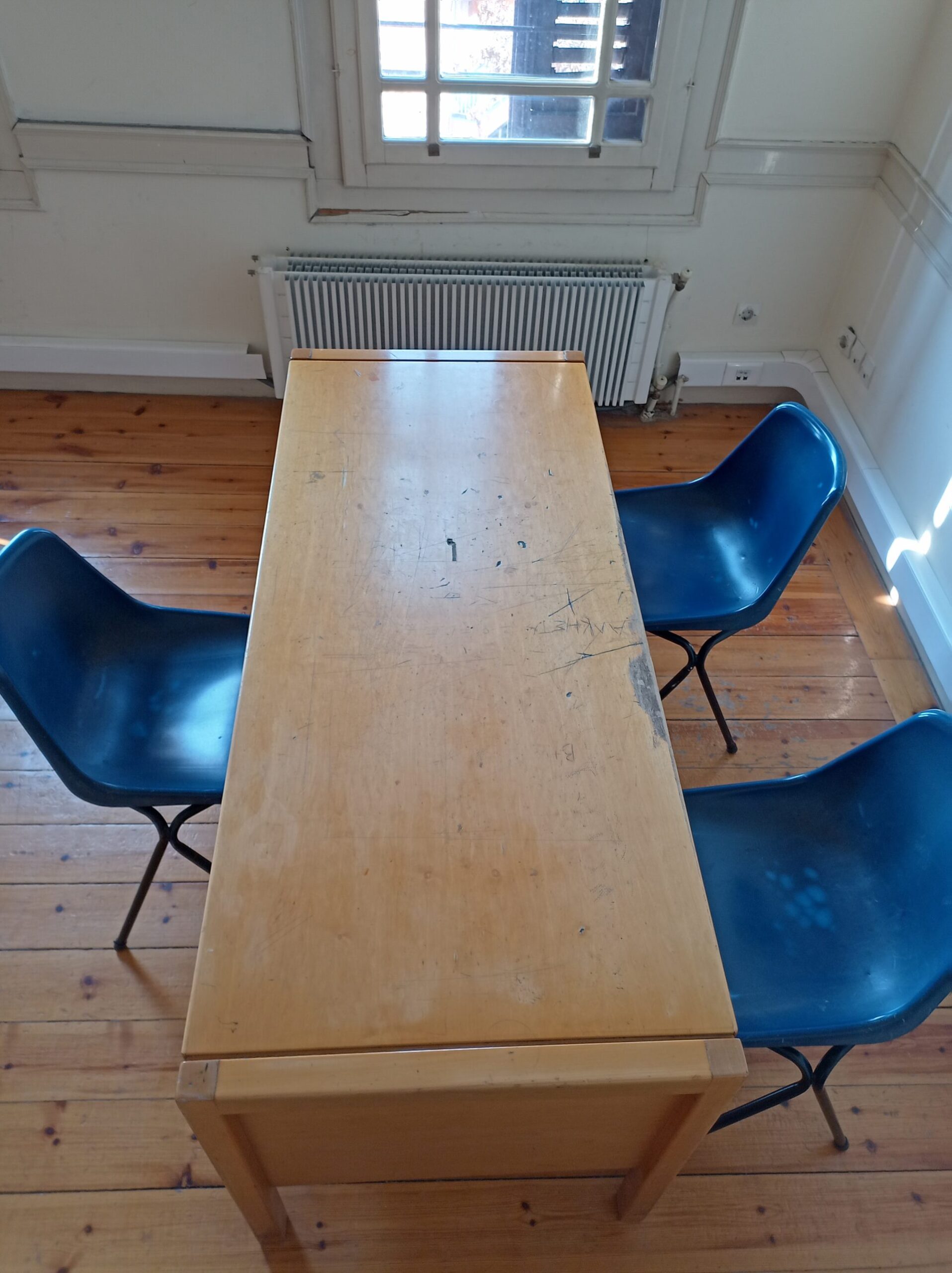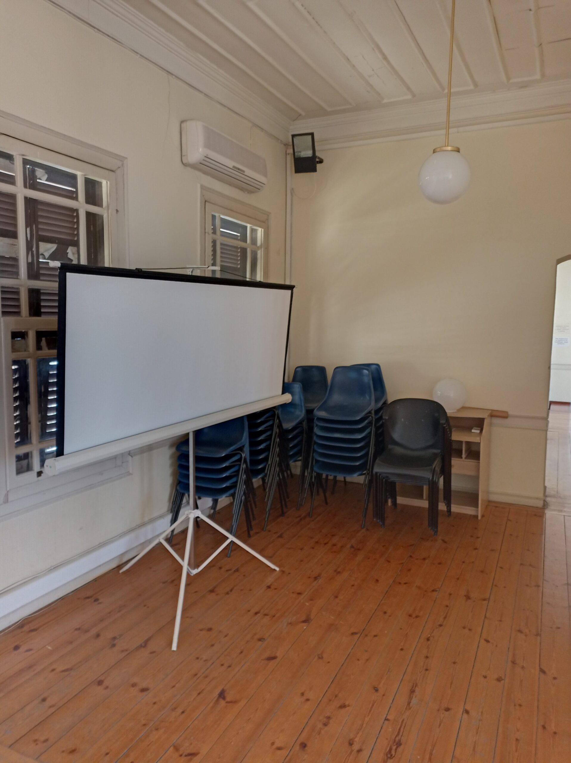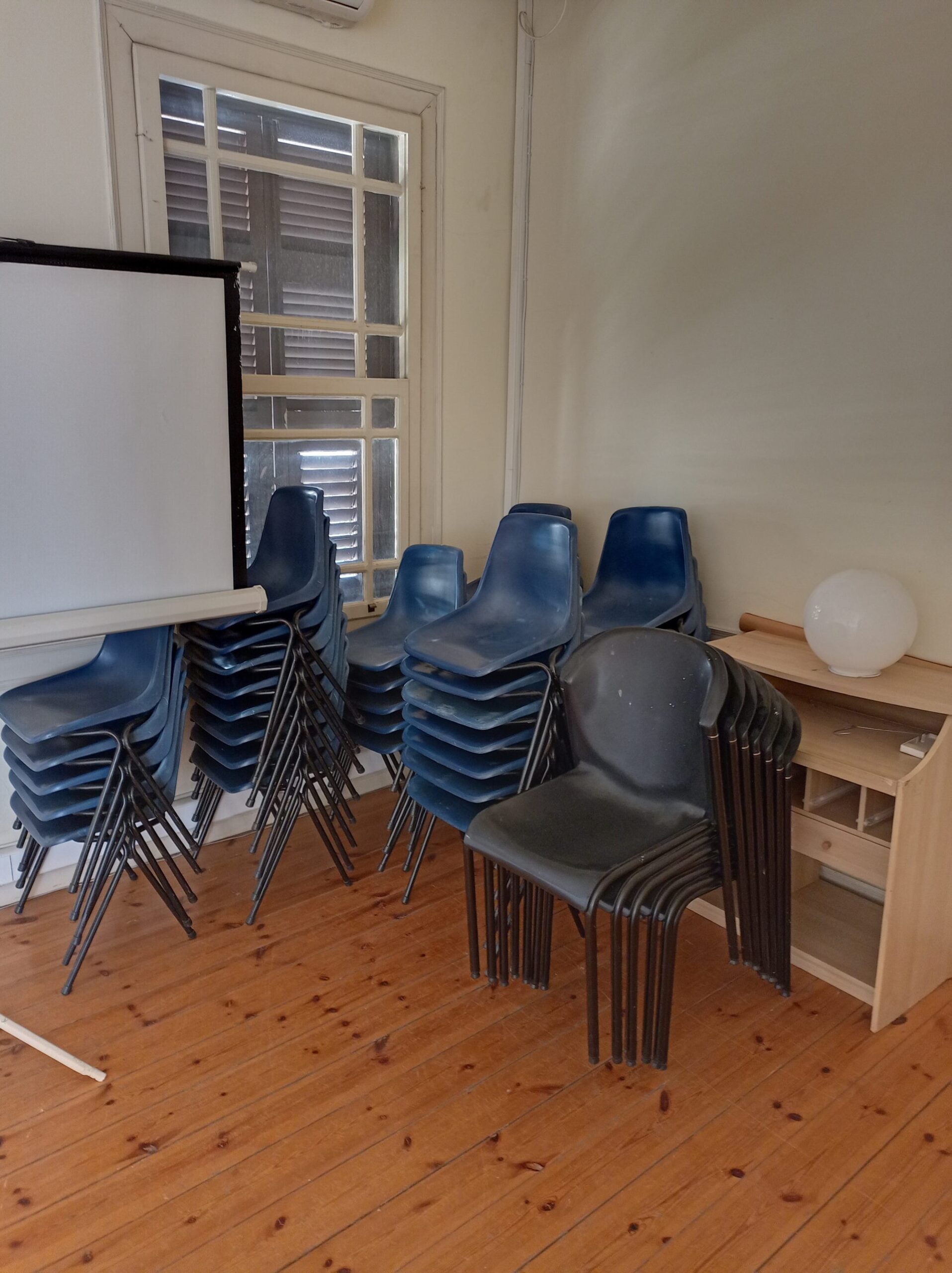 Υλικοτεχνικός εξοπλισμός που έχει μείνει στο παρελθόν και είναι σε κακή κατάσταση. Με καρέκλες που παραπέμπουν σε αίθουσα φροντιστηρίου και όχι σε βιβλιοθήκης.