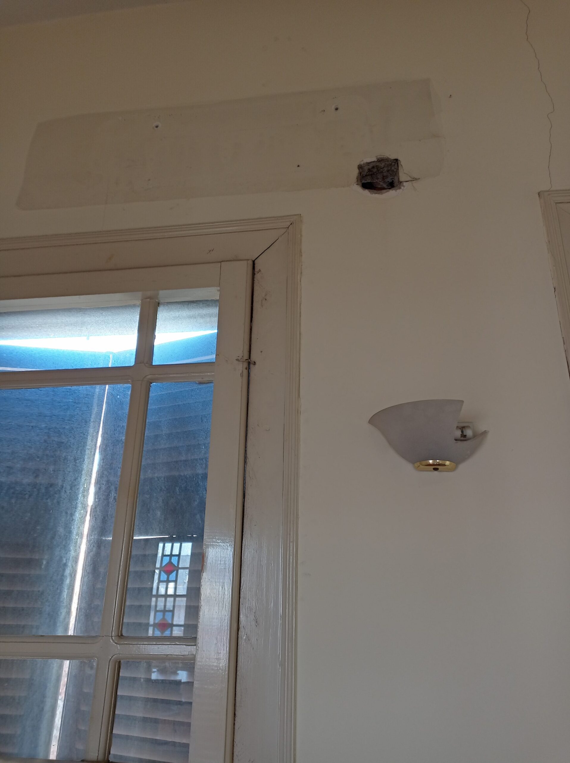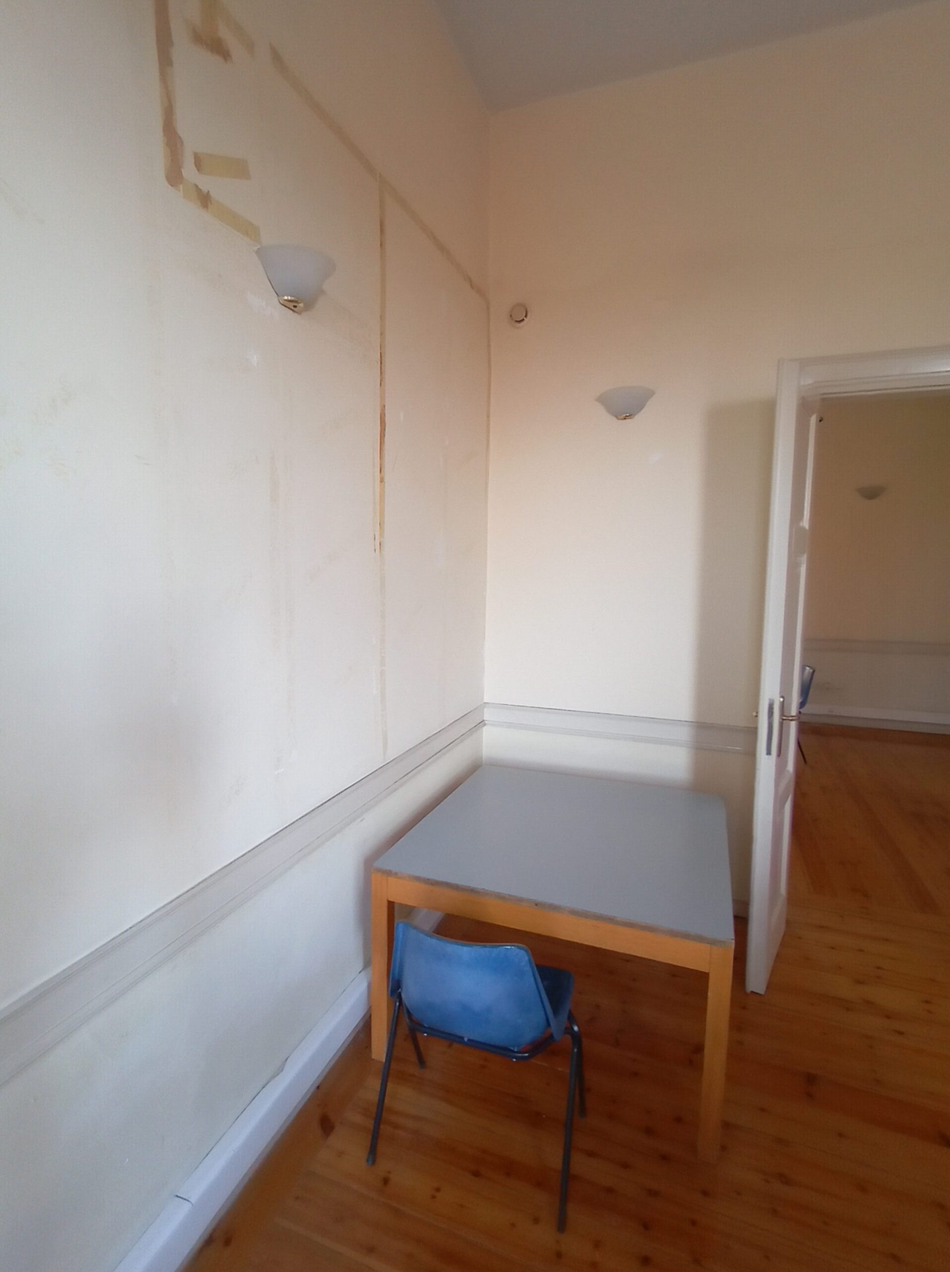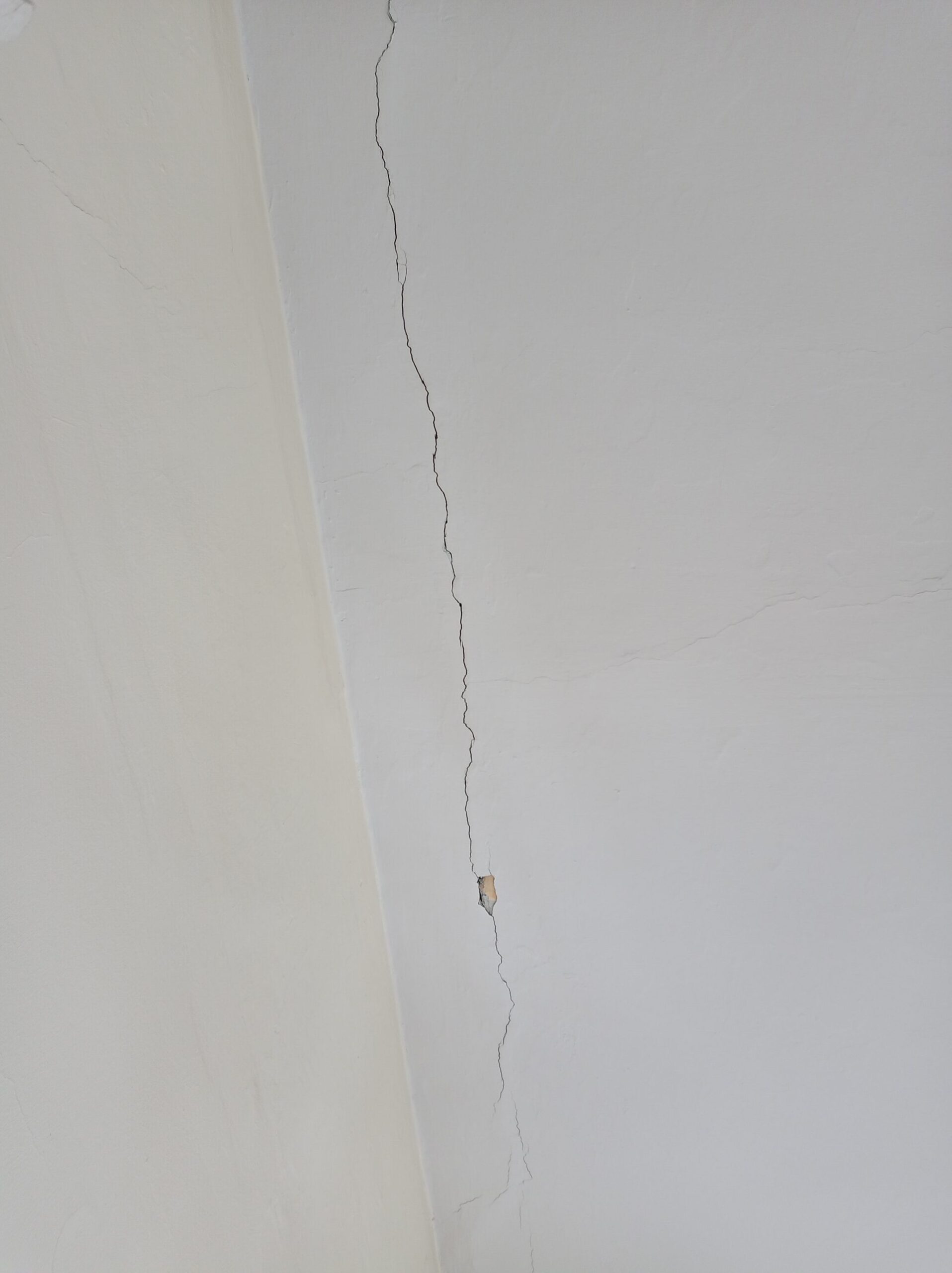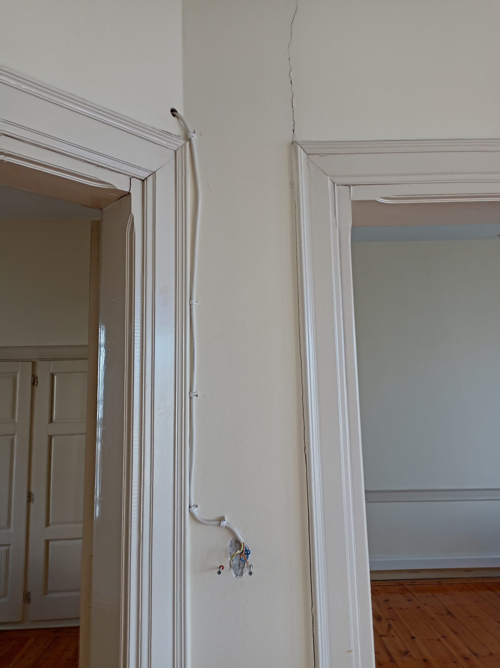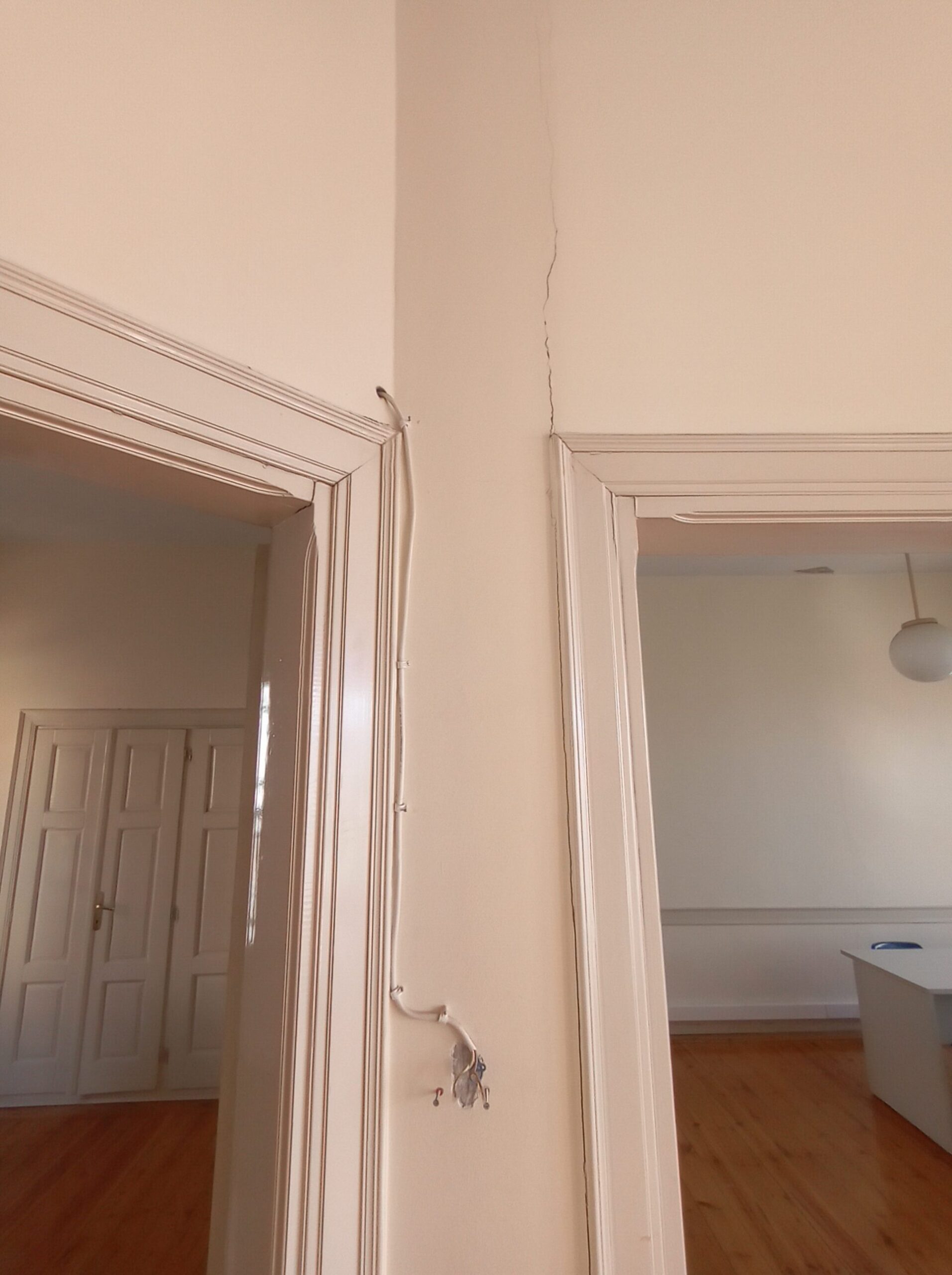 Στοιβαγμένες πόρτες, φωτιστικά, πίνακες. Καλώδια να κρέμονται από τους τοίχους και ρωγμές.