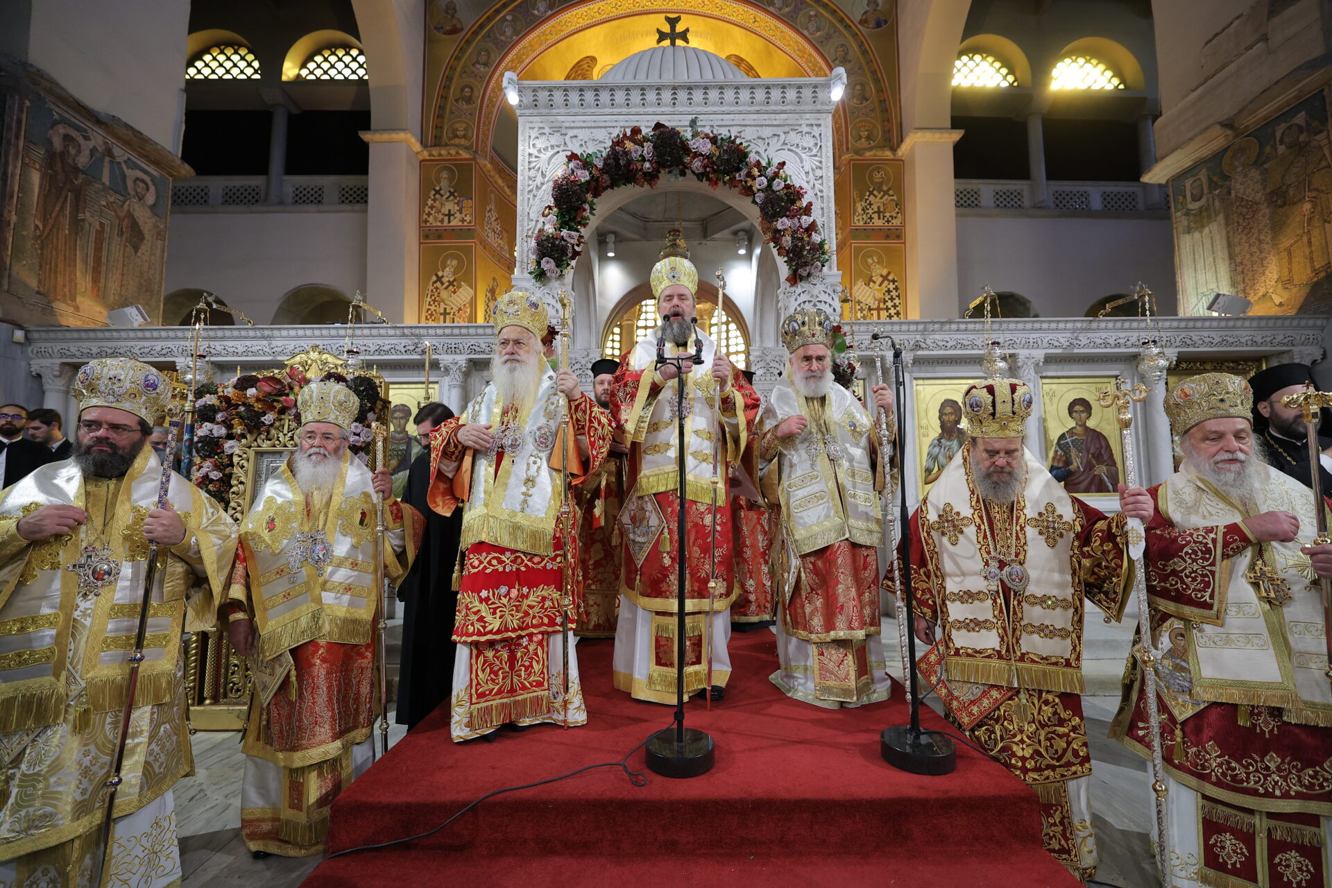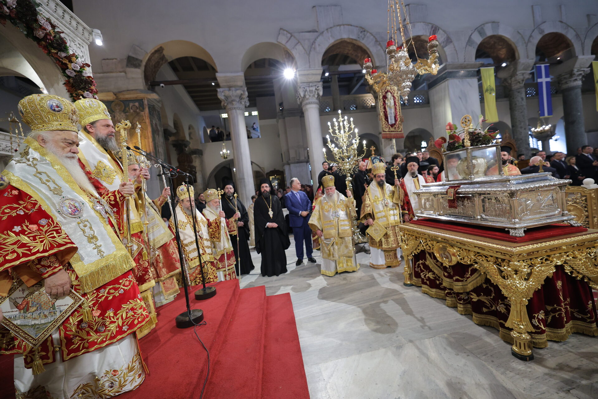 Εντός και εκτός του ιερού ναού Αγίου Δημητρίου επικρατούσε το αδιαχώρητο, καθώς τελούνταν το πολυαρχιερατικό συλλείτουργο για τον διπλό εορτασμό.