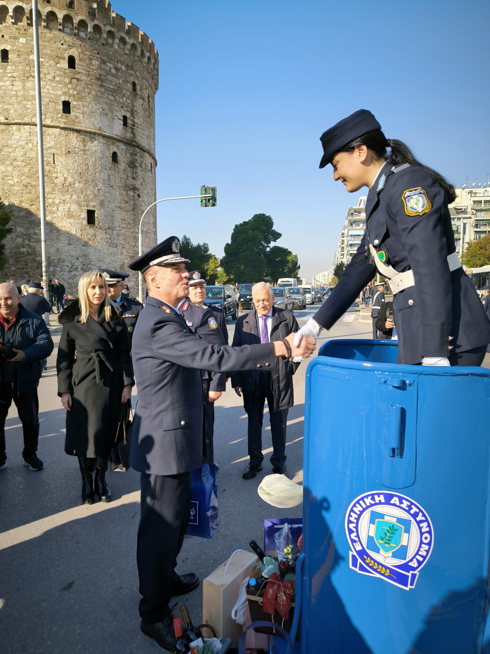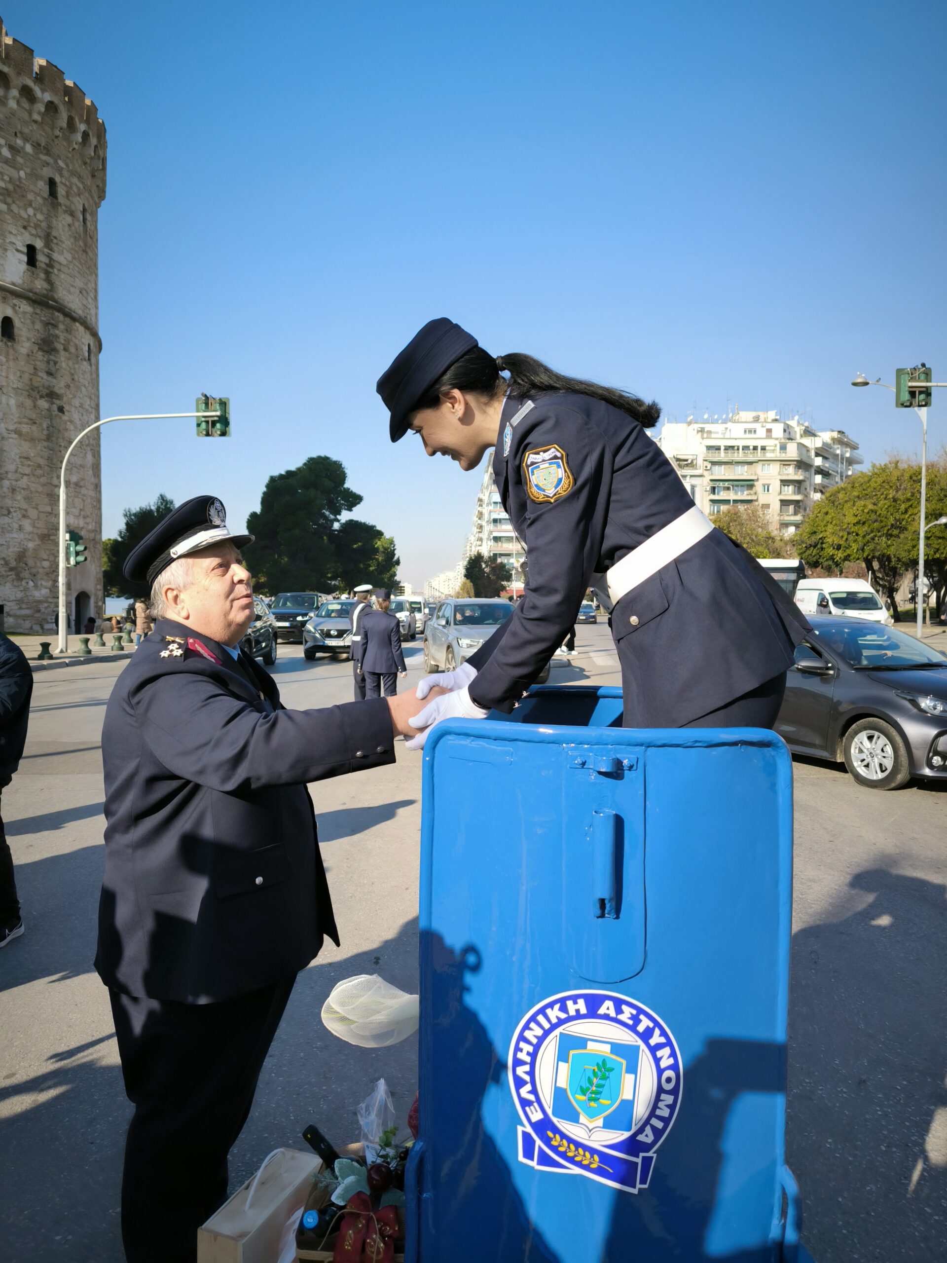 Ο Γενικός Επιθεωρητής Αστυνομίας Βορείου Ελλάδος, Αντιστράτηγος Χρήστος Μπουλούμπασης και ο Γενικός Αστυνομικός Διευθυντής Θεσσαλονίκης, Υποστράτηγος Γεώργιος Παπαδόπουλος, αντάλλαξαν ευχές και προσέφεραν εθιμοτυπικά δώρα στο ρυθμιστή τροχονόμο της Διεύθυνσης Τροχαίας Θεσσαλονίκης.