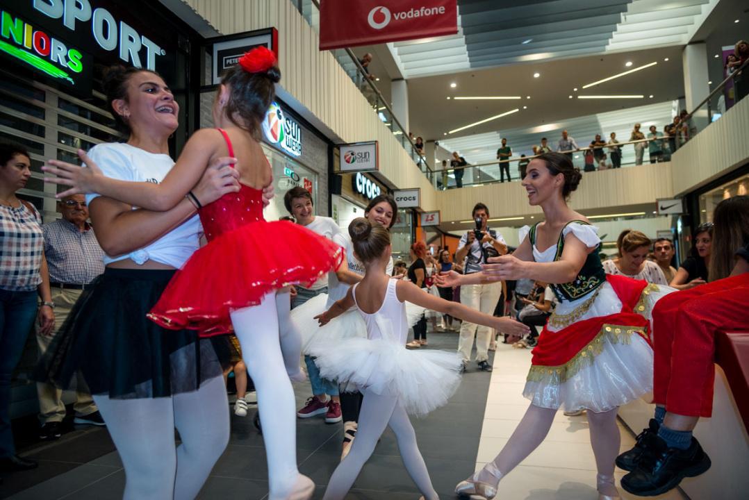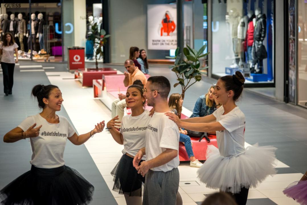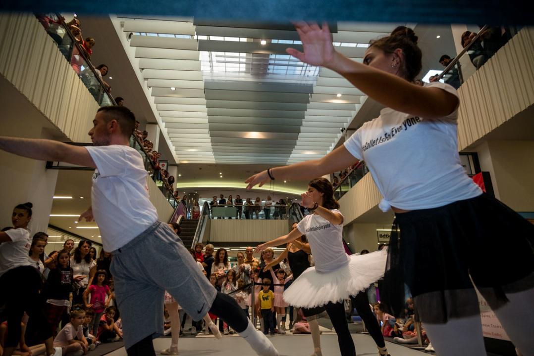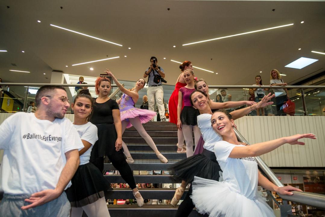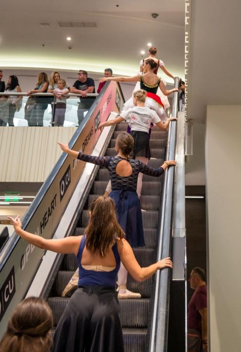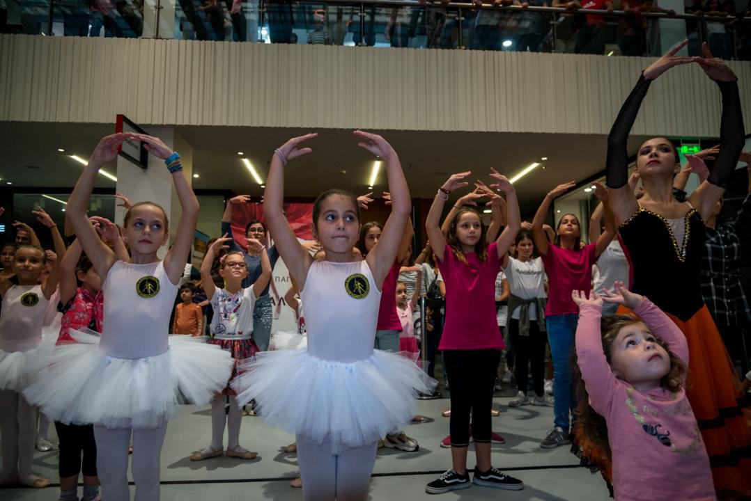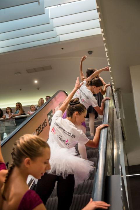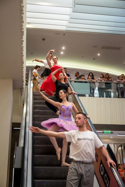 Στο πλαίσιο του εορτασμού της Παγκόσμιας Ημέρας Μπαλέτου, οι νεαροί χορευτές άρχισαν να κατεβαίνουν από τις σκάλες του εμπορικού αφήνοντας έκπληκτους του παρευρισκόμενους.