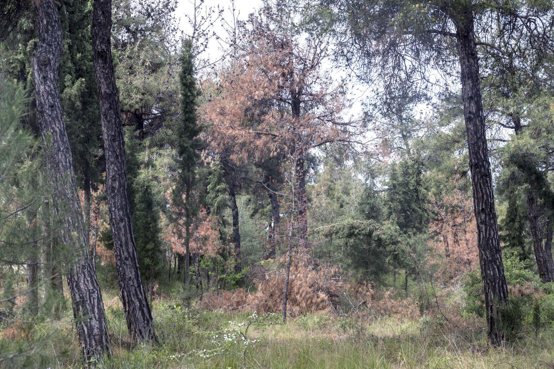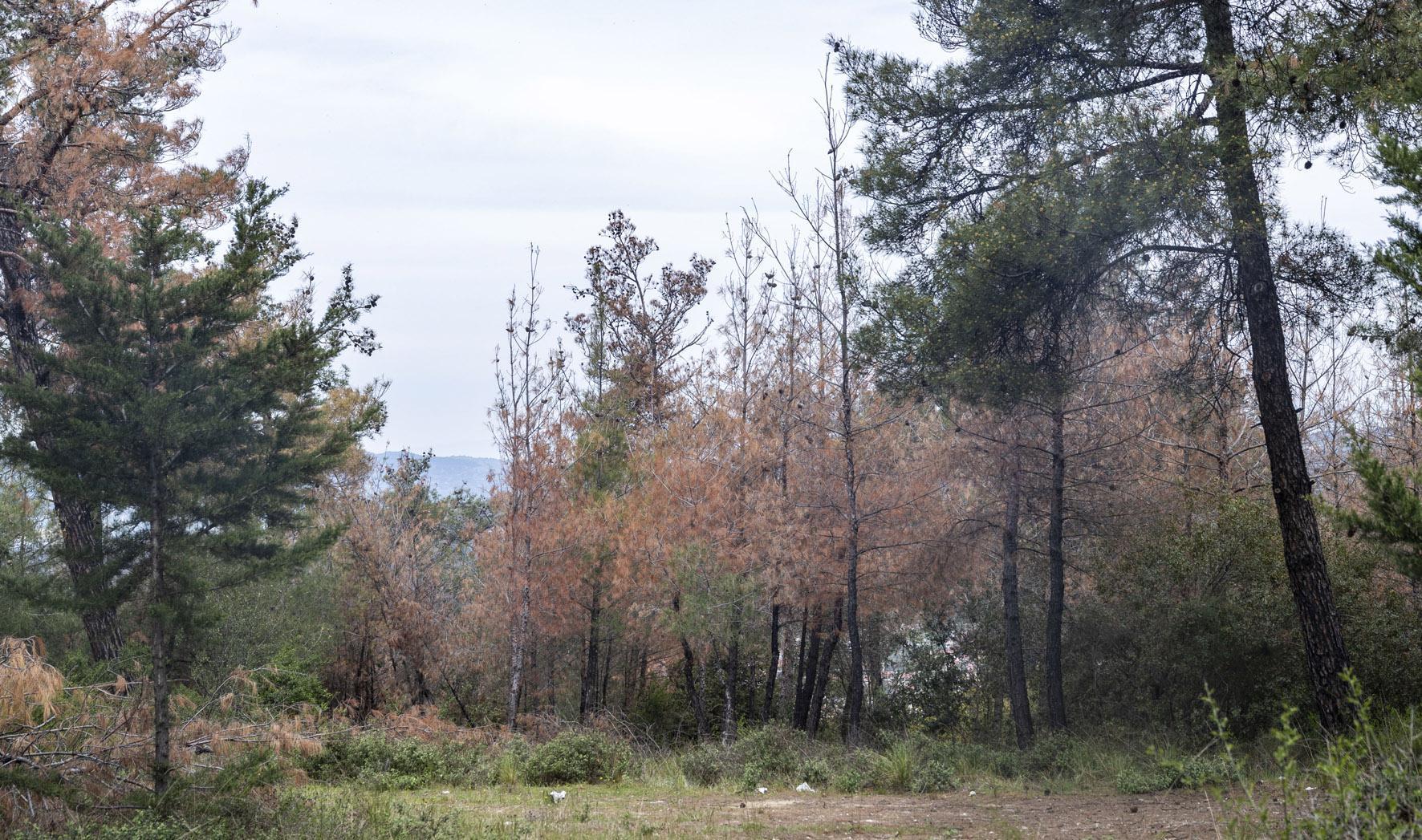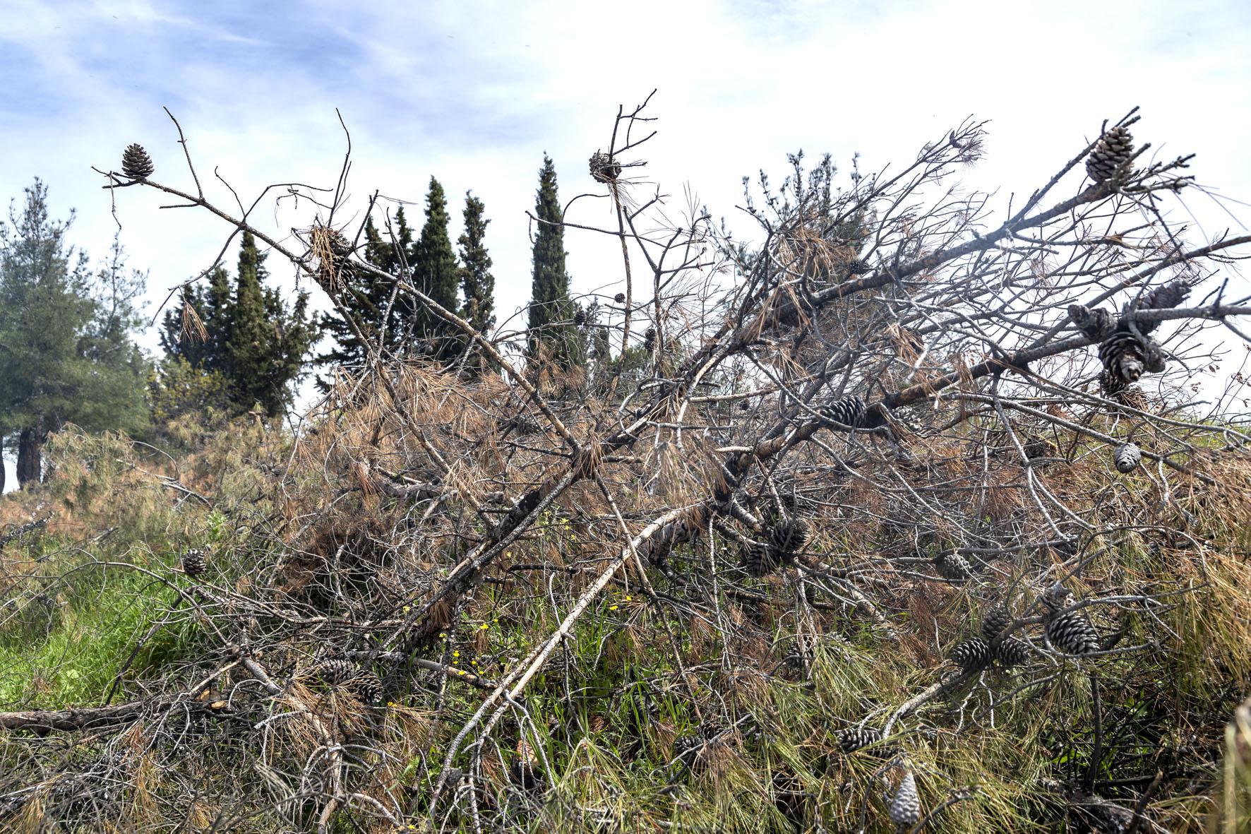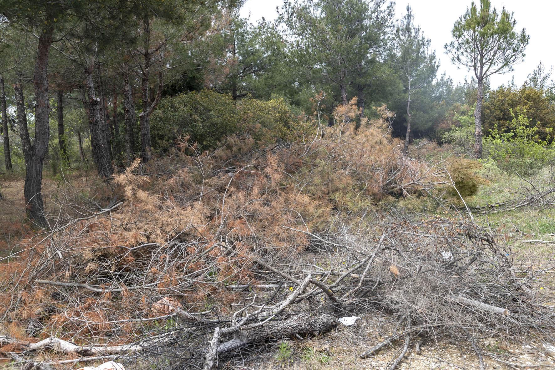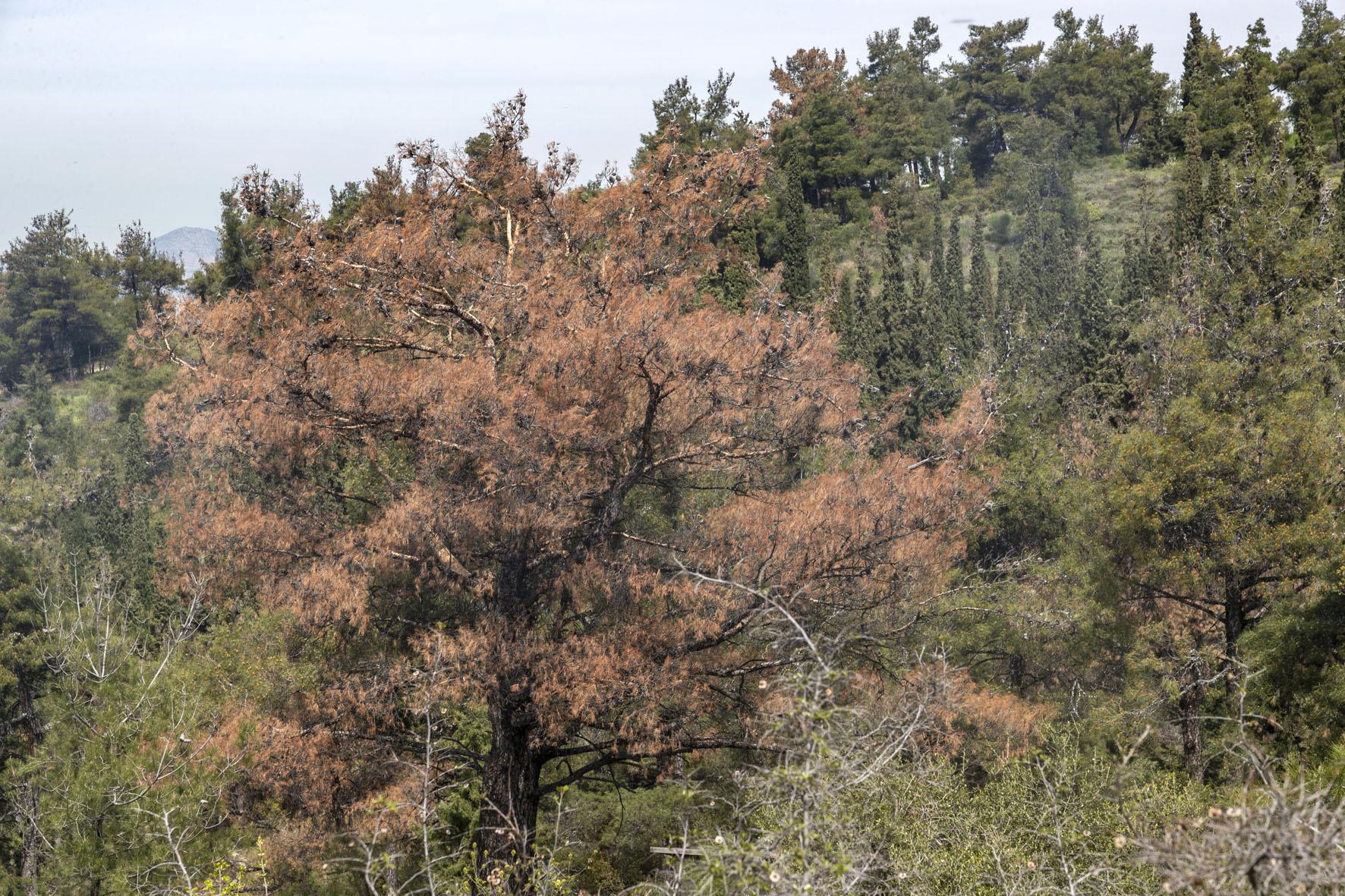Τεμαχισμένοι κορμοί στοιβαγμένοι σε ατελείωτες σειρές, αποξηραμένα κομμένα κλαδιά, παχιά στρώματα πευκοβελόνας, που αποτελούν ένα επικίνδυνο κράμα έτοιμο να… εκραγεί με την άνοδο της θερμοκρασίας ενόψει του καλοκαιριού, αλλά κυρίως νεαρά δένδρα αποξηραμένα πλέον από το καταστροφικό έντομο του φλοιοφάγου ή βλαστοφάγου (Tomicus piniperda) στην καρδιά τους δάσους, ακόμη και σε εκτάσεις που είχαν υλοτομηθεί, είναι τα στοιχεία που συνθέτουν τη θλιβερή εικόνα της εξελισσόμενης καταστροφής του περιαστικού δάσους της Θεσσαλονίκης Σέιχ-Σου.