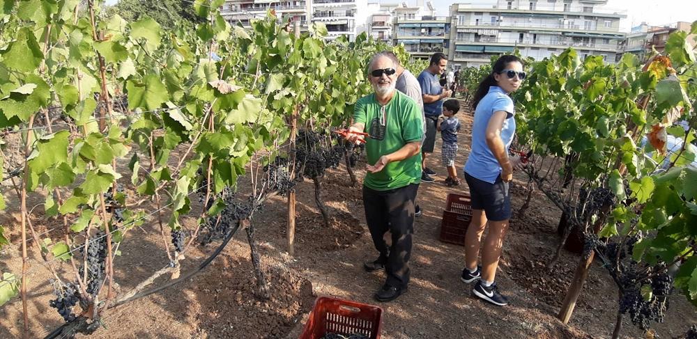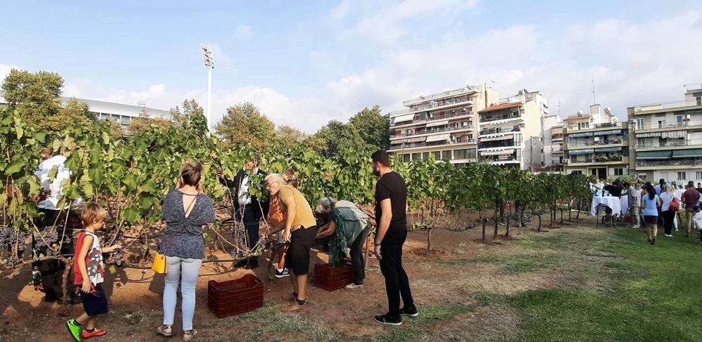 Με κλαδευτήρια στα χέρια μικροί και μεγάλοι δημότες συμμετείχαν το απόγευμα στη γιορτή του τρύγου στον αστικό αμπελώνα της Θεσσαλονίκης, που βρίσκεται στο χώρο του παλιού μηχανουργείου, στην οδό Αγίου Δημητρίου, απέναντι από το Καυταντζόγλειο στάδιο.