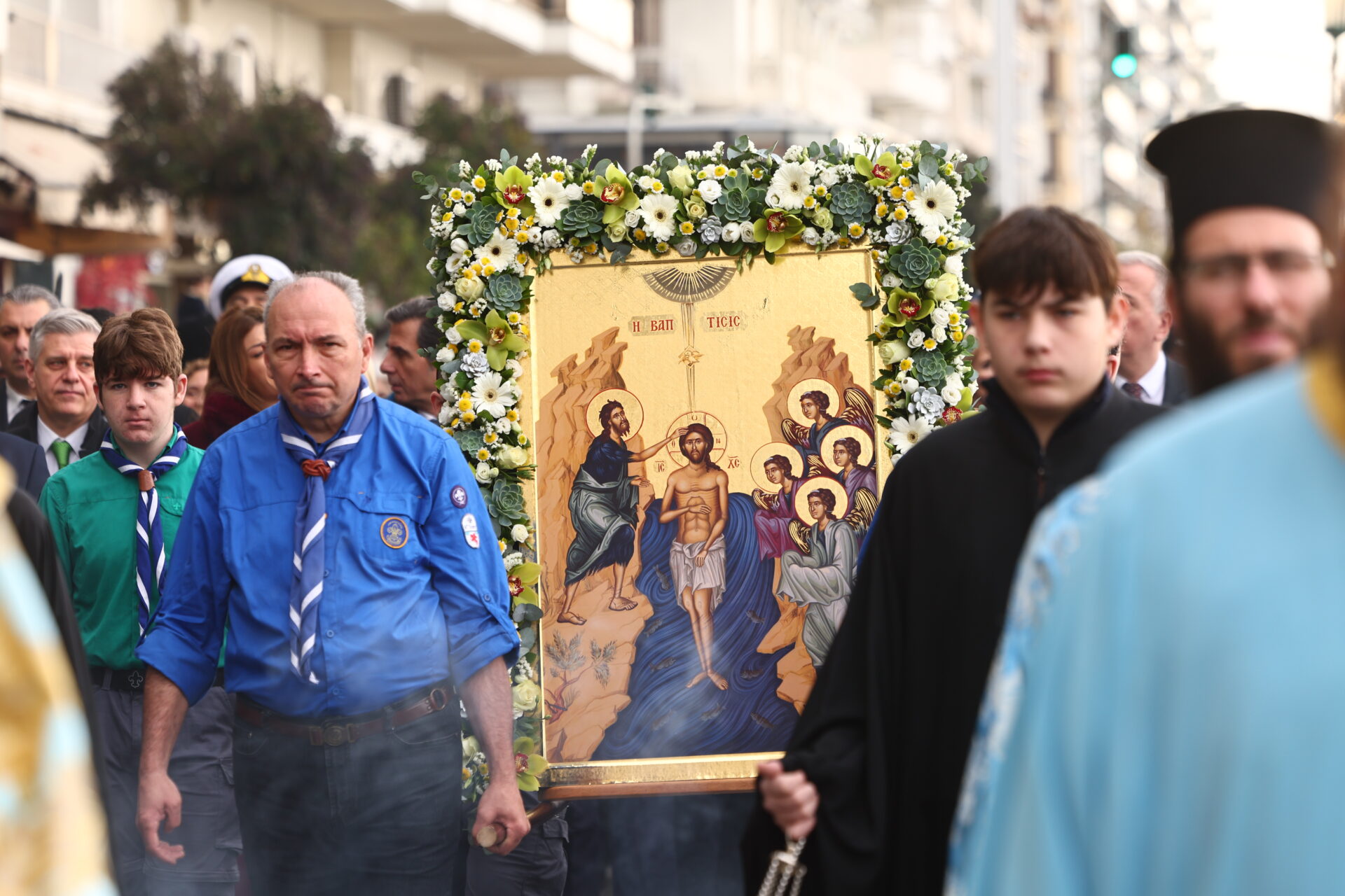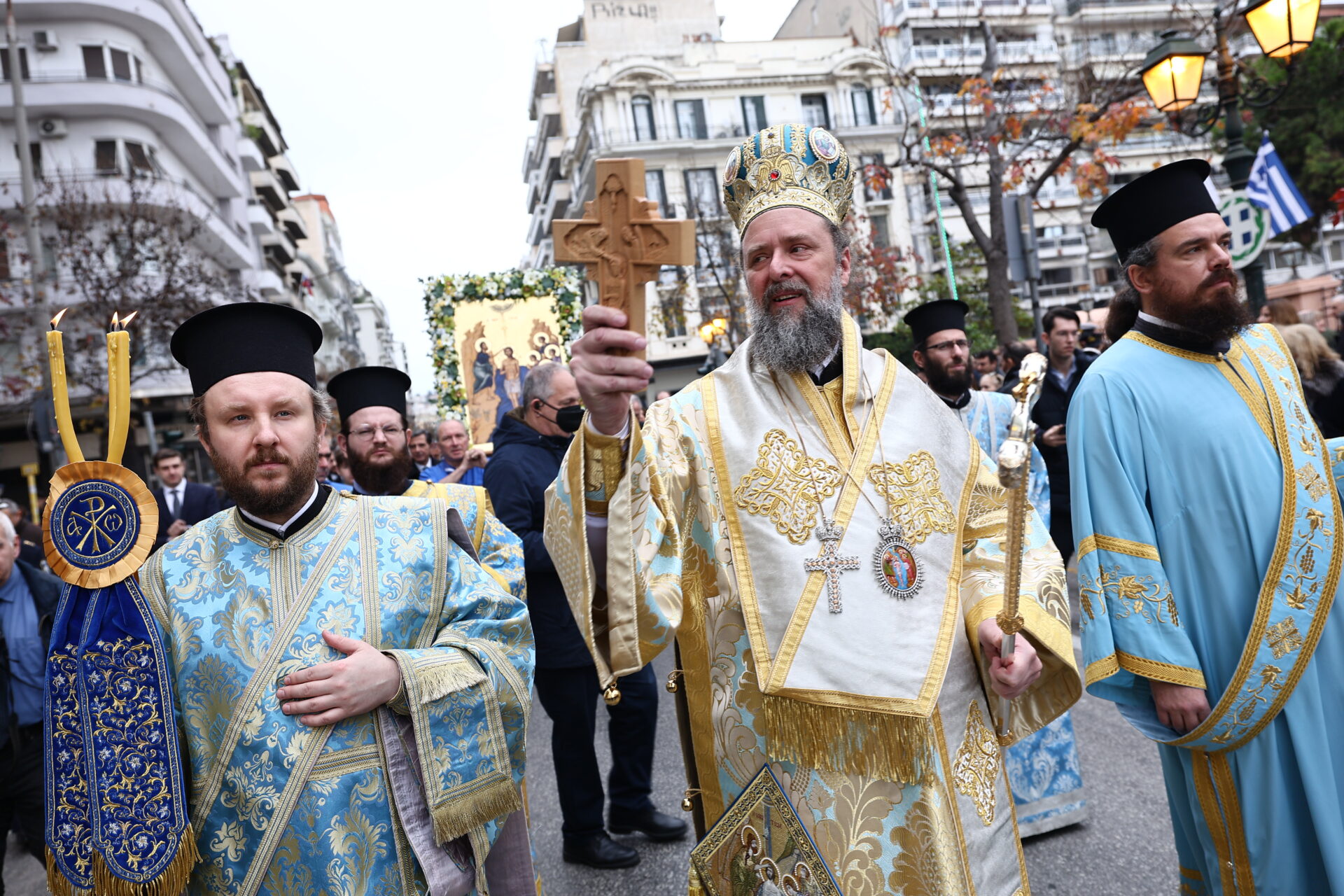 Αμέσως μετά, έγινε η λιτάνευση των εικόνων στο κέντρο της πόλης και μέσω της Λεωφόρου Νίκης οι τρεις ενορίες κατευθύνθηκαν στο λιμάνι όπου έγινε η ρίψη του Τιμίου Σταυρού.