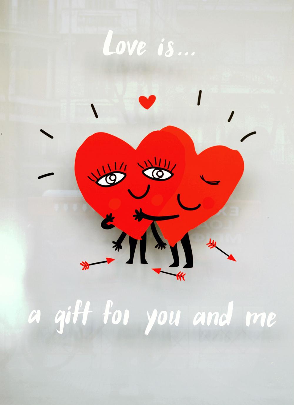 Βιτρίνες με λουλούδια, γλυκά και δώρα για τους ερωτευμένους.