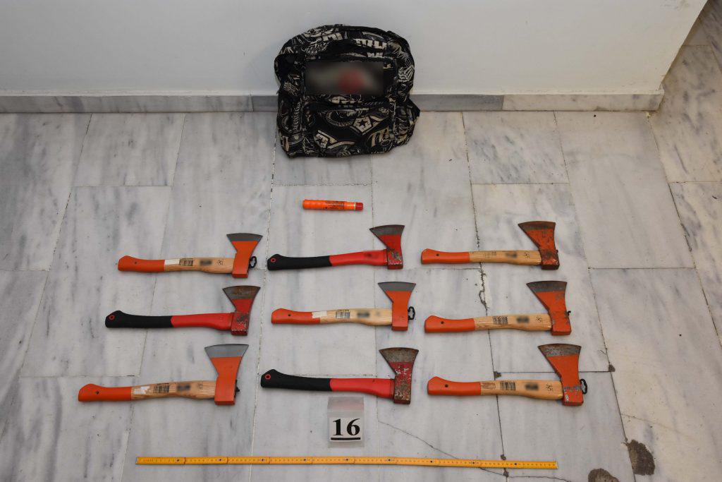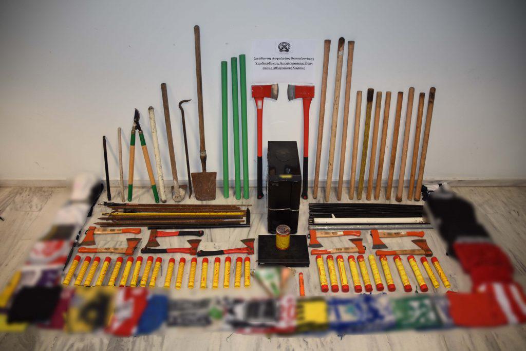 Από οίκημα στην περιοχή Χαριλάου: (16) σιδερένιες βέργες, (11) τσεκούρια, (17) ξύλινα – πλαστικά αντικείμενα (ρόπαλα), (4) εργαλεία χειρός (τσάπα κ.α.), (30) βεγγαλικά – καπνογόνα, (1) μονάδα υπολογιστή και καταγραφικό, καθώς και Πανό, φανέλες, κασκόλ κ.α. που έφεραν διακριτικά διαφόρων ομάδων.
