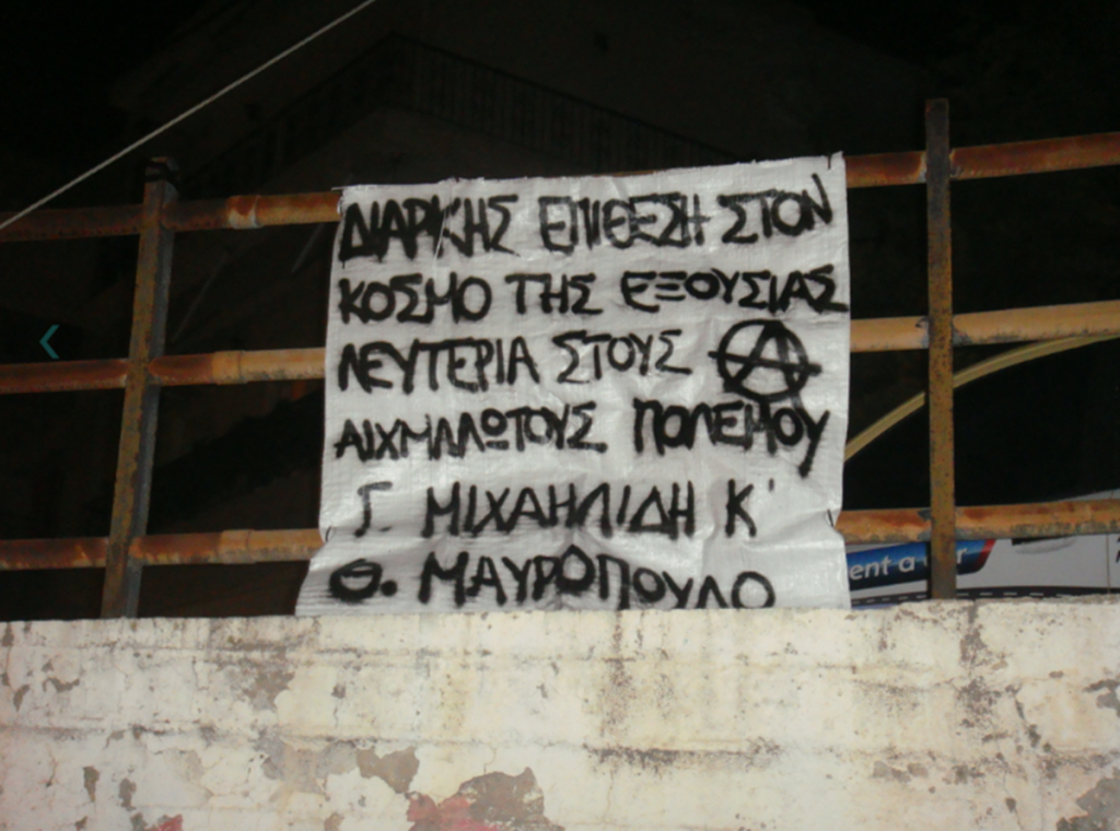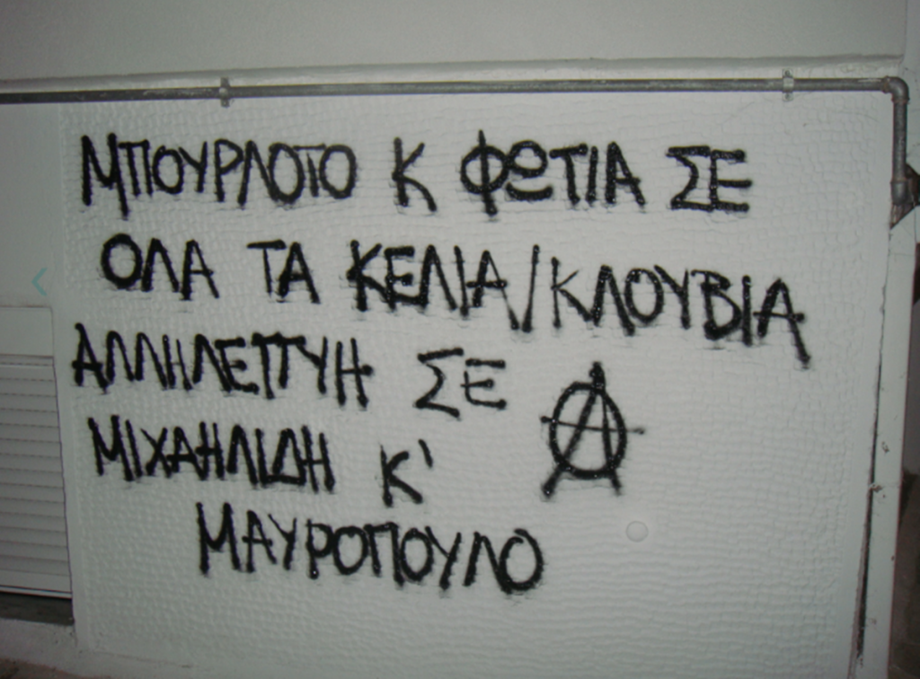 Σύμφωνα με κείμενο που αναρτήθηκε σε γνωστή σελίδα του αντιεξουσιαστικού χώρου, οι παρεμβάσεις έγιναν σε αλληλεγγύη για “για τους αιχμαλώτους πολέμου Γ. Μιχαηλίδη και Θ. Μαυρόπουλο” όπως χαρακτηριστικά αναγράφεται.