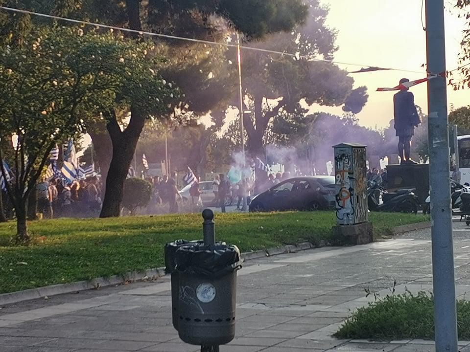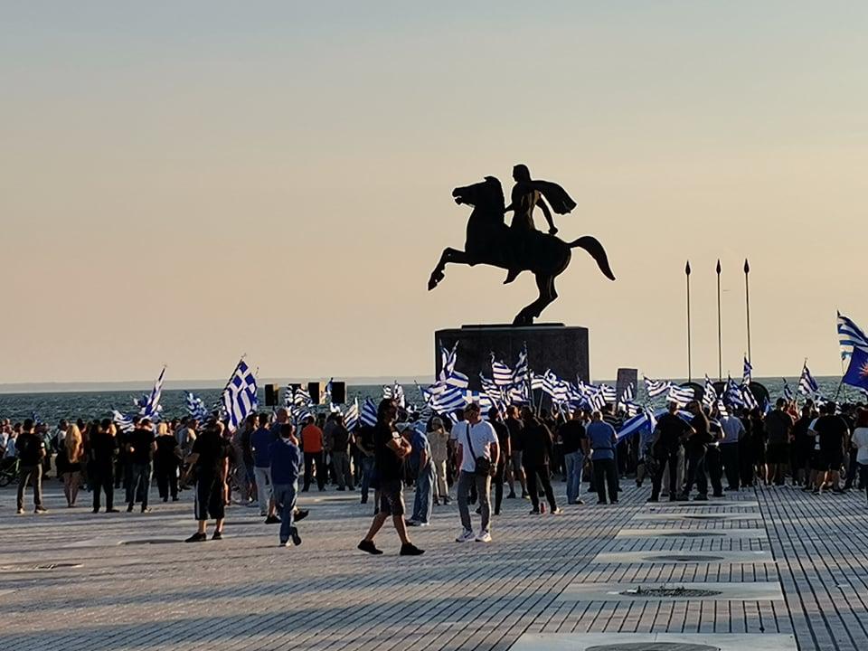 Οι παρευρισκόμενοι κρατούν ελληνικές σημαίες ενώ νωρίτερα έριξαν πυροτεχνήματα και άναψαν πυρσούς. Οι διαδηλωτές φωνάζουν συνθήματα ενώ τραγούδησαν και το «Μακεδονία Ξακουστή».