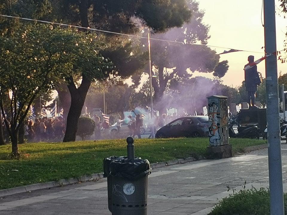 Οι παρευρισκόμενοι κρατούν ελληνικές σημαίες ενώ νωρίτερα έριξαν πυροτεχνήματα και άναψαν πυρσούς.