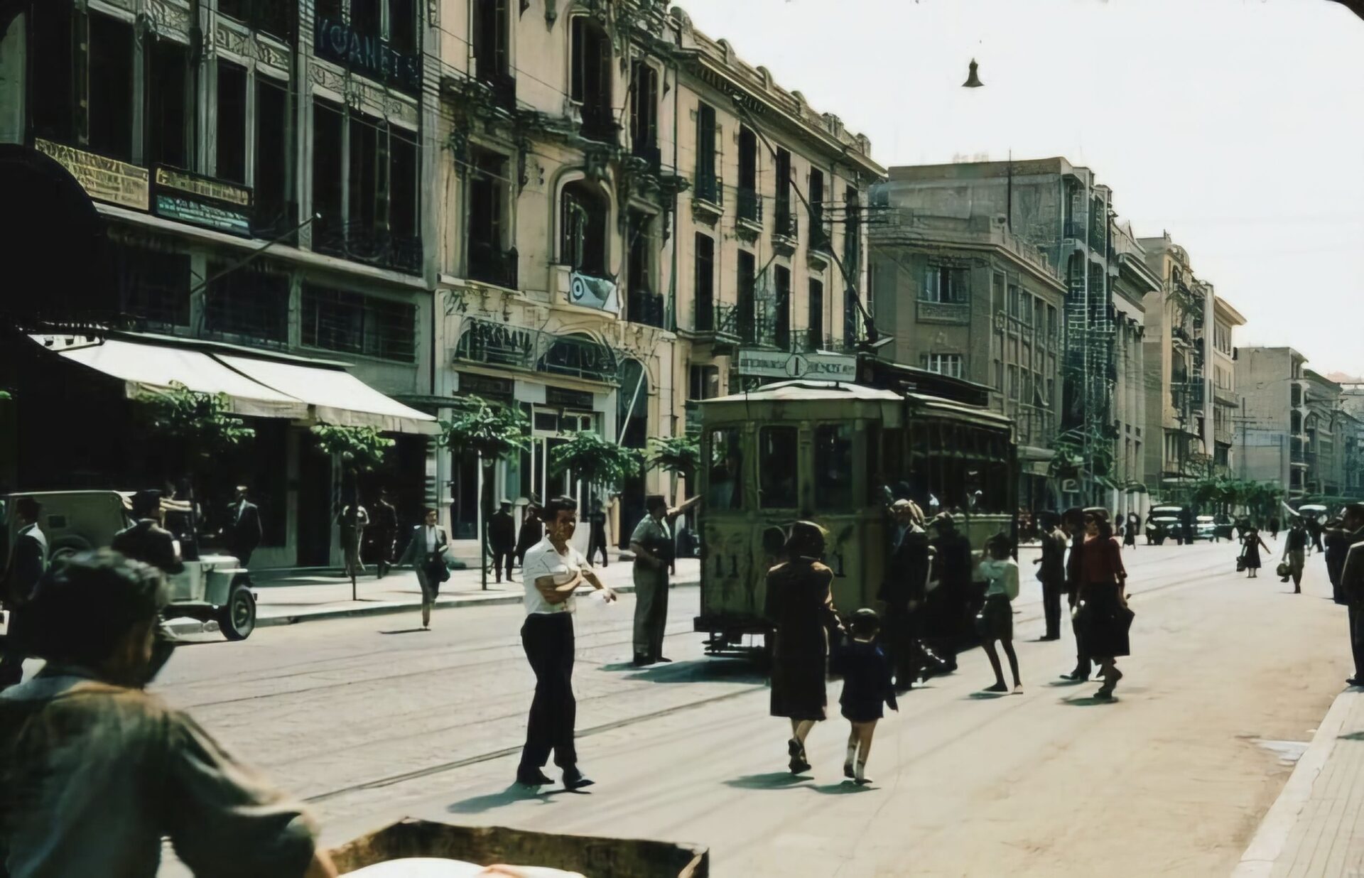 Πάνω, η φωτογραφία από τη δεκαετία του 50′ με το τραμ να περνάει ανάμεσα στους πολίτες που περπατούν επί της οδού Τσιμισκή.