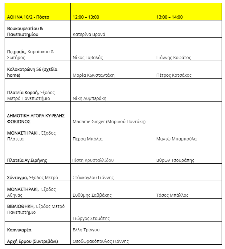 Παρακάτω θα βρείτε το πλήρες πρόγραμμα της δράσης και θα ανακαλύψετε σε ποια σημεία της Αθήνας και της Θεσσαλονίκης θα μπορέσετε να αγοράσετε το περιοδικό από έναν «έκτακτο» -από όλες τις απόψεις- διανομέα της «σχεδίας».