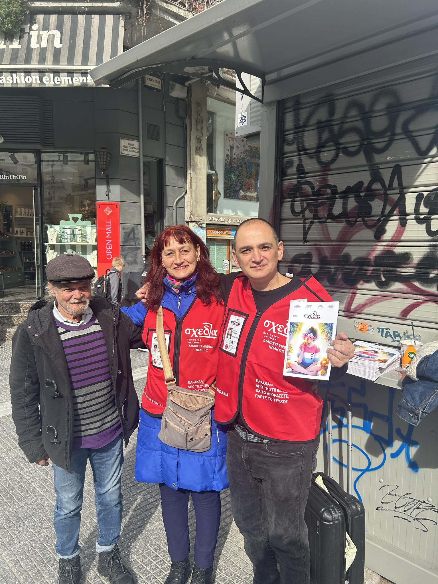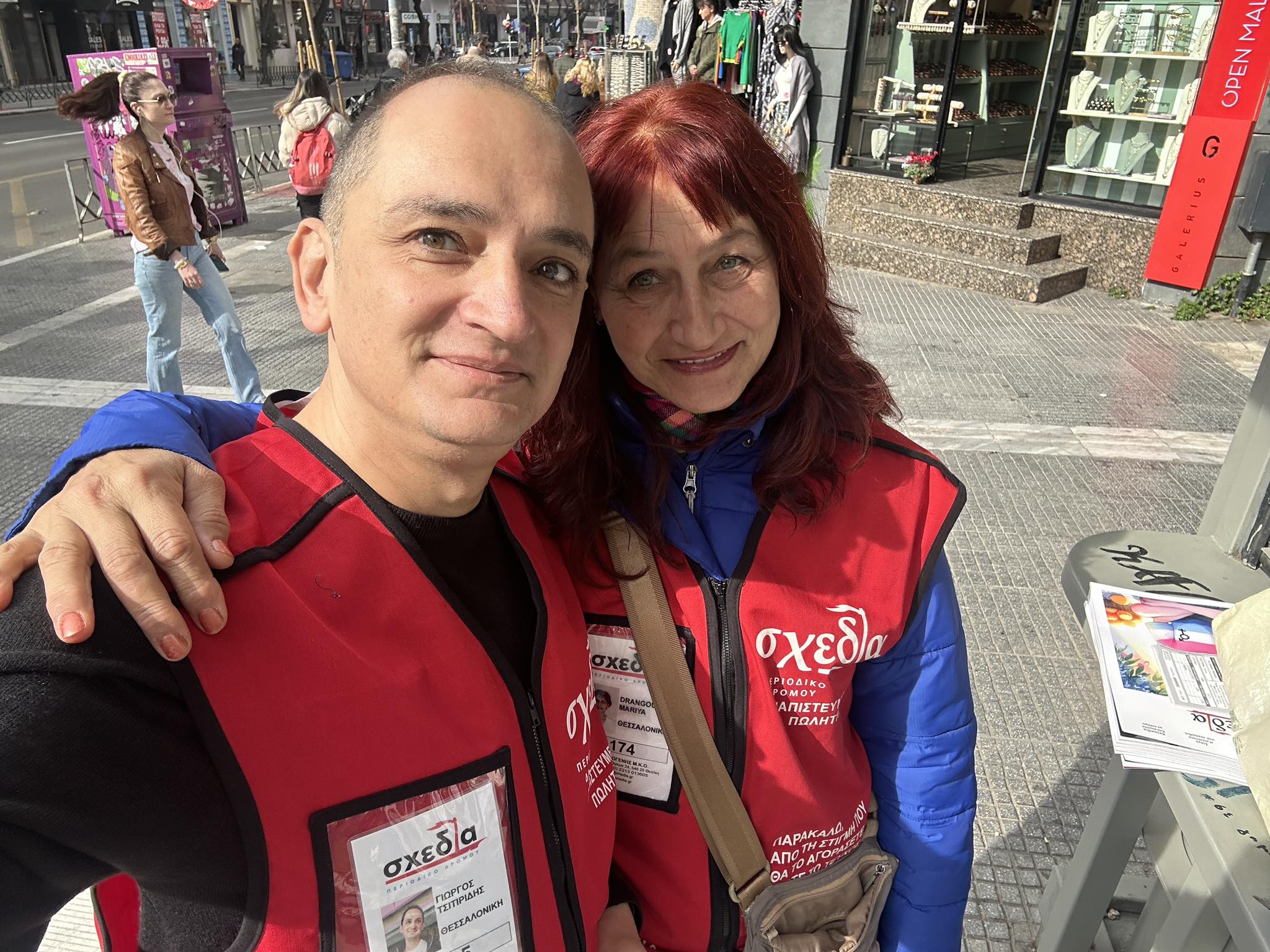 Αγαπημένοι συμπολίτες μας φορούν το κόκκινο γιλέκο του περιοδικού δρόμου «σχεδία», στέκονται απέναντι στις κοινωνικές ανισότητες και στέλνουν το δικό τους μήνυμα αλληλεγγύης και αξιοπρέπειας.