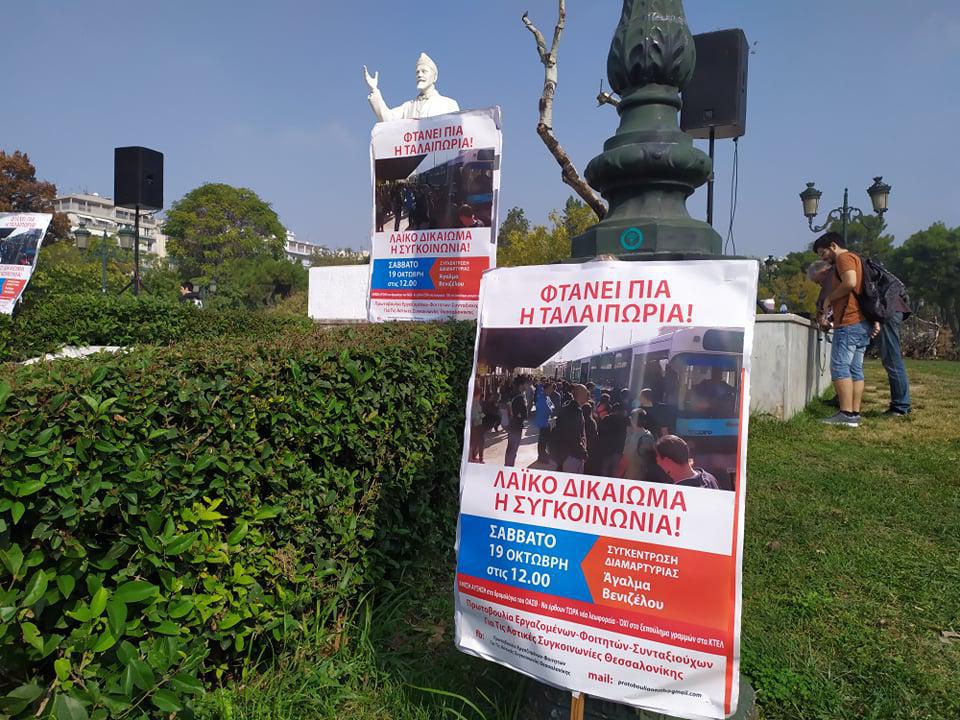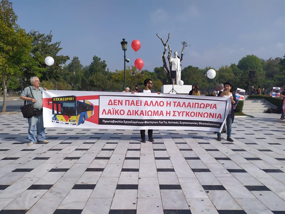Οι συμμετέχοντες στη διαμαρτυρία συγκεντρώθηκαν στο Άγαλμα του Βενιζέλου και κρατώντας πανό και φωνάζοντας συνθήματα όπως “Εδώ και τώρα νέα λεωφορεία”, “Εδώ και τώρα Μετρό”, “Φθάνει πια η ταλαιπωρία, λαϊκό δικαίωμα η συγκοινωνία” πραγματοποίησαν πορεία στις οδούς Εγνατία, Αγία Σοφίας, Τσιμισκή και στην πλατεία Αριστοτέλους.