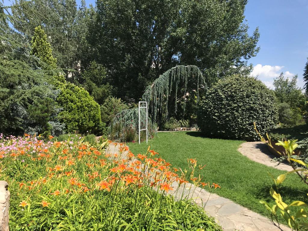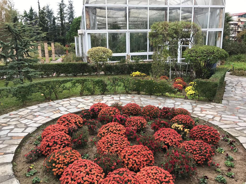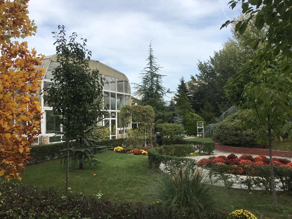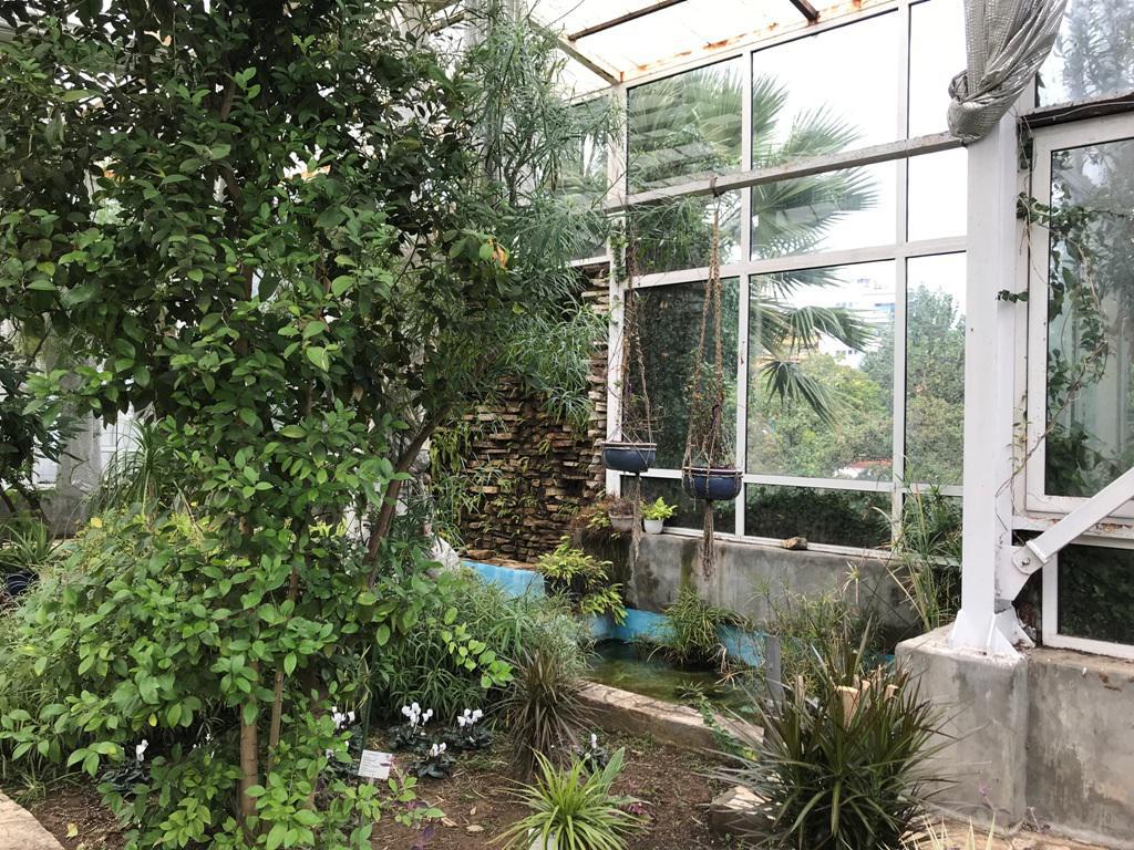 Στο κέντρο δεσπόζει το ρομαντικό κιόσκι με ποικιλίες αναρριχώμενων φυτών και το θερμοκήπιο που φιλοξενεί τροπικά, υποτροπικά, επίφυτα, υδροχαρή και σαρκοφάγα φυτά.