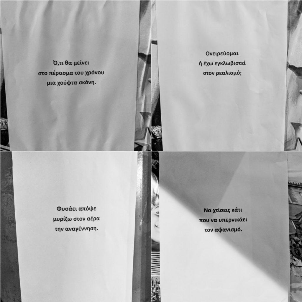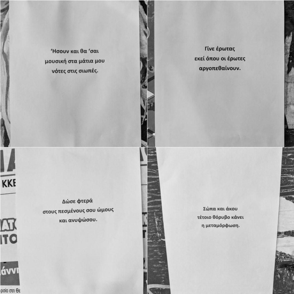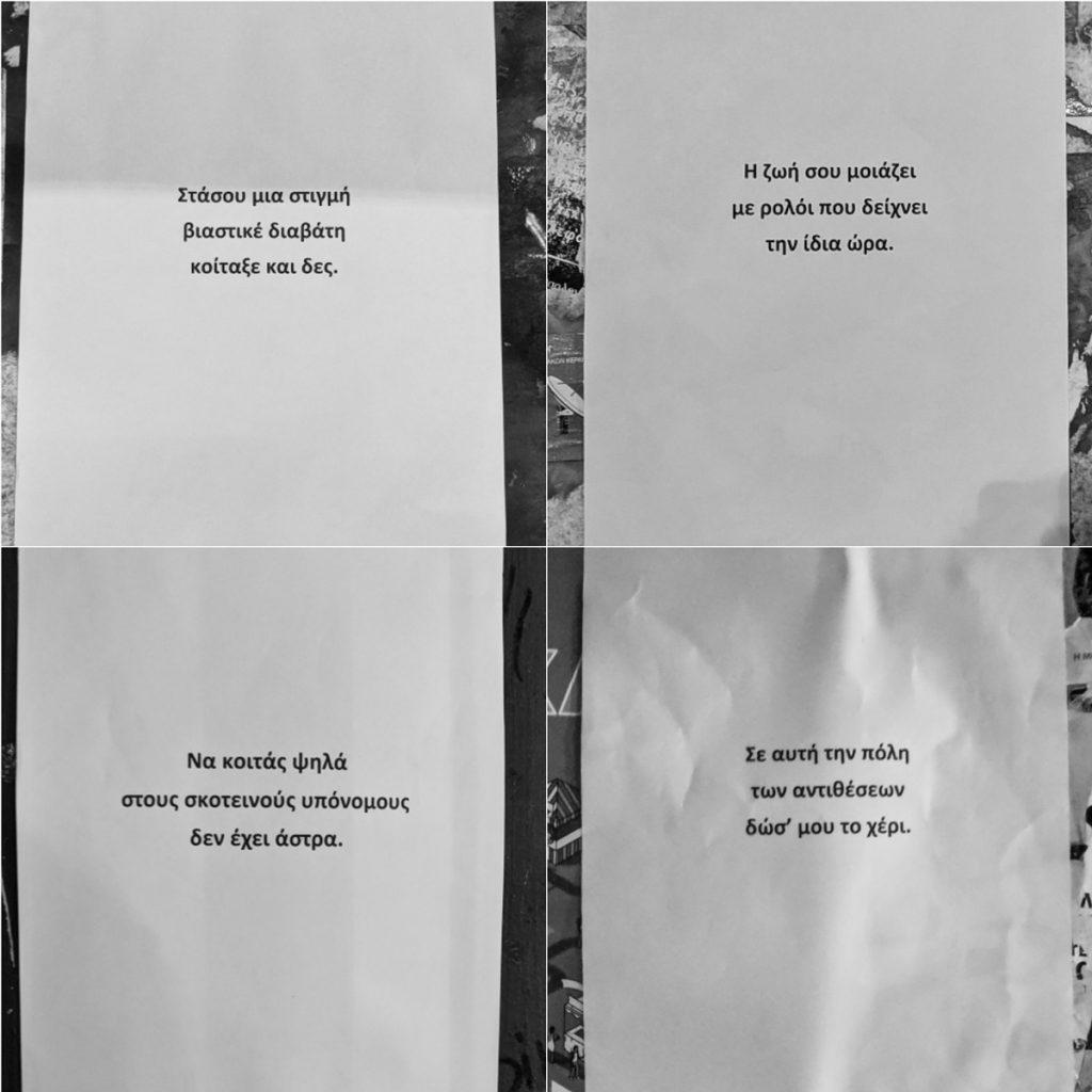 Χθες το βράδυ γέμισα το κέντρο της Θεσσαλονίκης με χαϊκού. Τριάντα από αυτά, ένα για την κάθε ημέρα του μήνα. Τα τοποθέτησα στις στάσεις των λεωφορείων, σαν μικρές αφυπνιστικές επιγραφές για κάθε διαβάτη που, χαμένος μέσα στη δίνη της καθημερινότητας, χρειάζεται ίσως ένα τράνταγμα.