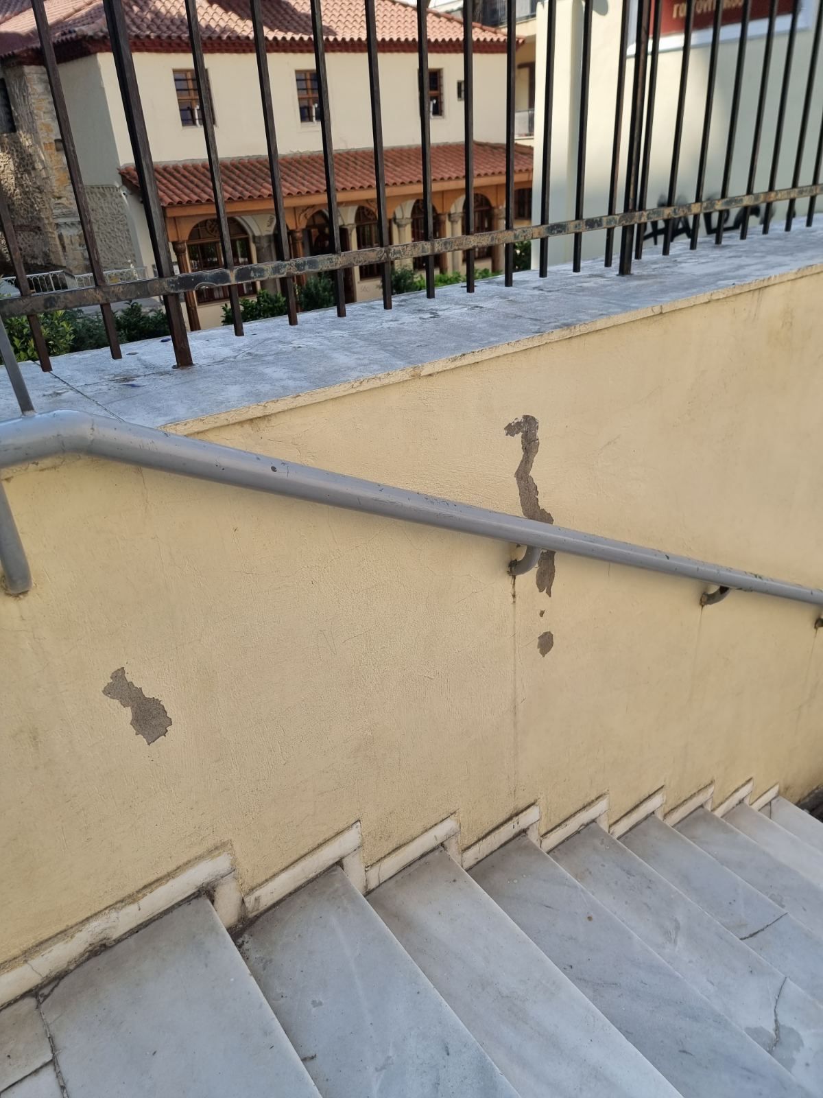 Στο εσωτερικό του σχολείου μπορεί να διορθώθηκε η ταλάντευση που εμφάνιζε η σκάλα που υπάρχει, όμως το υλικό της κατασκευής της (πλαστικό) έχει διαβρωθεί με το πέρασμα του χρόνου με αποτέλεσμα να μην είναι σταθερό, αλλά ολισθηρό.