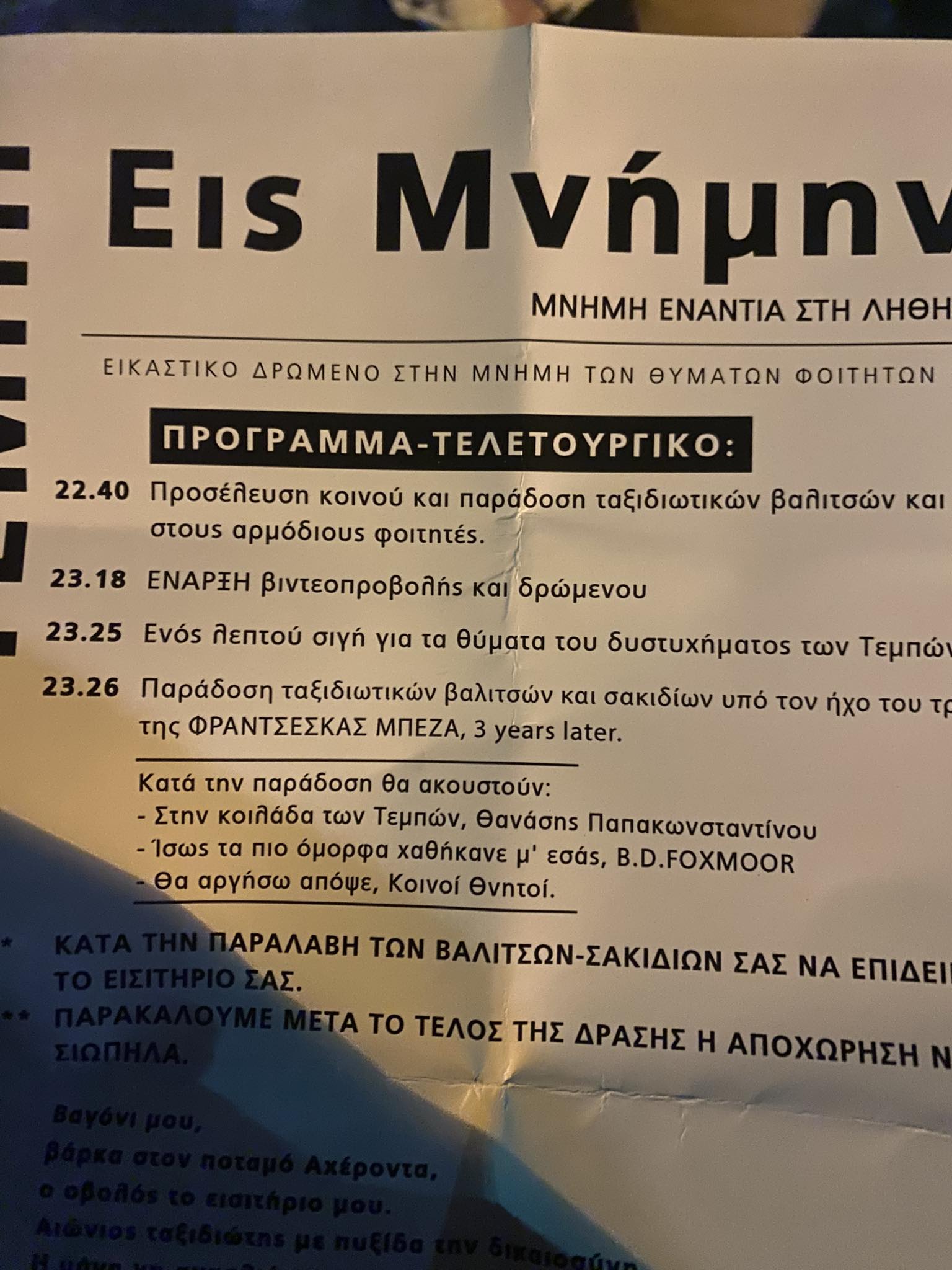 Μεταξύ των τραγουδιών που ακούστηκαν ήταν και αυτό της νεαρής φοιτήτριας που έχασε τη ζωή της ένα χρόνο πριν, ενώ ταξίδευε με το Intercity 62, Φραντσέσκας Μπέζα, “3 years later”.