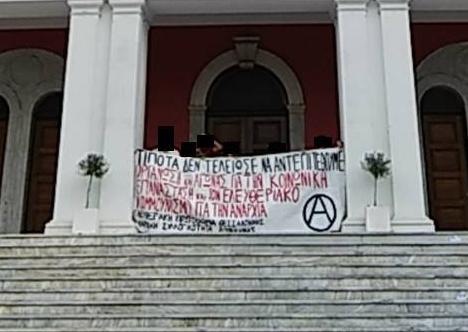 Με πανό διαμαρτυρίας και πετώντας φυλλάδια, αντιεξουσιαστές εισέβαλαν το μεσημέρι στο κτίριο του υπουργείου Μακεδονίας-Θράκης. Η ομάδα των περίπου 15 ατόμων από την “Ελευθεριακή Πρωτοβουλία Θεσσαλονίκης” και την “Αναρχική Συλλογικότητα Ρουβίκωνας”, πέρασαν στον αύλειο χώρο, μπήκαν μέσα στο κτίριο και κατάφεραν να ανοίξουν ένα πανό από το μπαλκόνι του τελευταίου ορόφου.