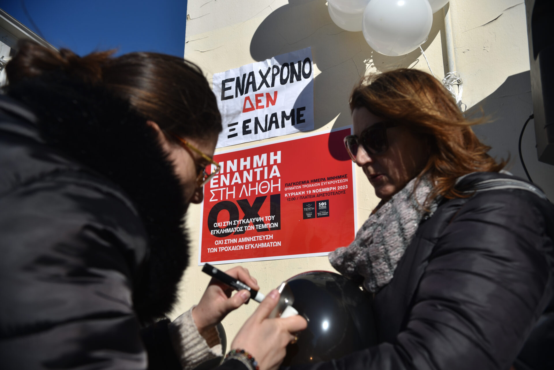 Πολίτες άφησαν μπαλόνια με τα ονόματα ανθρώπων που έχασαν τη ζωή τους στο σιδηροδρομικό δυστύχημα στα Τέμπη και στην άσφαλτο.