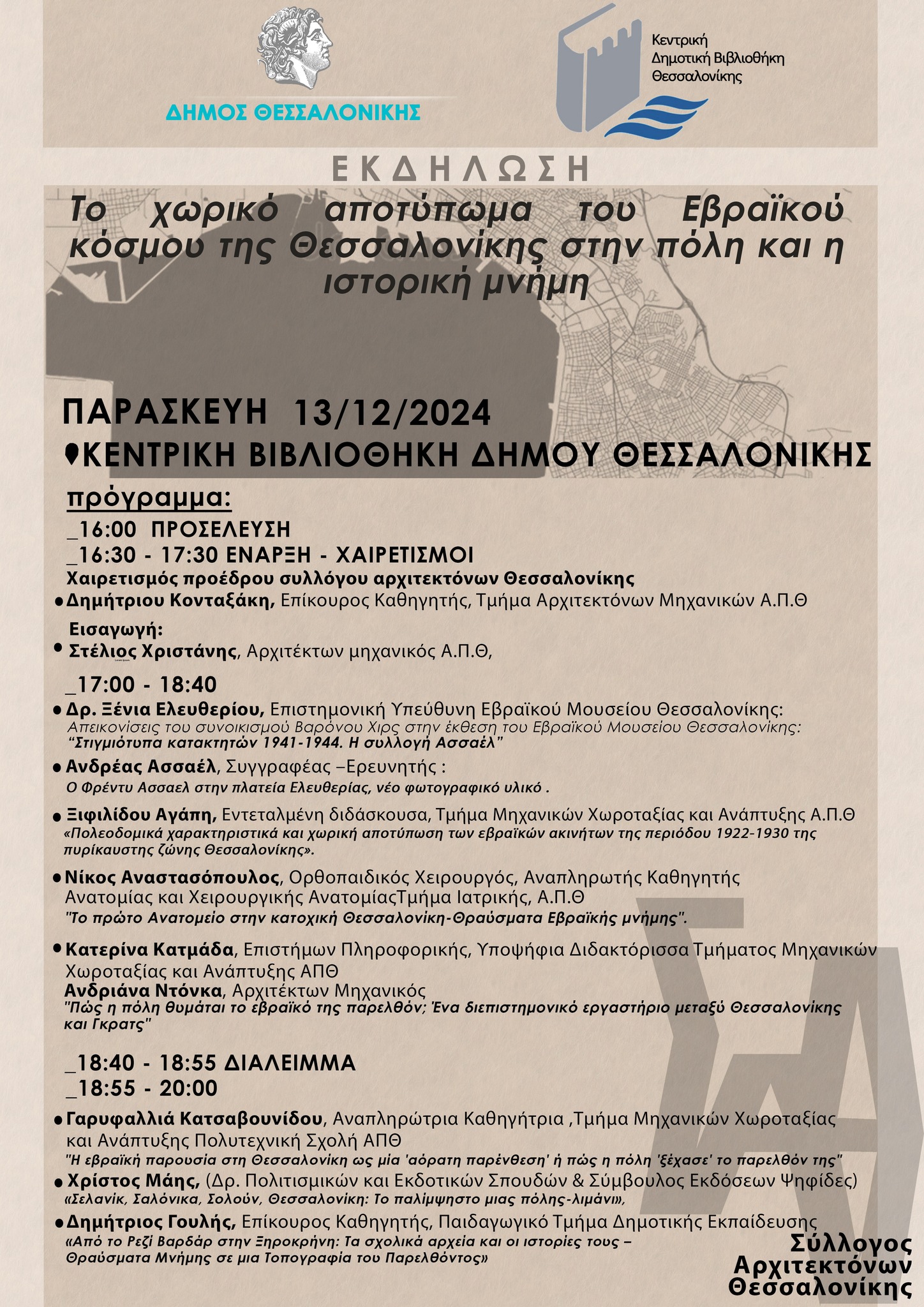 Το απόγευμα της Παρασκευής (16:00 – 20:00) είναι προγραμματισμένη στην Κεντρική Βιβλιοθήκη του Δήμου Θεσσαλονίκης (Εθνικής Αμύνης 27) η εκδήλωση του Συλλόγου Αρχιτεκτόνων Θεσσαλονίκης με θέμα: “Το Χωρικό Αποτύπωμα του Εβραϊκού Κόσμου της Θεσσαλονίκης στην πόλη και η Ιστορική Μνήμη”