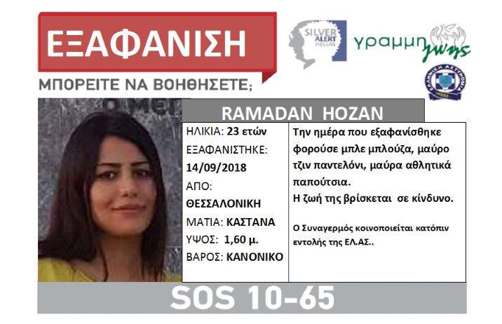 Η 23χρονη Ramadan Hozan εξαφανίστηκε στις 14 Σεπτεμβρίου 2018 στη περιοχή της Θεσσαλονίκης.